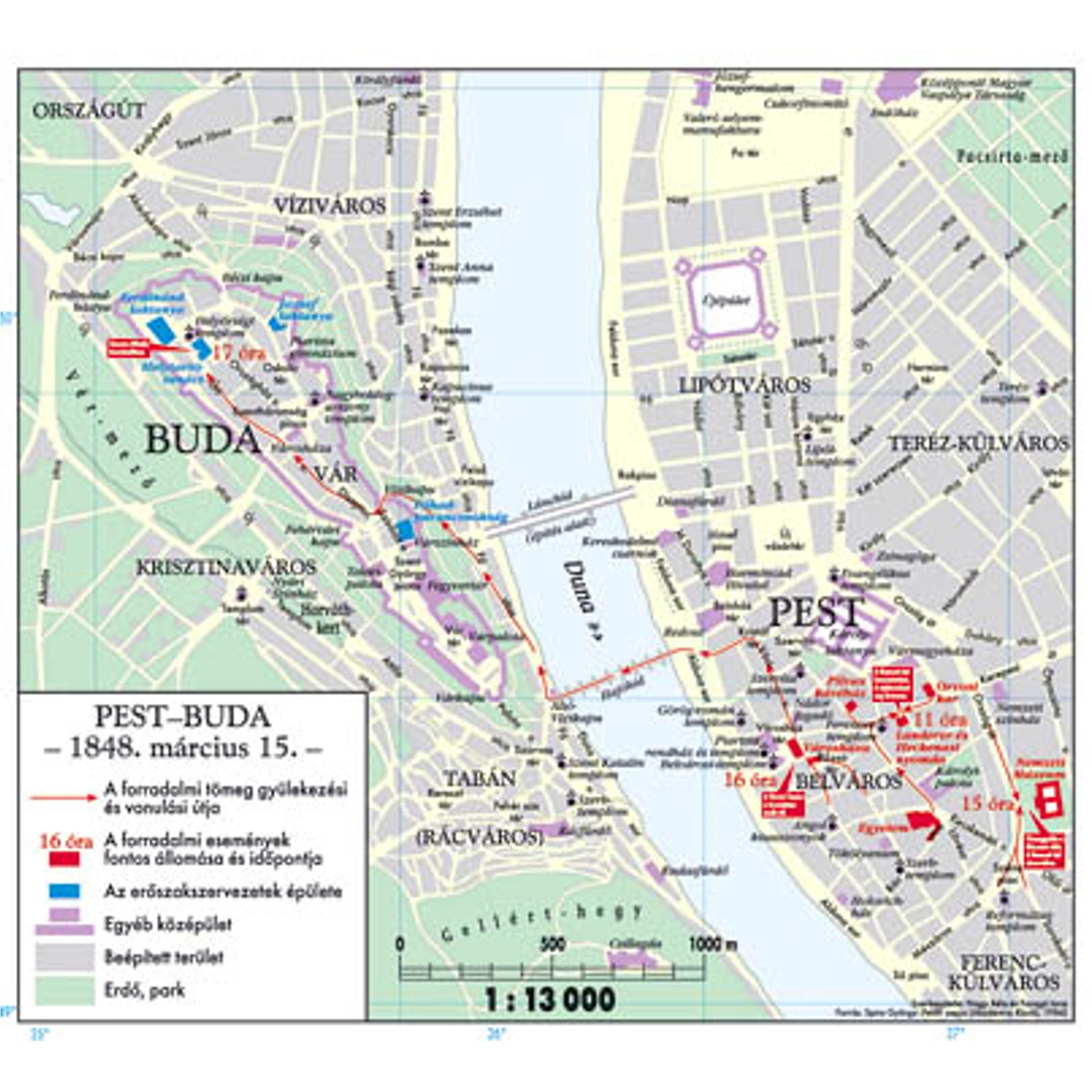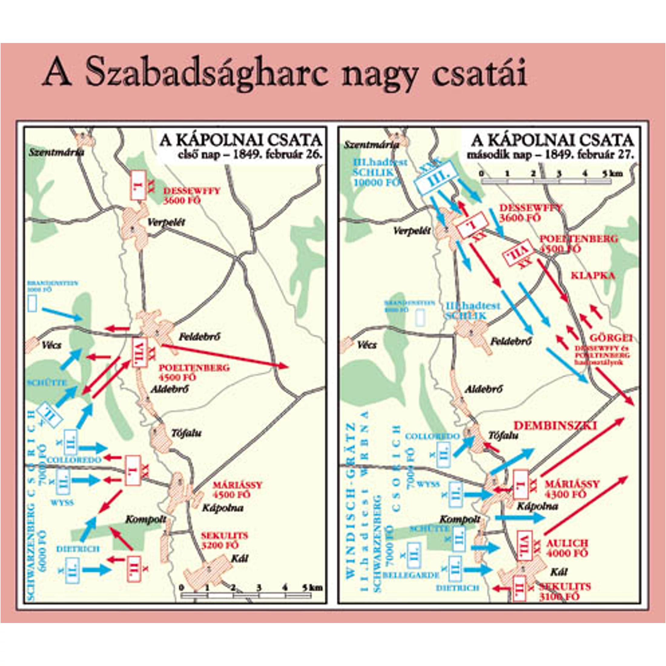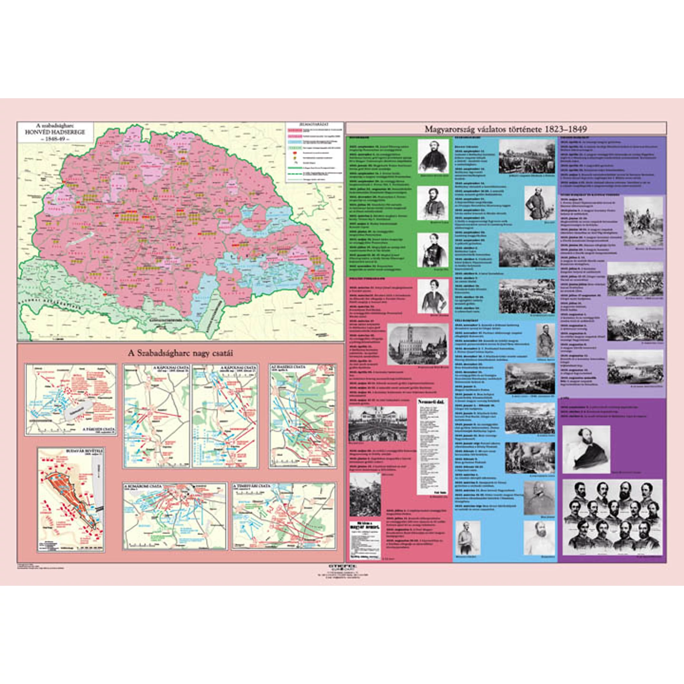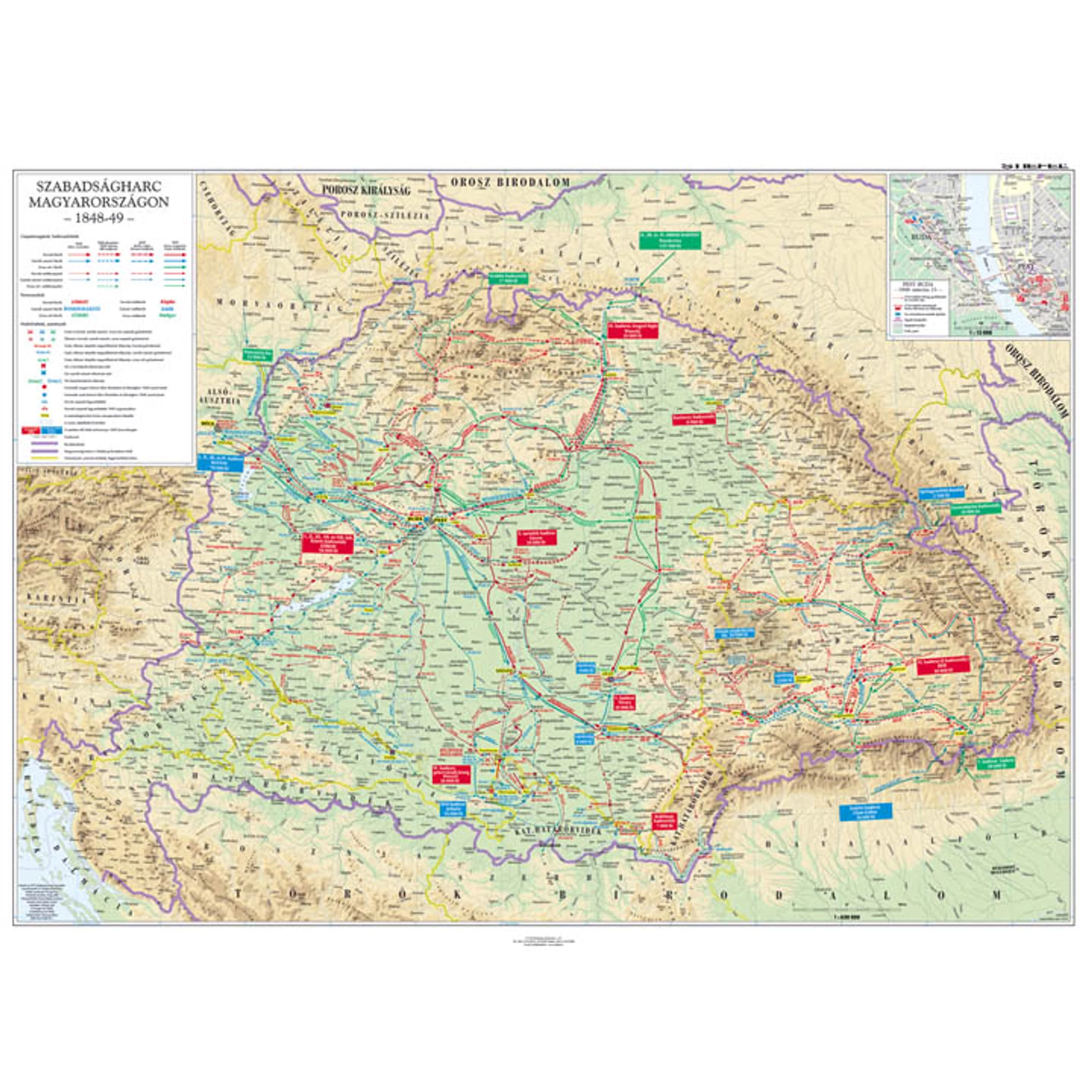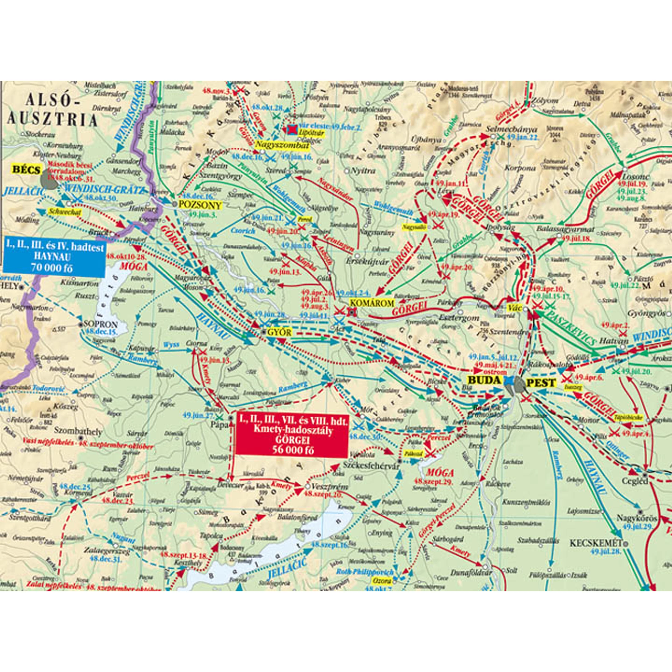 Részletes, látványos térkép az 1848-49-es forradalom és szabadságharc eseményeiről. A honvéd, osztrák és orosz fõerõk, hadtestek csapatmozgásai mellett az erõviszonyokat érzékeltetõ adatok is megtalálhatók a térképen. Az egyes csaták, a várak és a fegyverletételek helyszínei mind-mind megjelennek, továbbá egy Pest-Buda részlettérképpel is szolgál a kellemes színvilágú kiadvány.