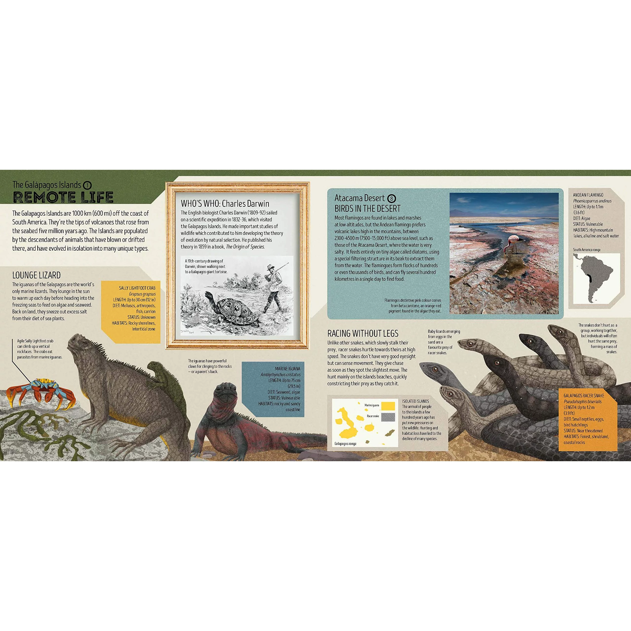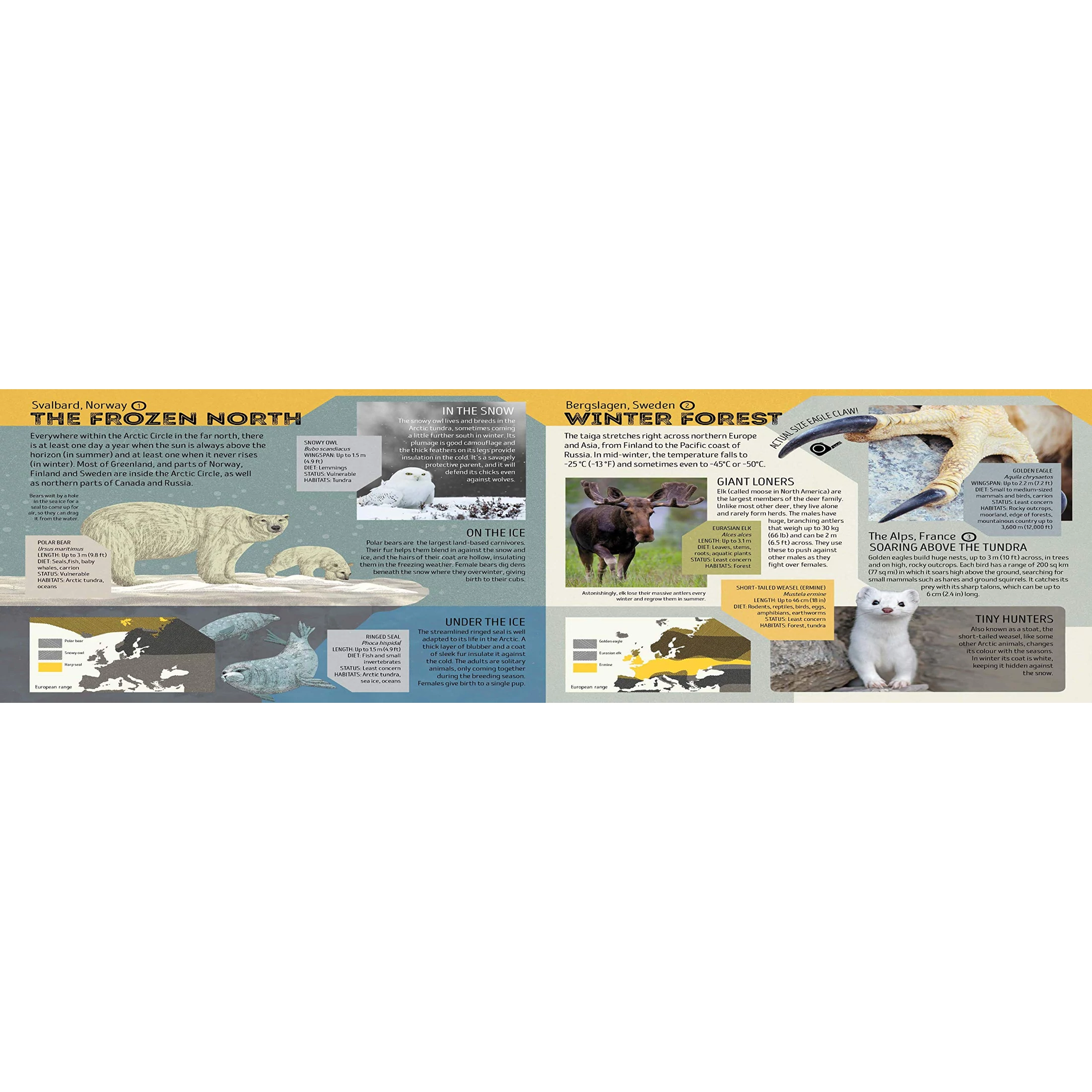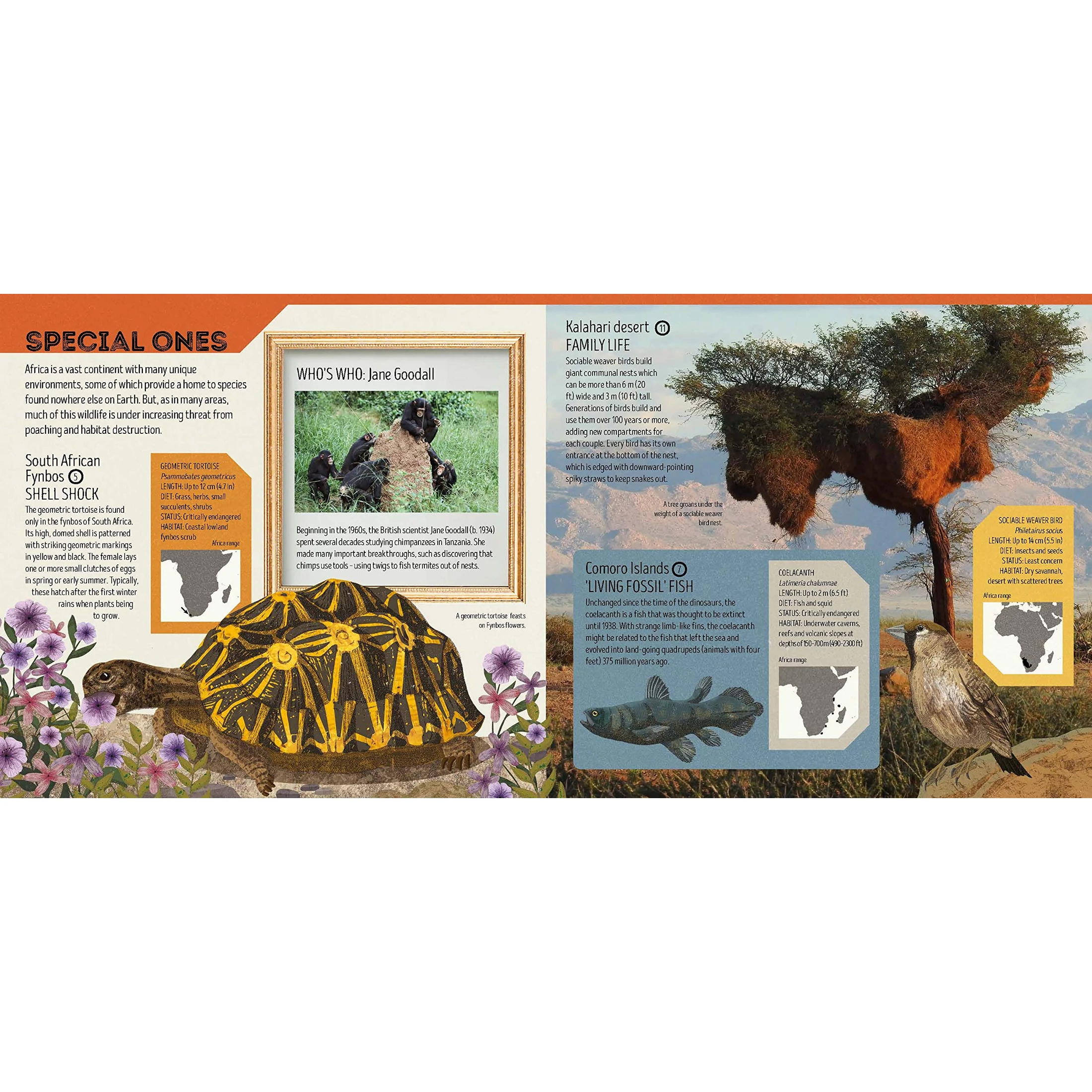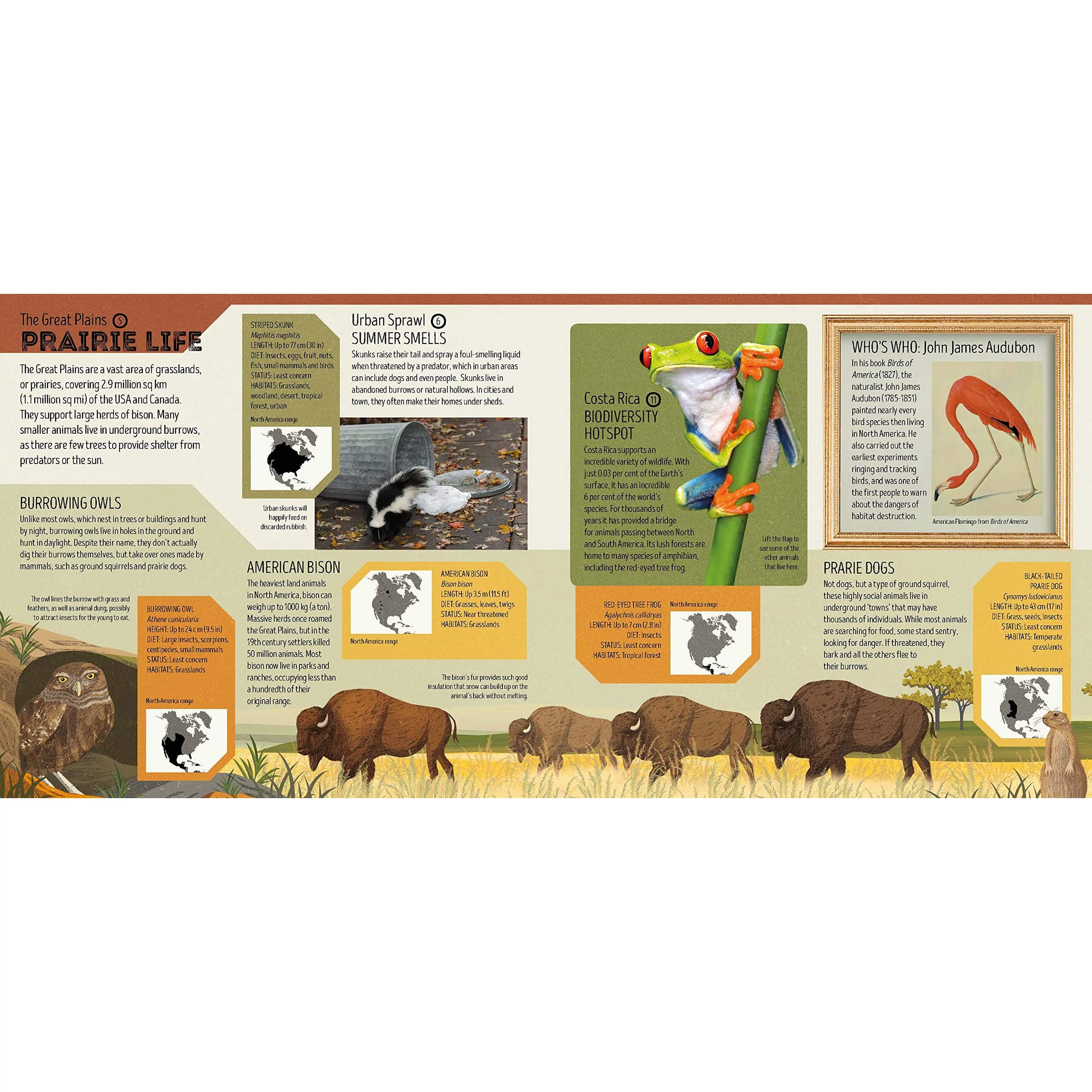 The book is divided into seven sections: North America, South America, Europe, Africa, Asia, Australasia, Oceania & Antarctica – each with a map of the major environments as well as illustrated and photographic depictions of some of the animals living there.