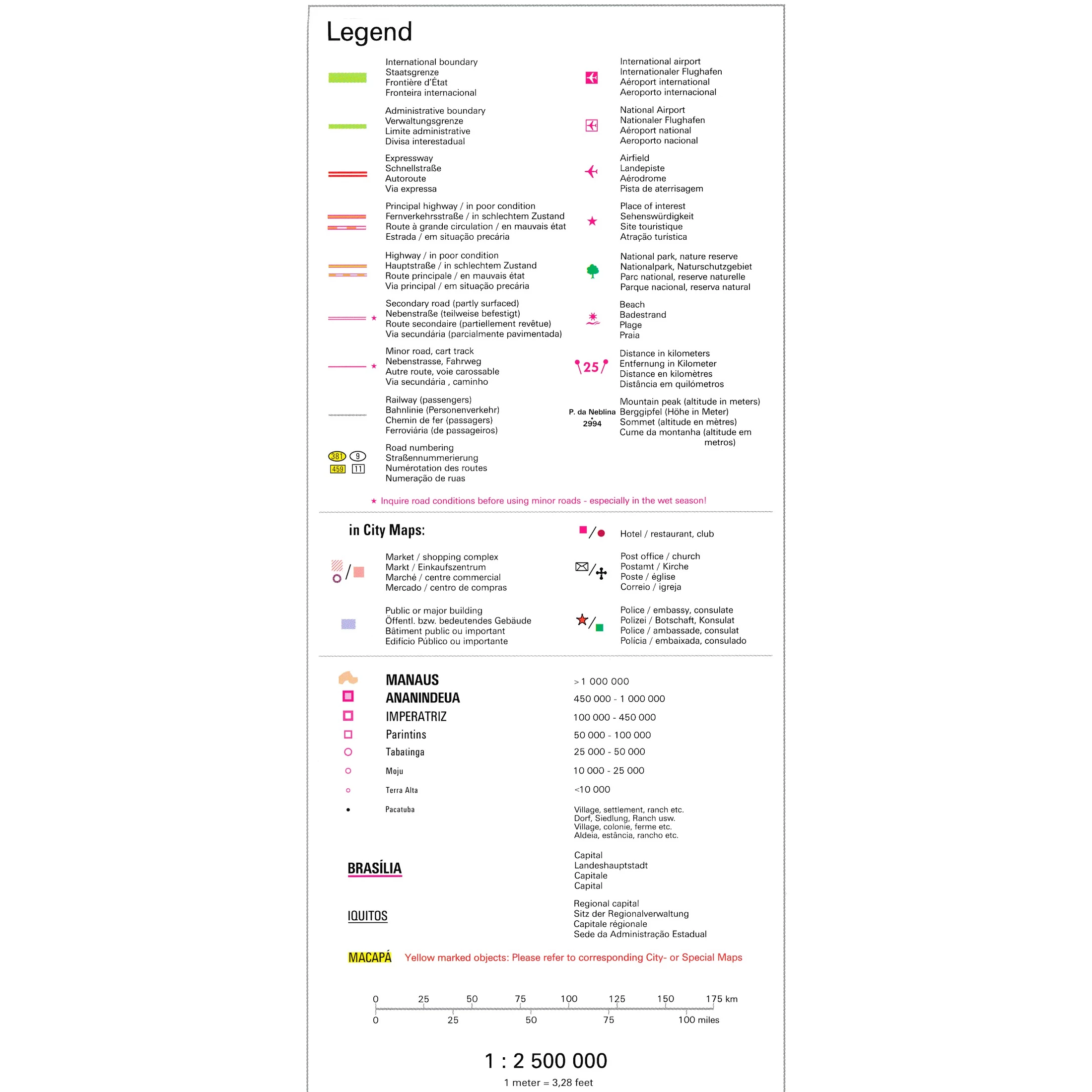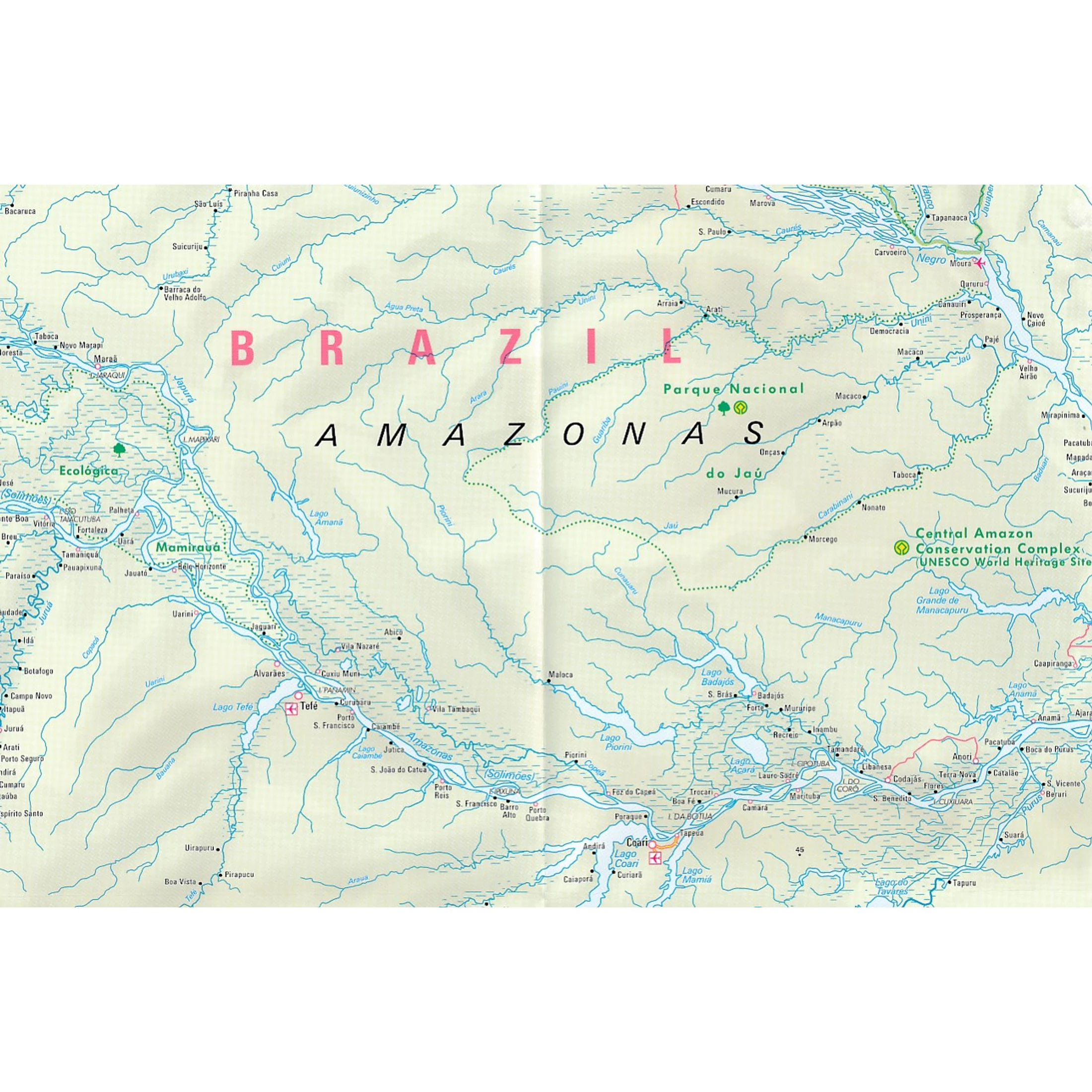 Jól olvasható térkép (mindkét oldalra nyomtatva) a brazíliai Amazonas vidékéről. A látnivalók remekül láthatóak különféle szimbólumokkal.