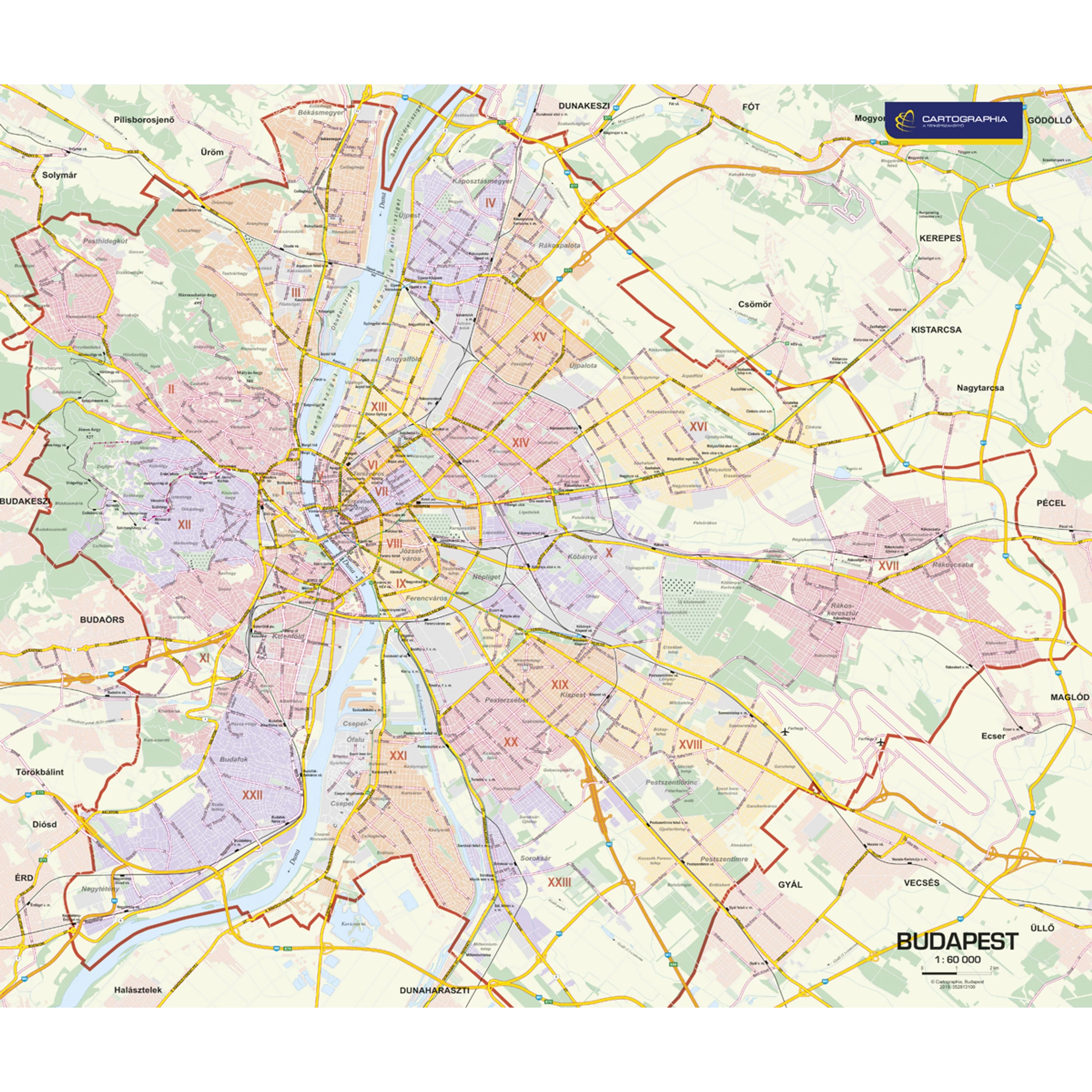 Budapest falitérkép a Cartographiatól - választható méretben és kivitelben, rendelésre is.