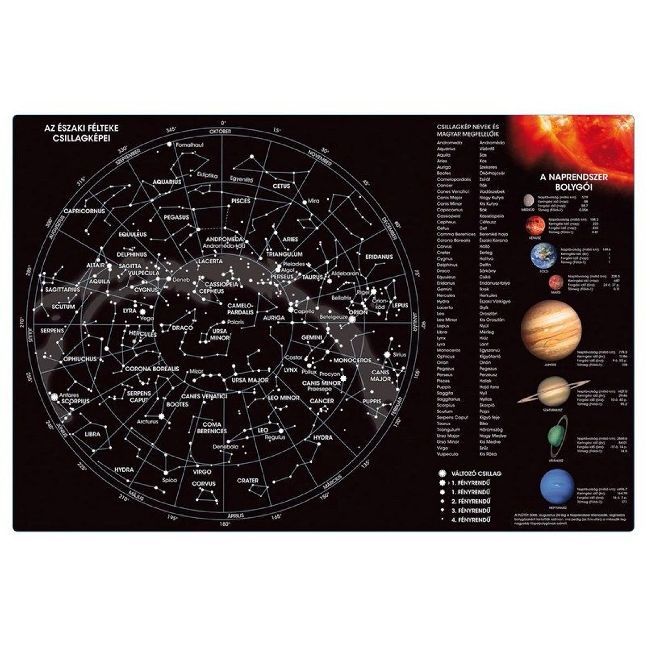 A másik oldalon az északi féltekéről látható égbolt csillagképei mellett a Naprendszer bolygónak fontosabb adatait is megtalálhatjuk.