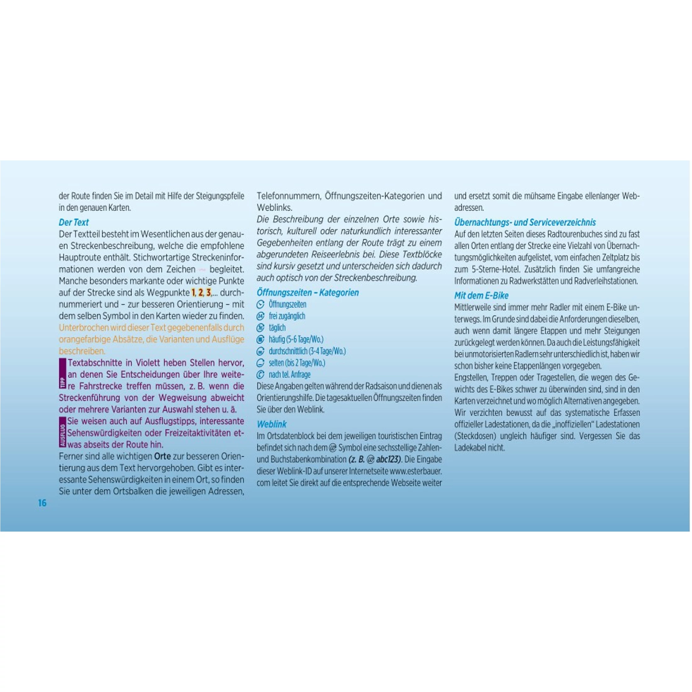 Az Esterbauer Verlag elkötelezett híve a kerékpáros kiadványoknak, alapításuk óta folyamatosan növekvő kínálatukból mára több, mint 400 cím elérhető. Mindig frissülő kalauzaik minden információt tartalmaznak, amik egy kerékpáros kirándulás megtervezéséhez és kivitelezéséhez szükséges.