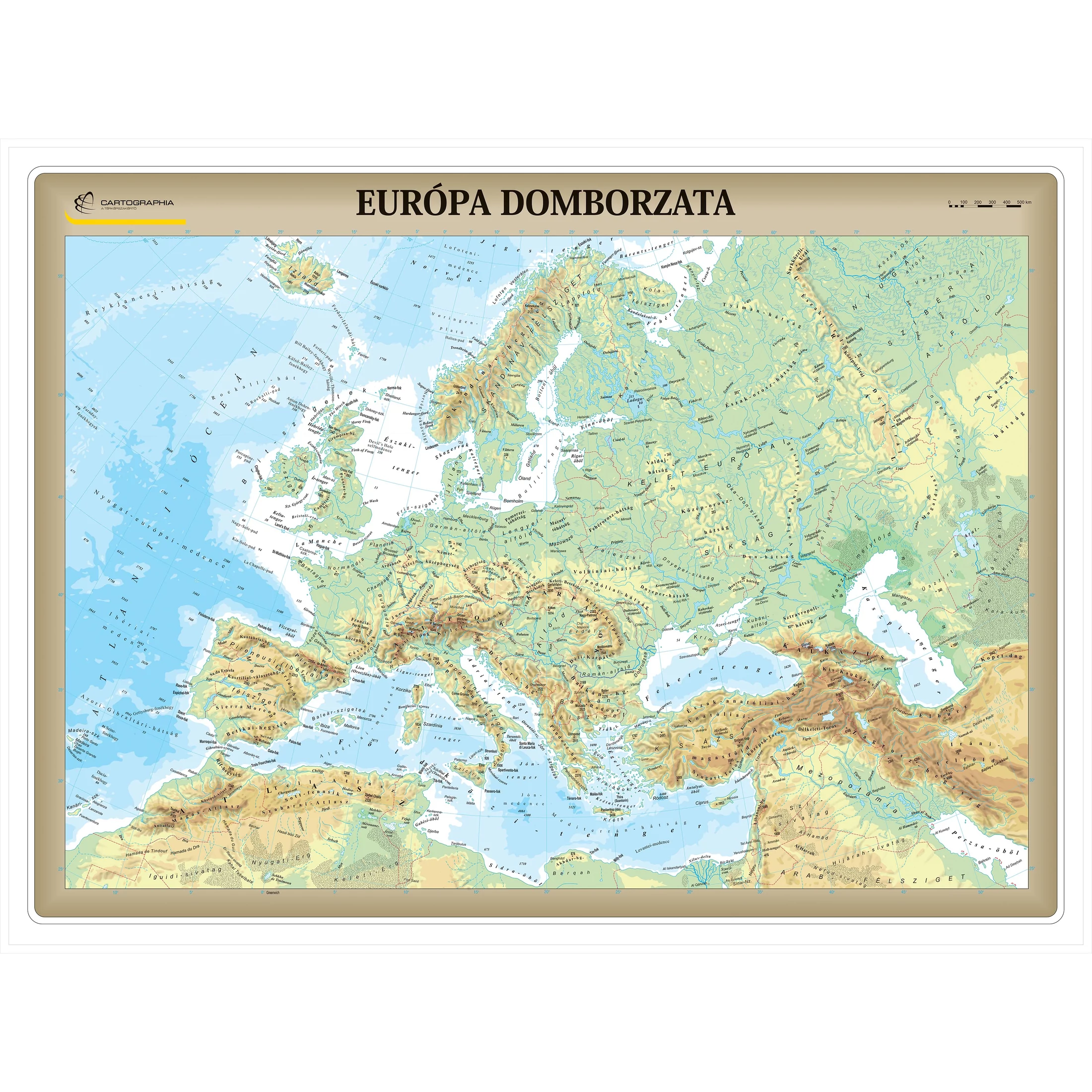 Európa domborzata falitérkép választható méretben és kivitelben, rendelésre is.
