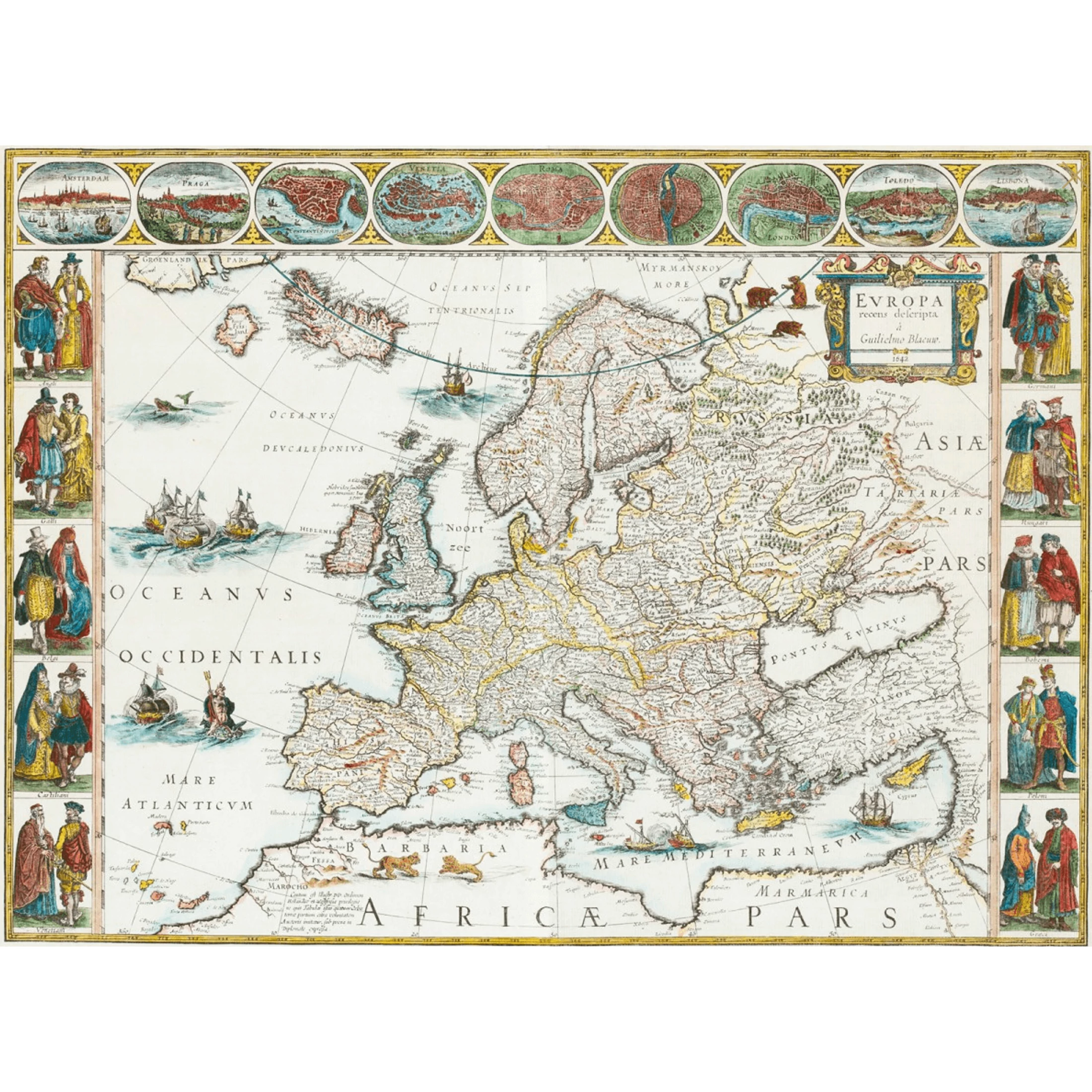 Willem Blaeu Európa térképe, amely a kor magasz színvonalú holland térképészetének képviselője.