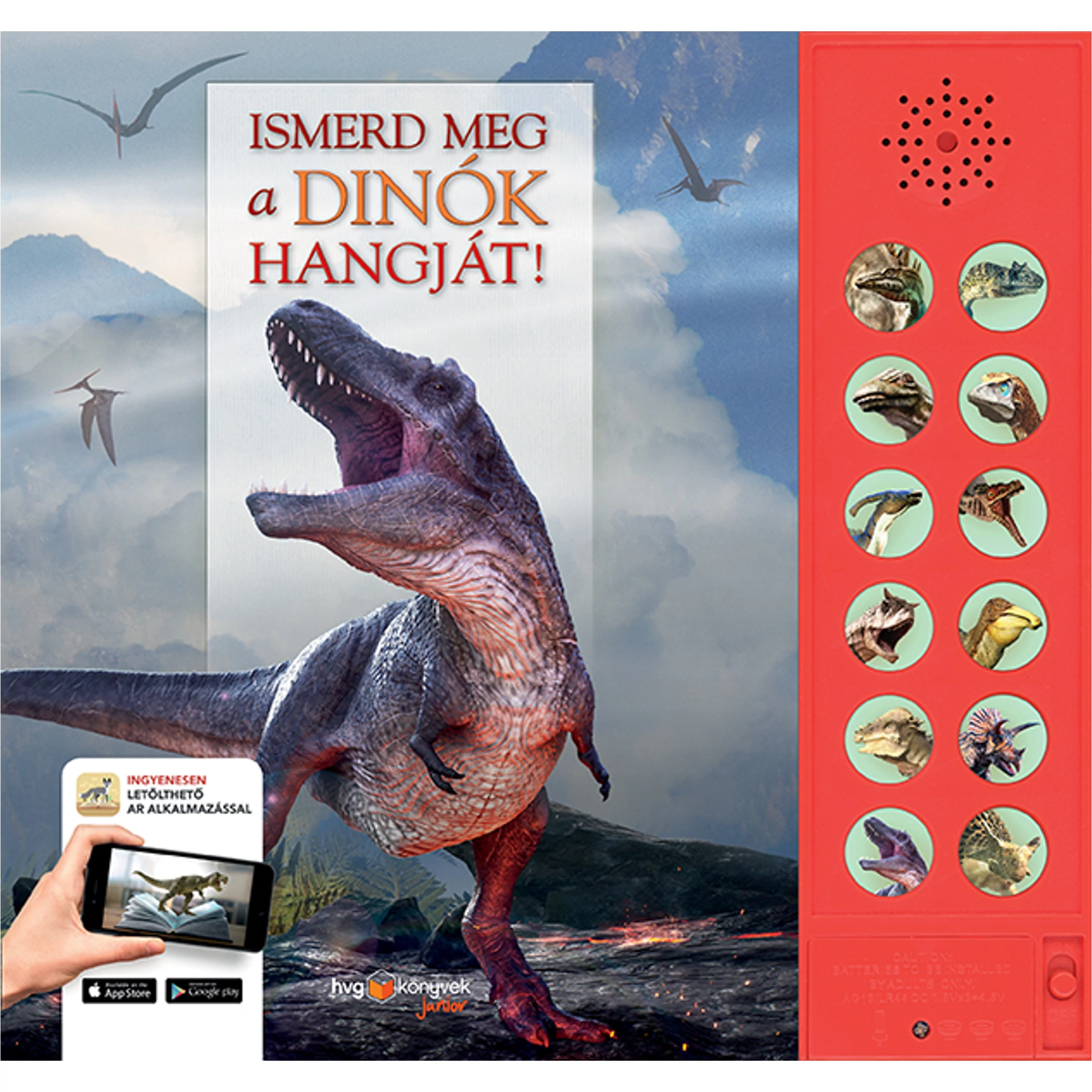 A gombok megnyomásával meghallgathatod az állathangokat, ingyenesen letölthető applikációnk segítségével pedig akár 3D-s formában is a szobádba varázsolhatod kedvenc dinoszauruszaidat.