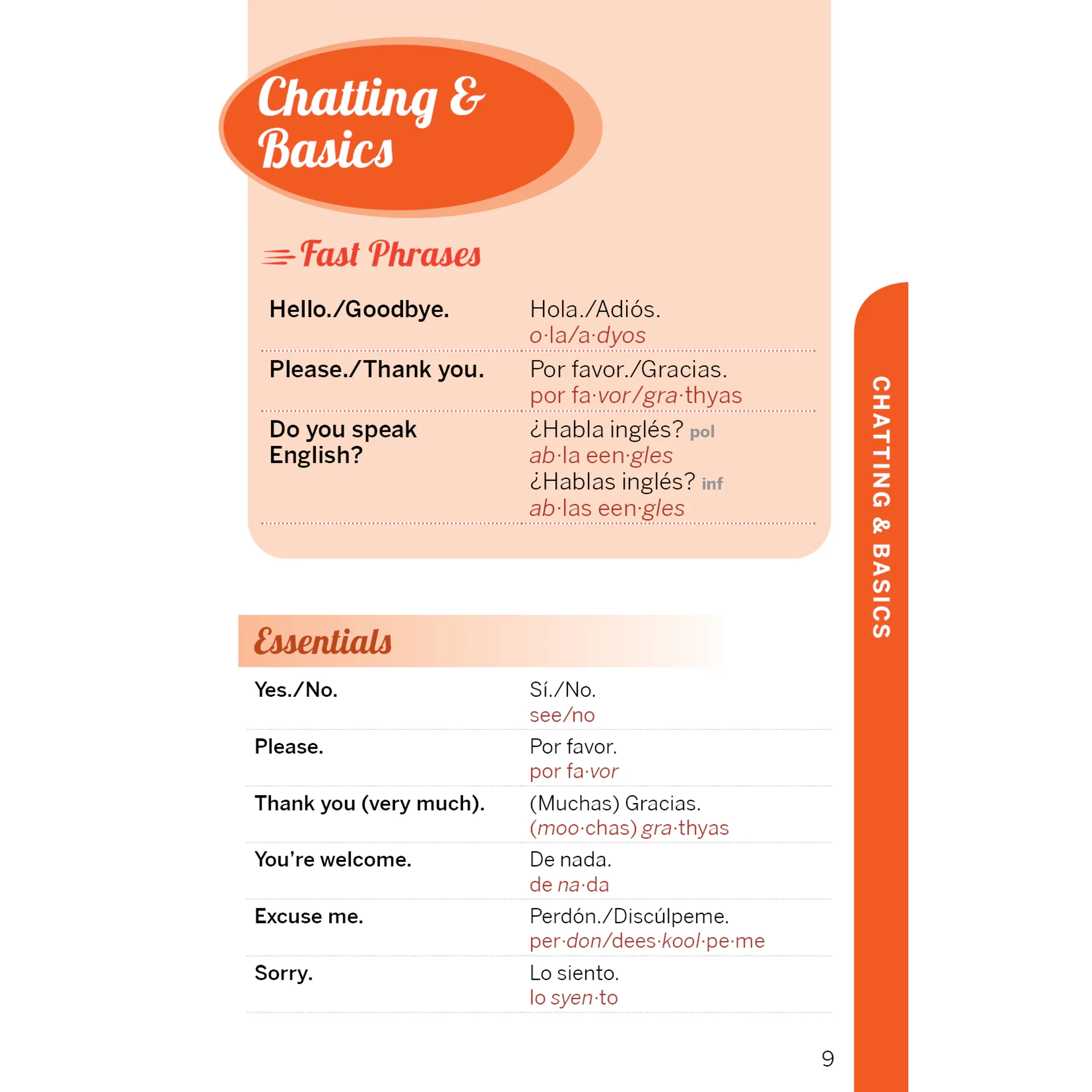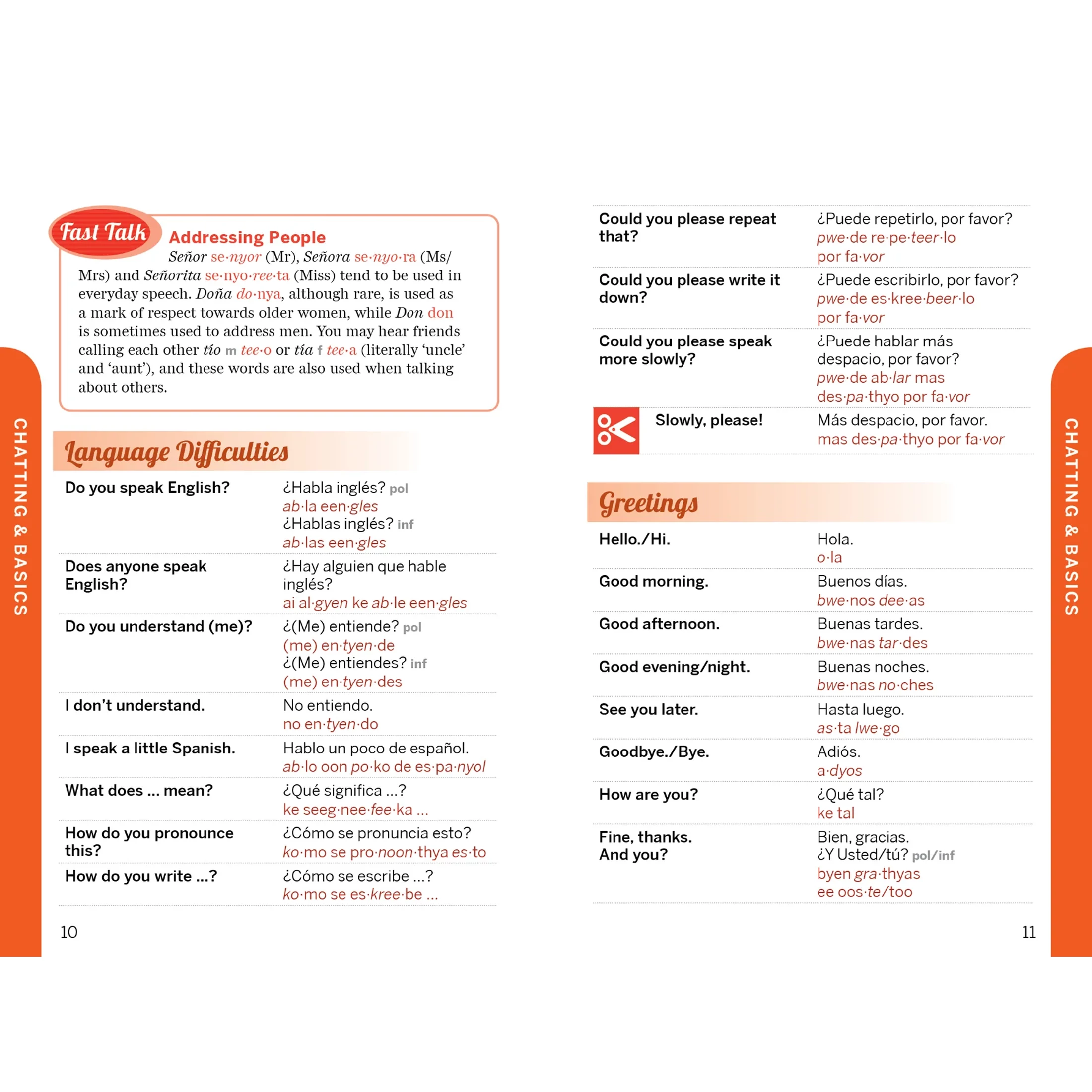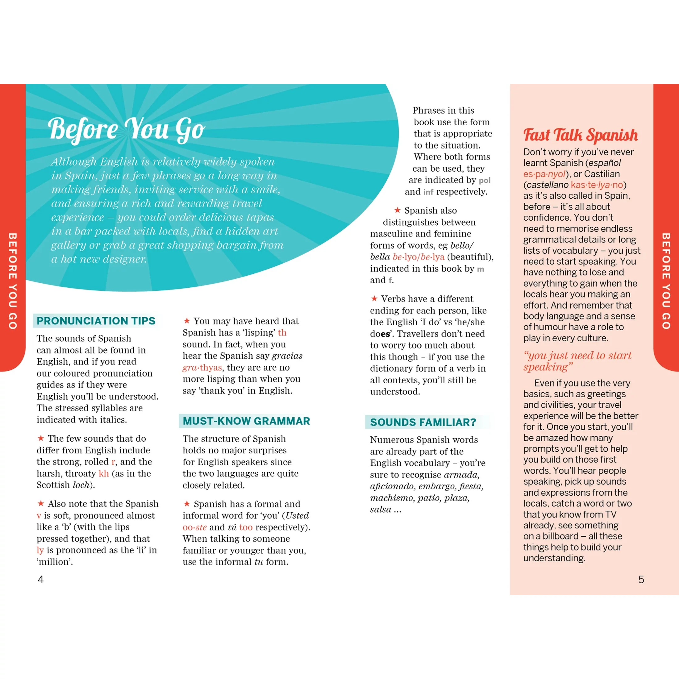 Bár el lehet boldogulni Spanyolországban a nyelv ismerete nélkül is, néhány alapvető kifejezés ismerete segíthet barátokat szerezni, kedves kiszolgálásban részesülni, és gazdagabb, kielégítőbb utazási élményeket szerezni. A "Fast Talk Spanish" egy tömör nyelvi útmutató, amely garantáltan magabiztossá tesz a beszédben.