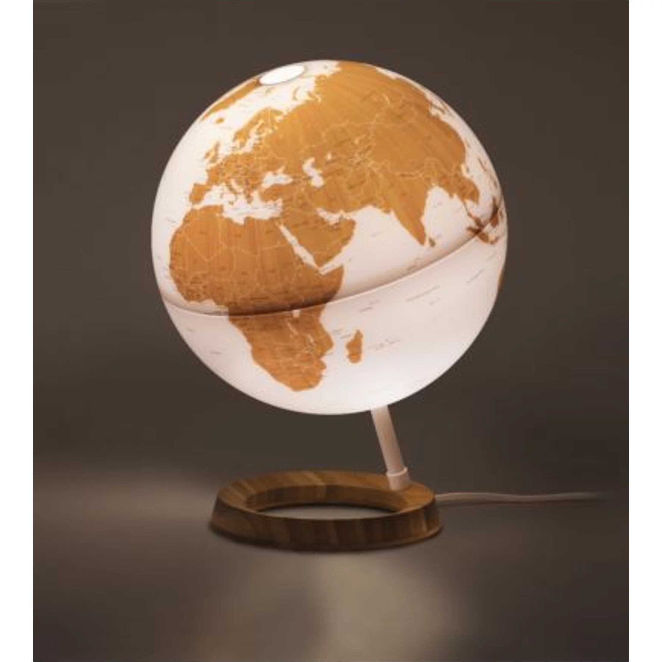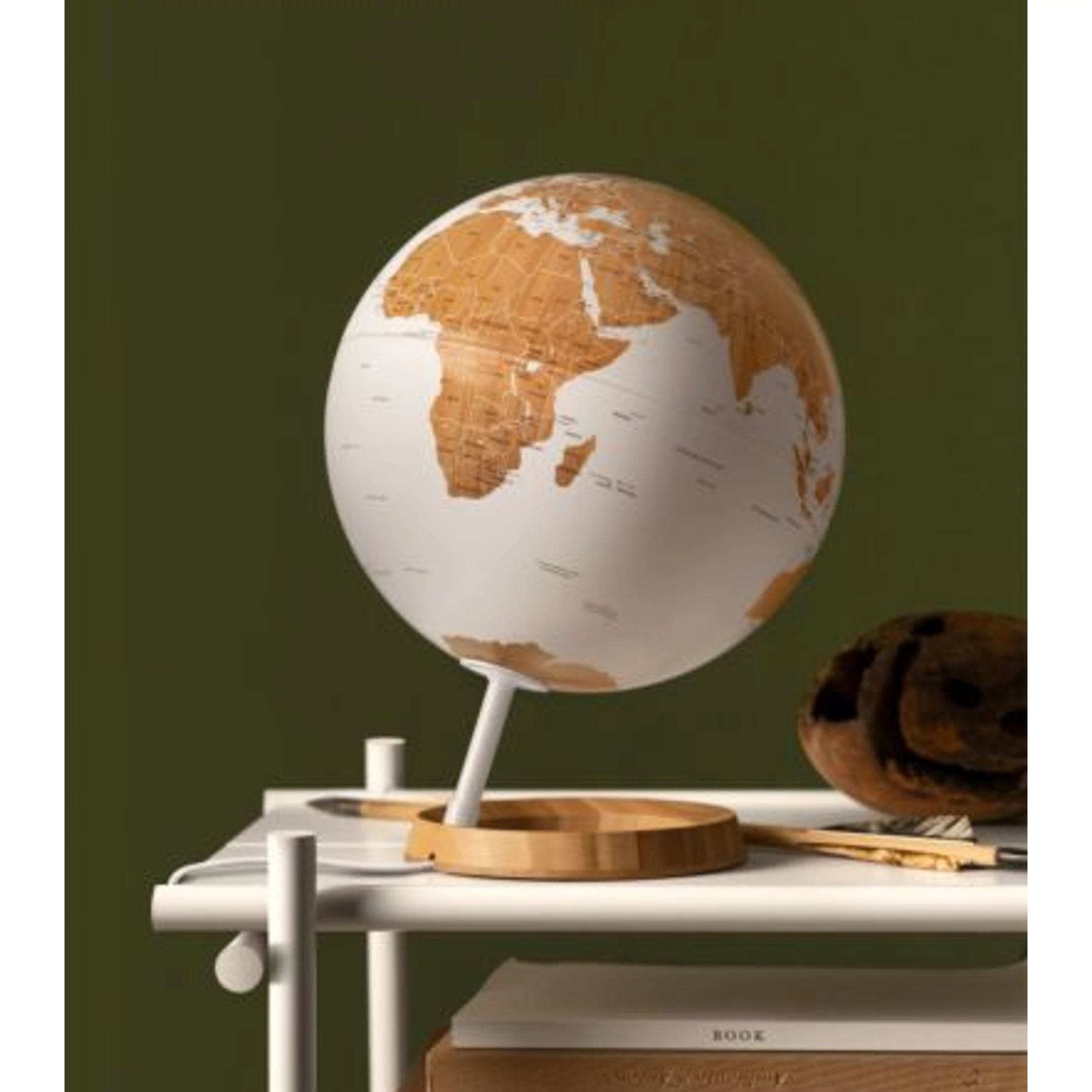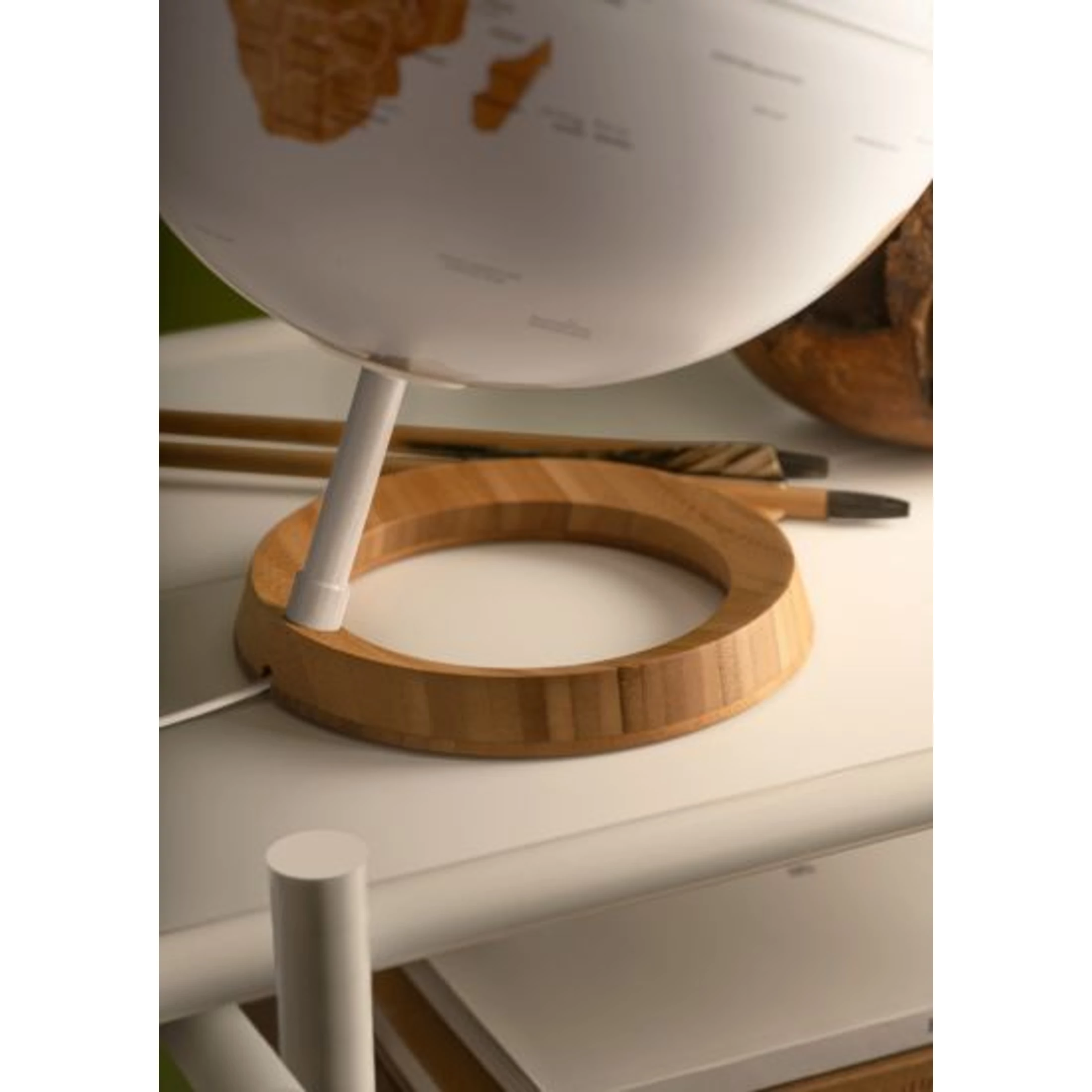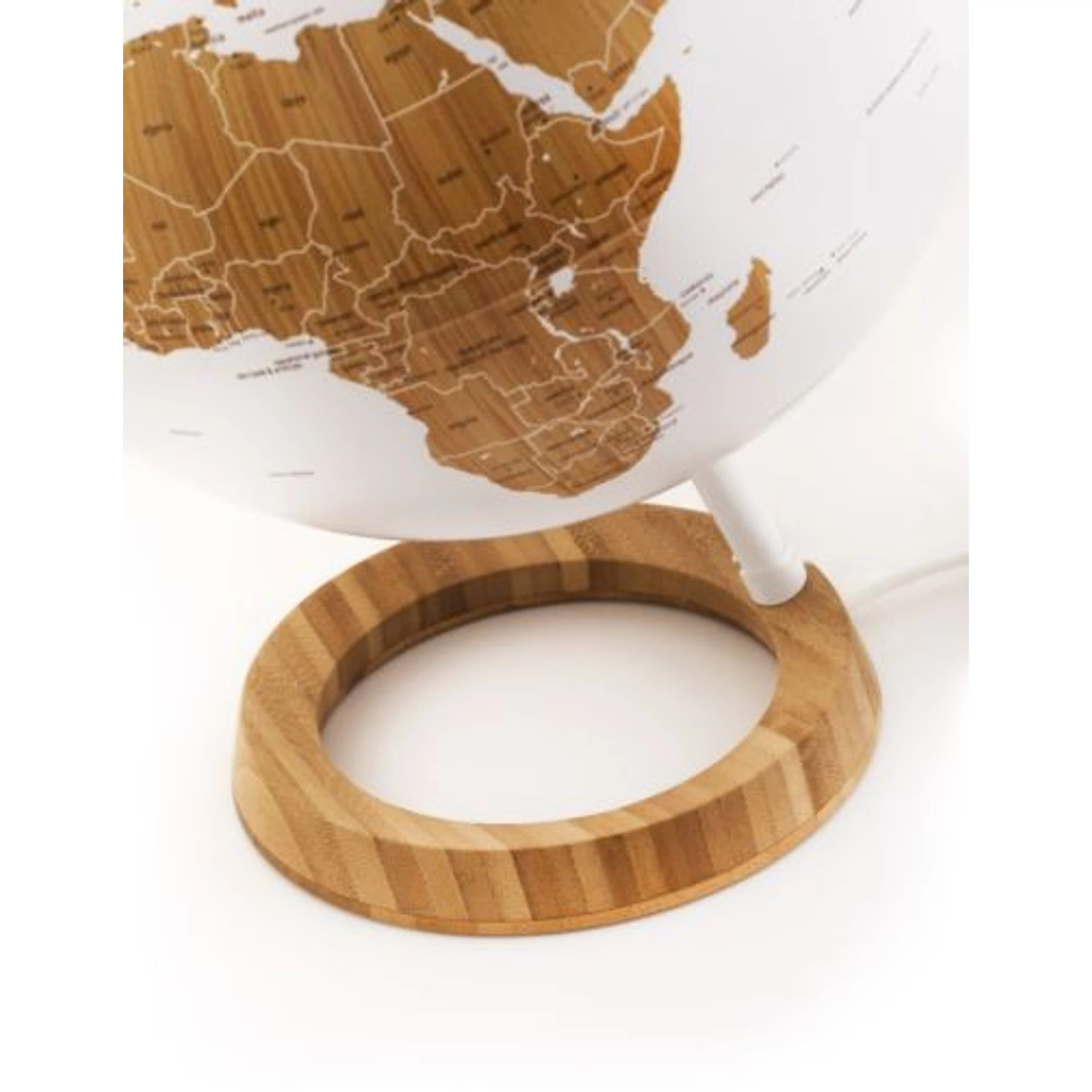 A BAMBOO földgömb bambusz talapzatával, nagyon kifinomult, skandináv stílusra emlékeztető kialakítású, visszafogott, elegáns színekben pompázó  angol nyelvű földgömb.