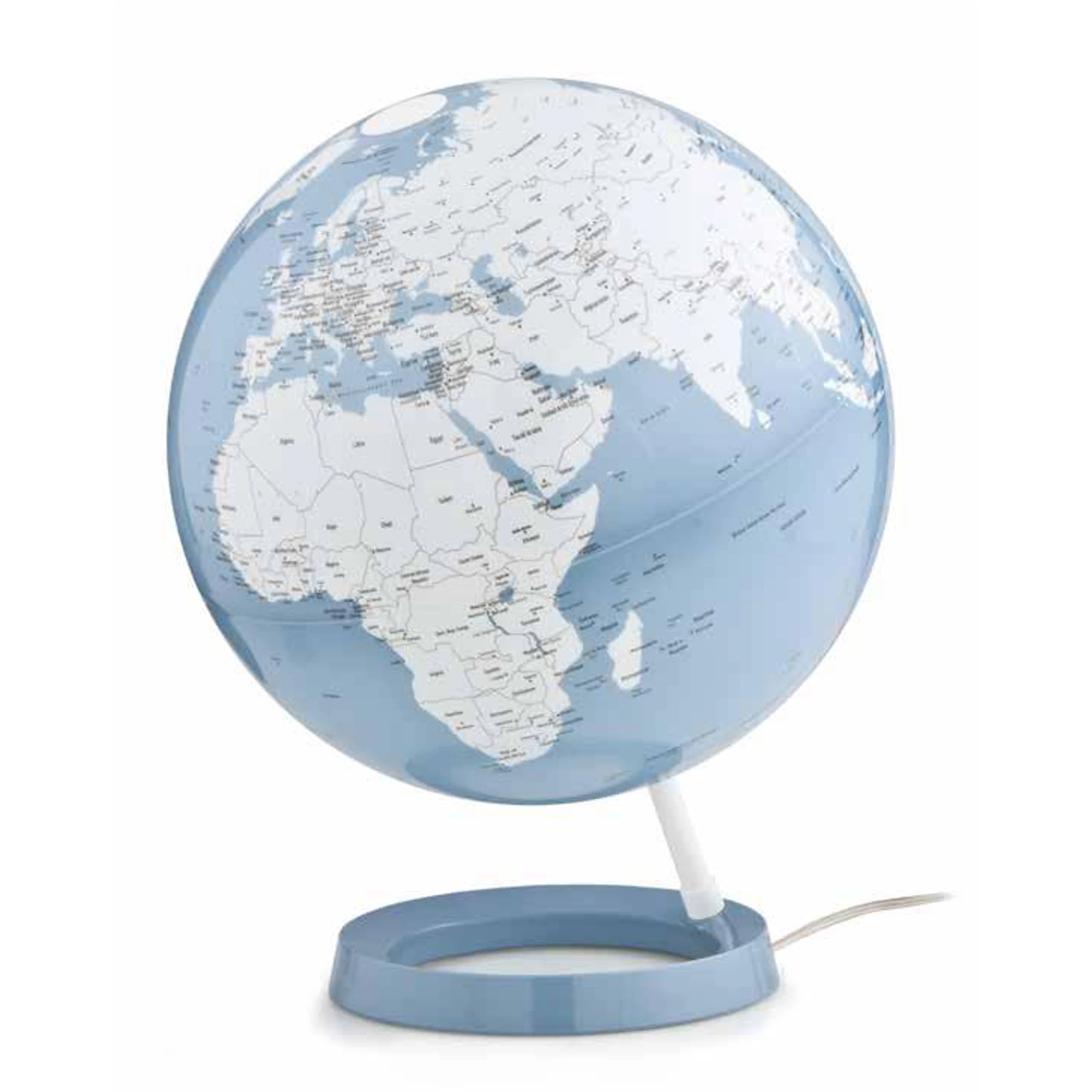 Világító földgömb skandináv vonalakkal, fehér és pasztell kék színben. LIGHT&COLOUR PASTEL AZURE földgömb angol nyelvű, illusztrált politikai földgömb, minimalista dizájnnal.