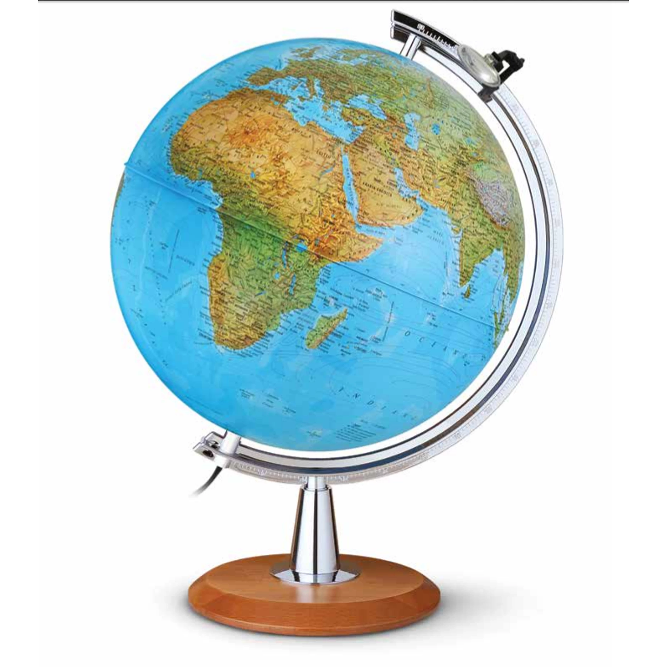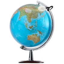 Alapállapotban domborzati, kivilágítva az aktuális politikai állapotoknak megfelelő országonkénti színezésű földgömb, nagyítóval. Az átlagosnál nagyobb méretű földgömb!