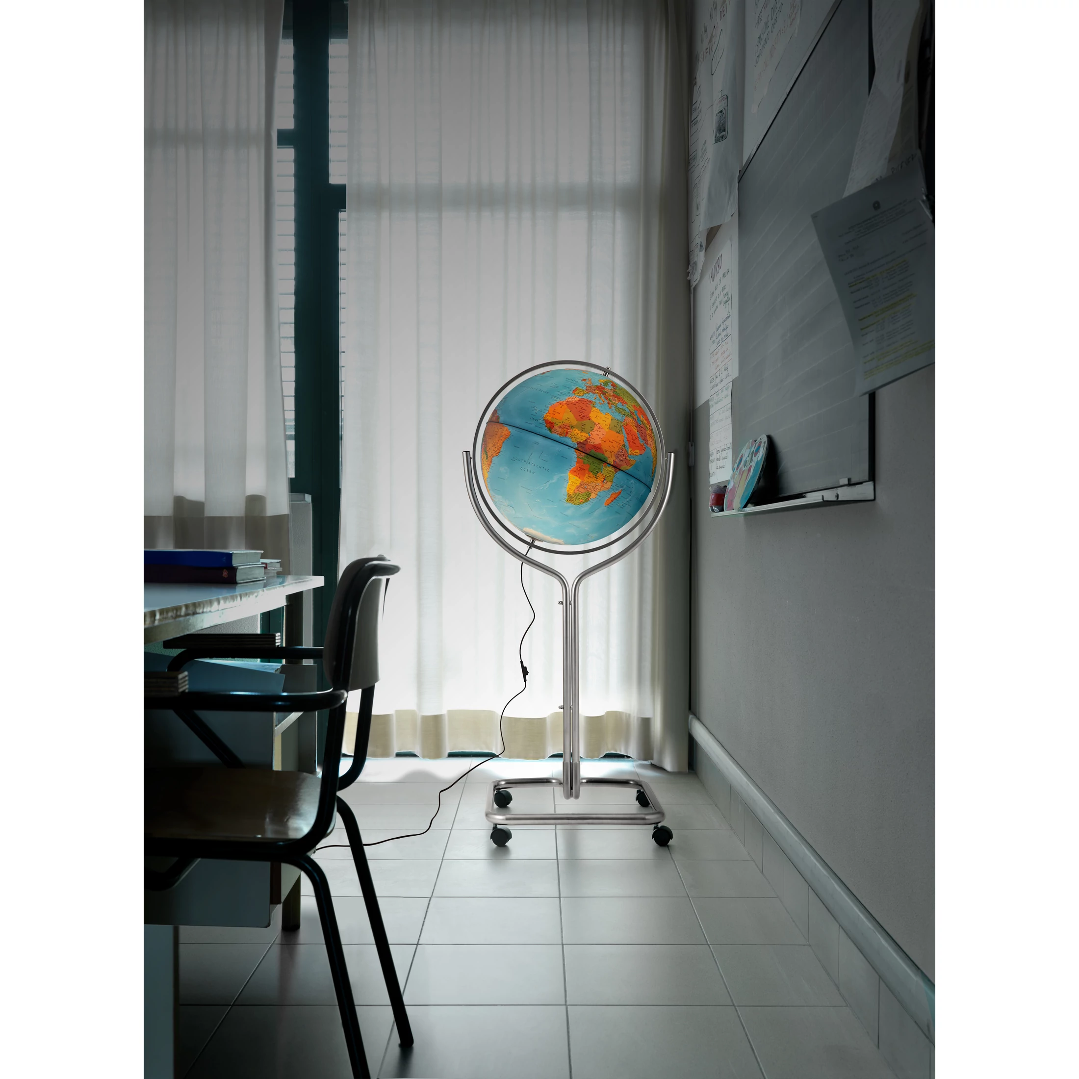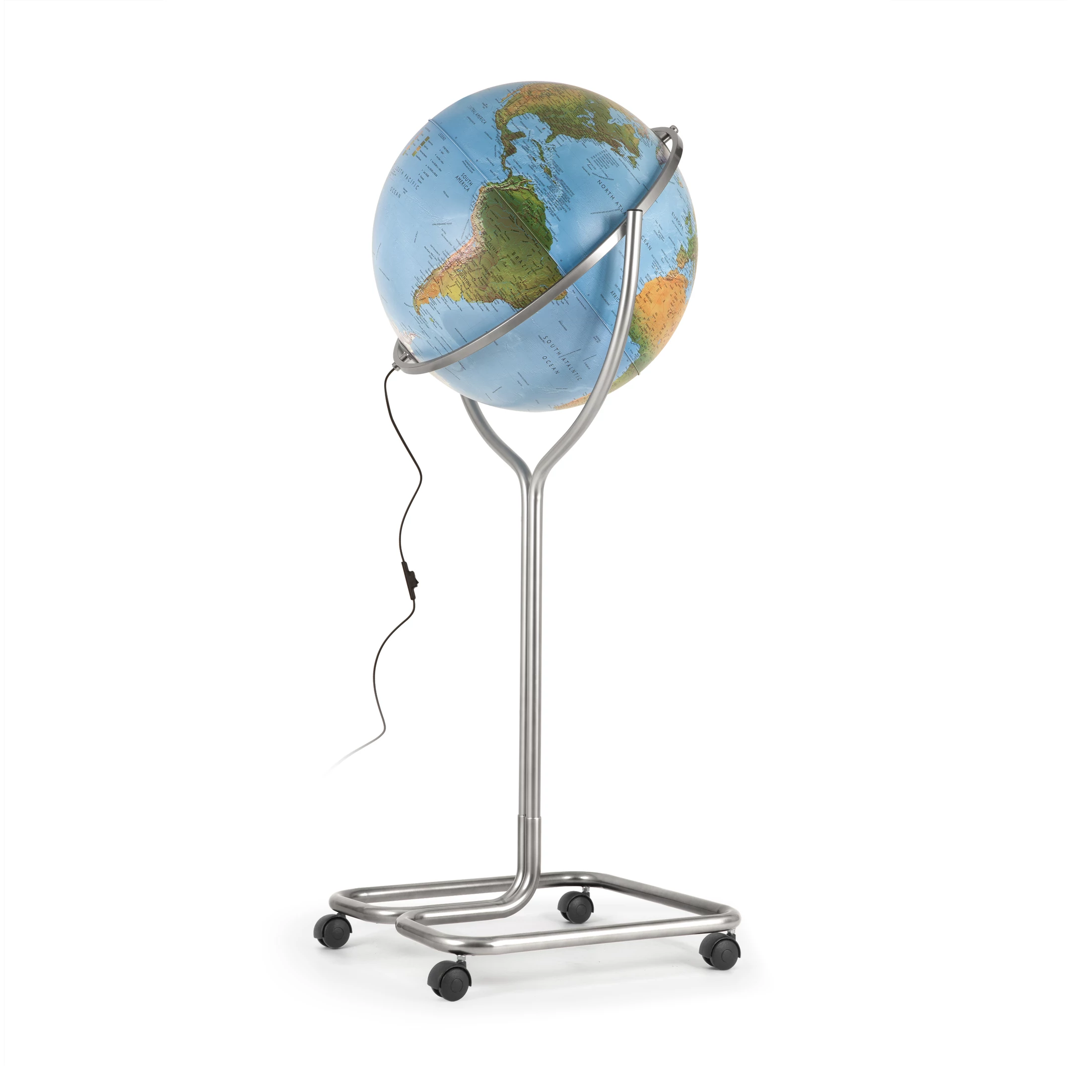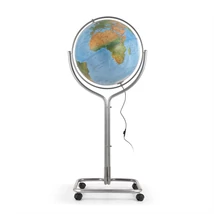 Az 50 cm-es Erika világító földgömb erőteljes és tartós, krómozott acél csővázon áll, amelyet négy kerék tesz könnyen mozgathatóvá.