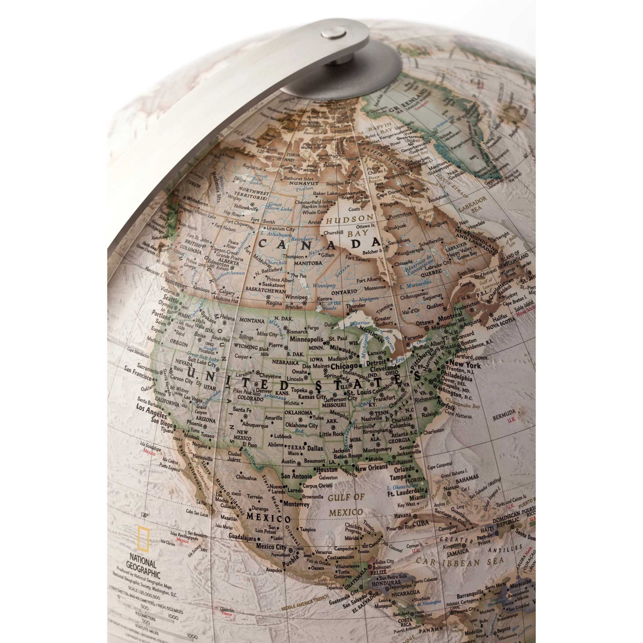 A National Geographic készíti a létező legkáprázatosabb, élénk színű, letisztult térképeket. A talp és a meridián acélból, a gömb kiváló minőségű műanyagból készült. Kivilágítva fantasztikusan mutat egy gyér fényű szobában.