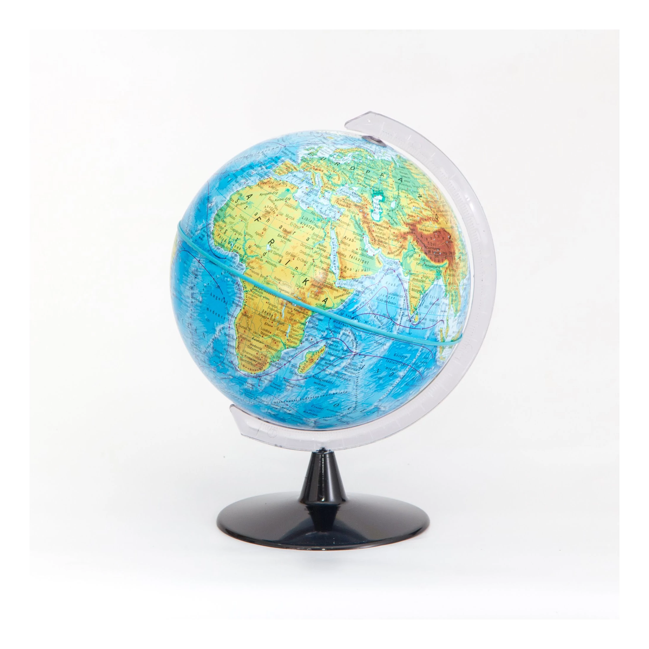 16 cm átmérőjű kisméretű, földrajzi színezésű asztali földgömb.Műanyag talp és meridián.