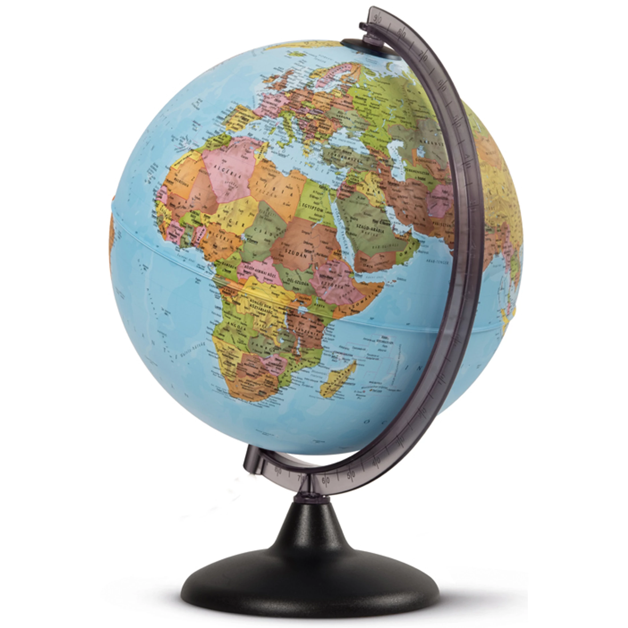 3000 földrajzi nevet feltüntető földgömb, országonkénti színezéssel, műanyag talppal. Magyar nyelvű.