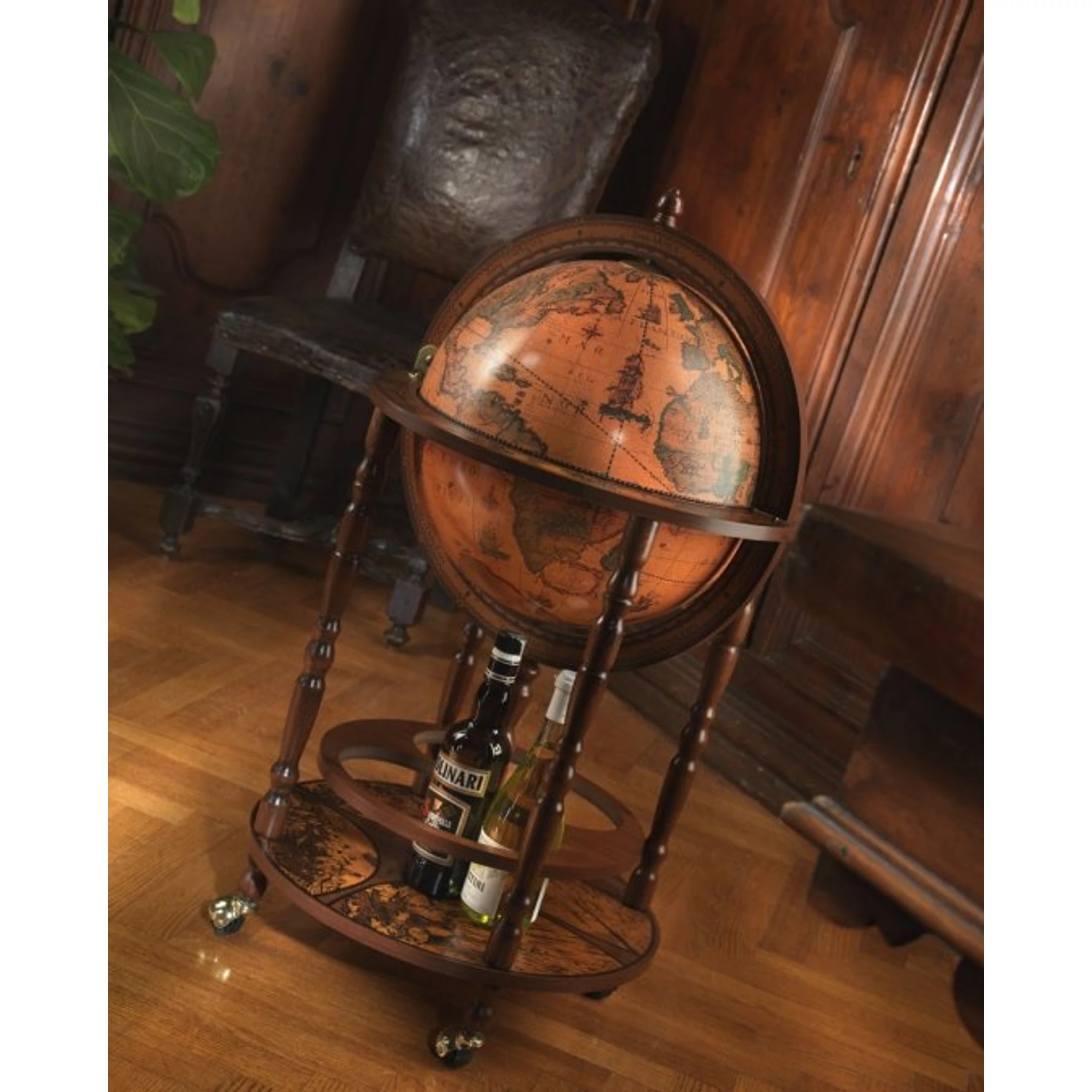 Ez a szép, padlóra állítható földgömb és italszekrény valóban "kerek földgömbként" írható le, hiszen minden ezen a bárgömbön kerek alakú, a teljes fából készült meridiántól kezdve - amely magát a gömböt öleli körül - egészen a finom részletességű illusztrációkig az állvány alsó talapzatán.