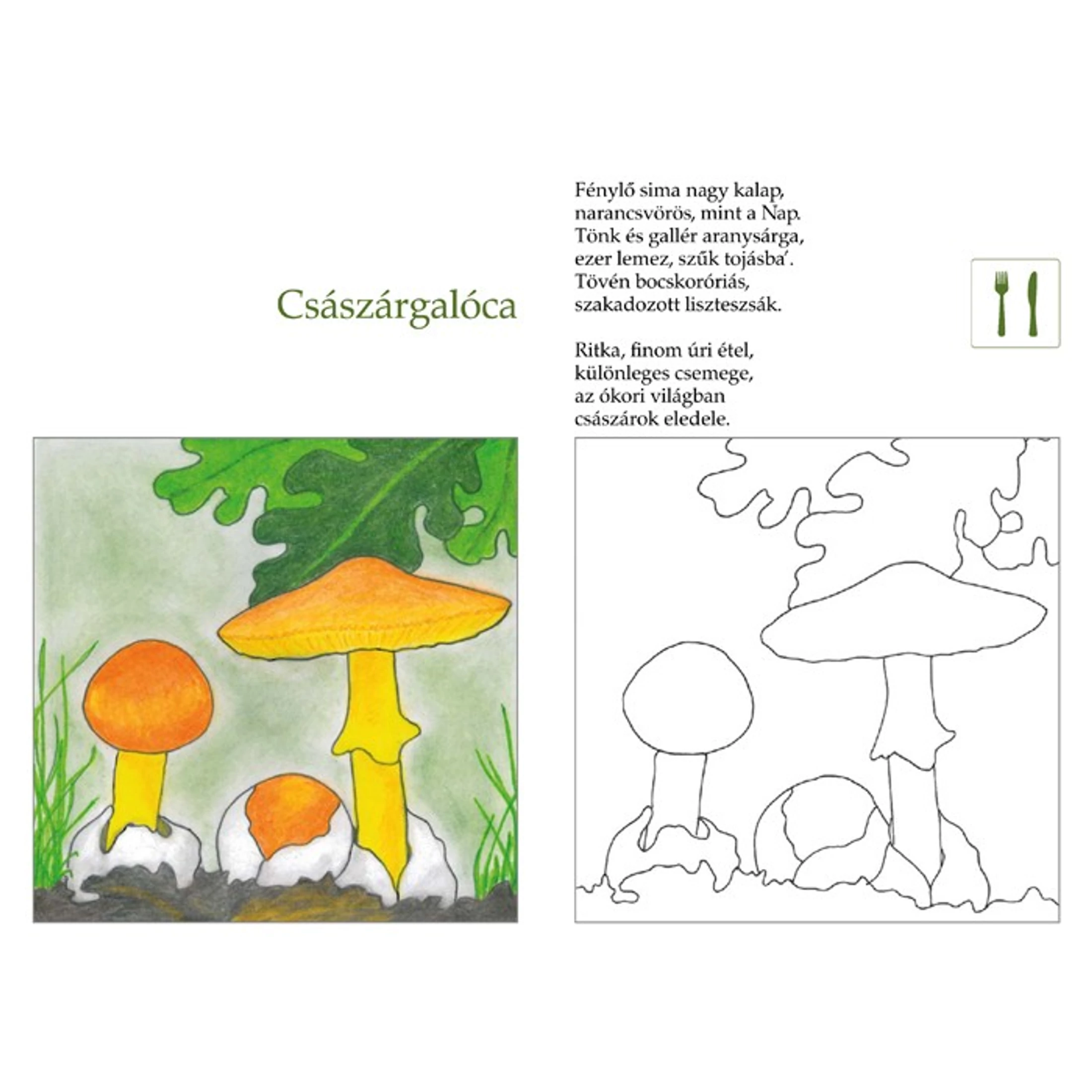 A színező Kárpáti Zsuzsa kedves verseivel és színezhető rajzaival mutat be 32 gombafajt.