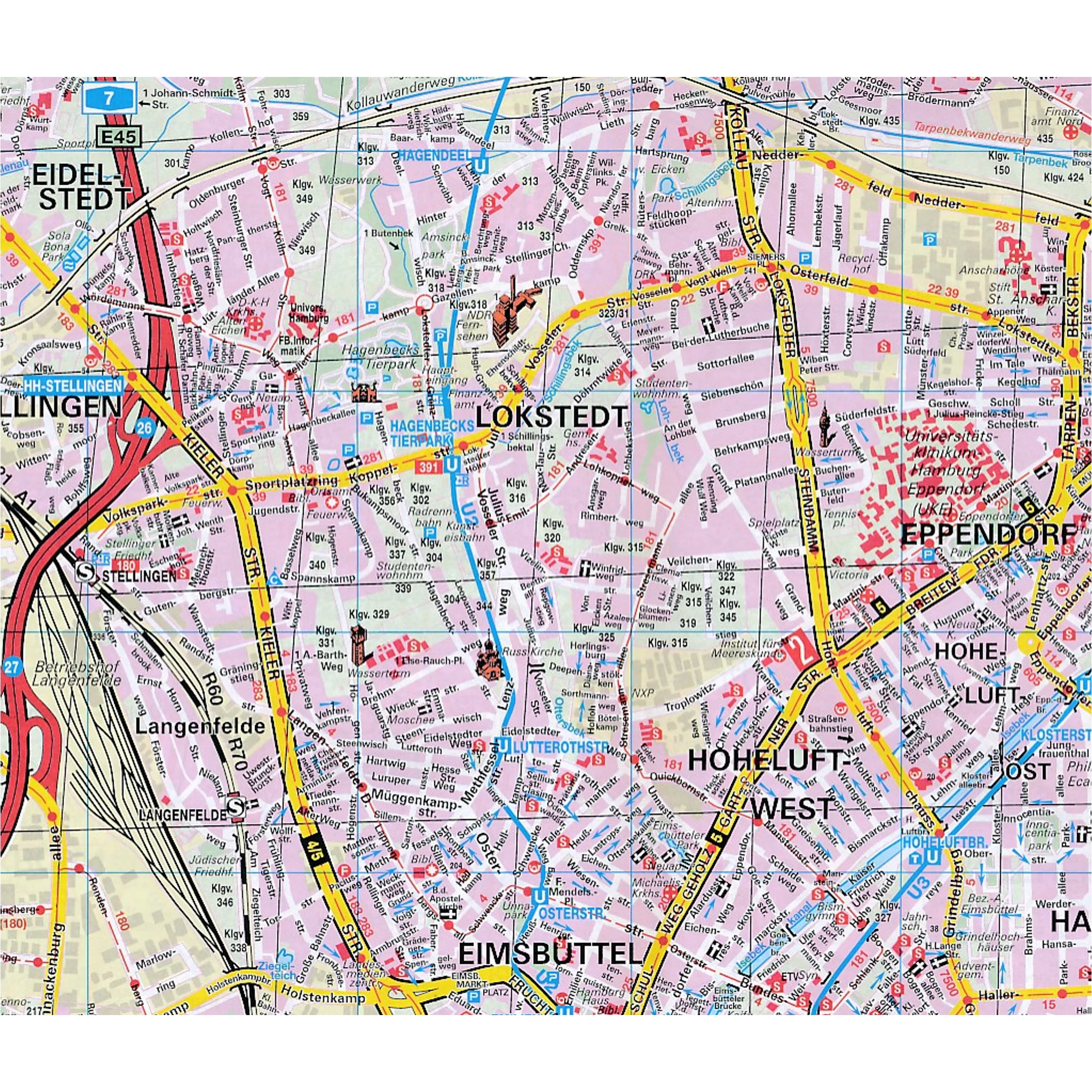 • Hamburg útvonalhálózata, postai irányítószámok, utcajegyzék, tranzittérkép 1:125 000