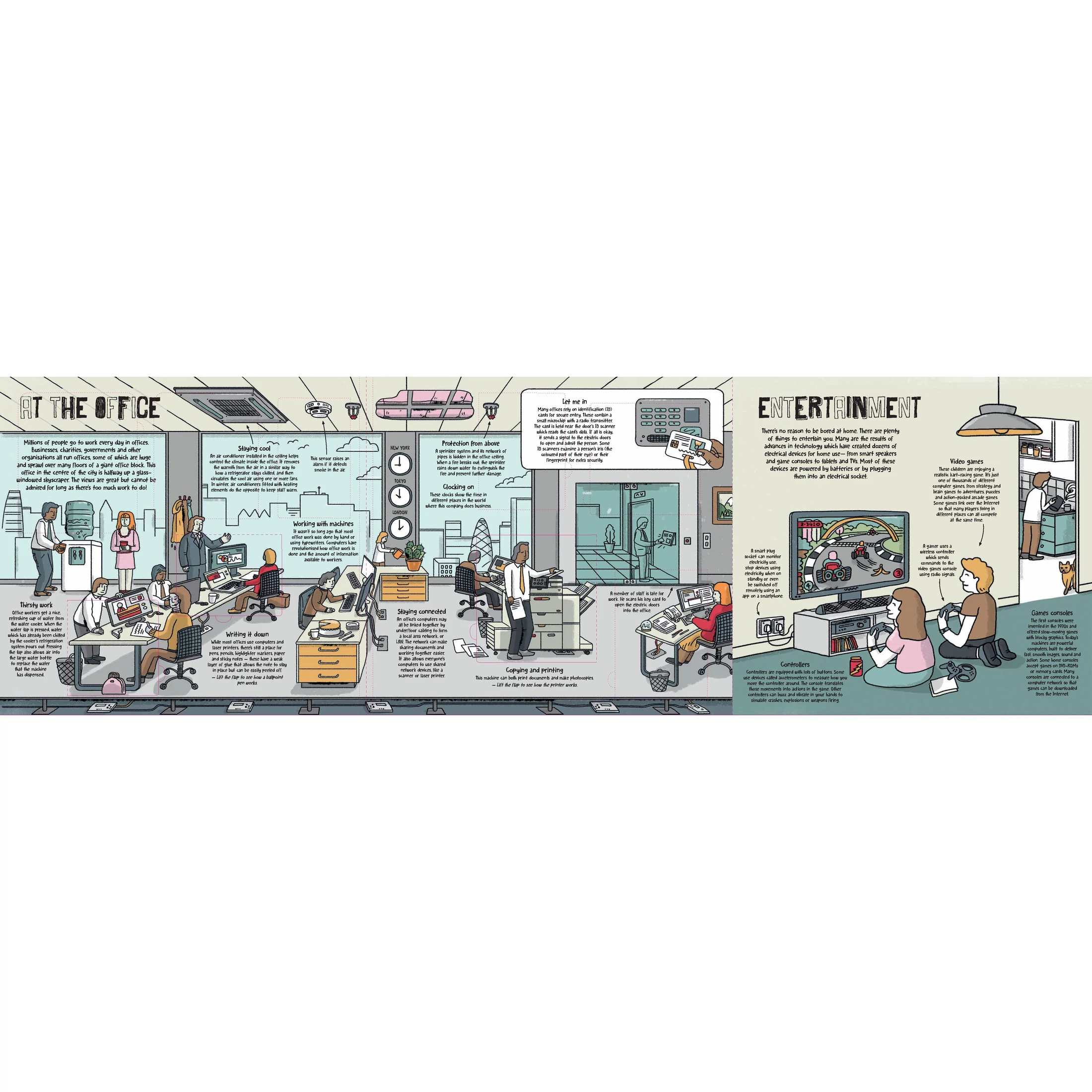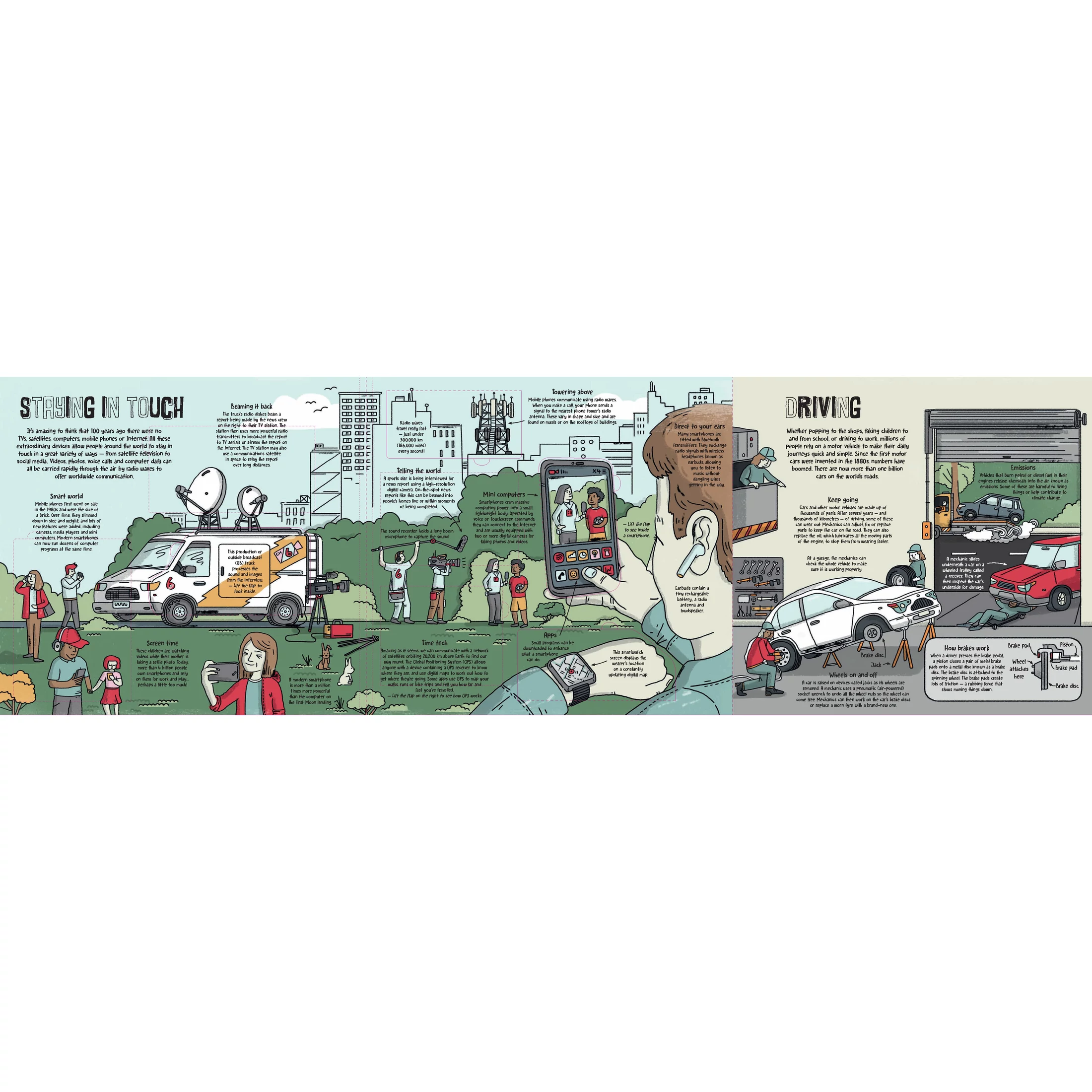 Full-page gatefolds showcase large, dense scenes while smaller flaps can be opened to uncover the secrets of the latest gizmos and gadgets. Explore a home, a building site, a factory, a shopping mall, an office and a busy street; find out how a car, a computer, a conveyor belt and mobile phone work, and much more!