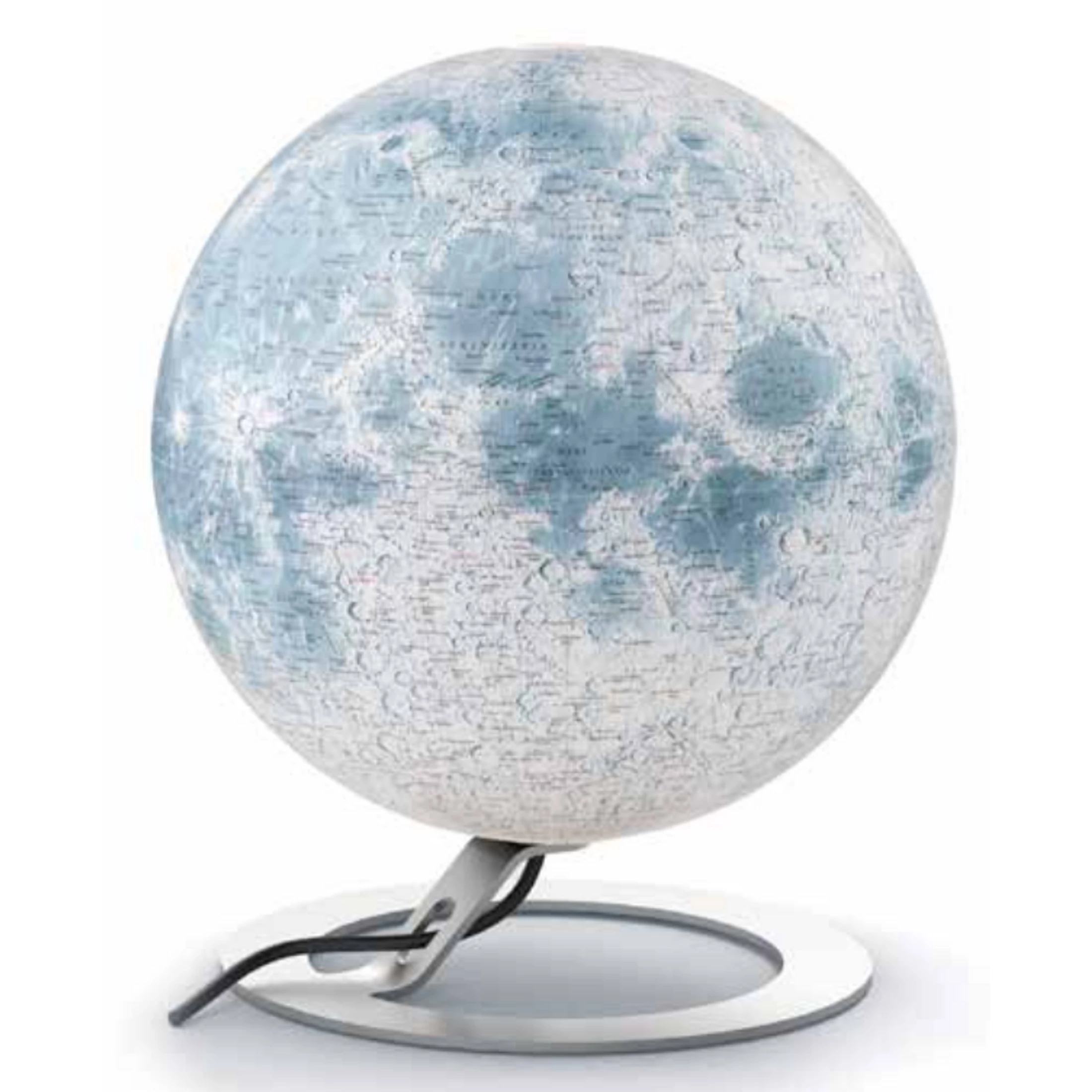 Holdat ábrázoló világító gömb, dekoratív kör alakú fém talppal. Átmérője 30 cm, magassága 37 cm, angol és latin nyelvű.