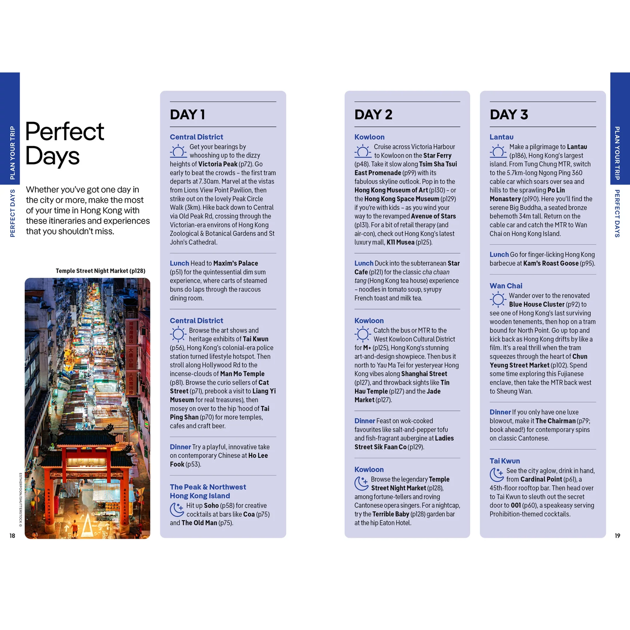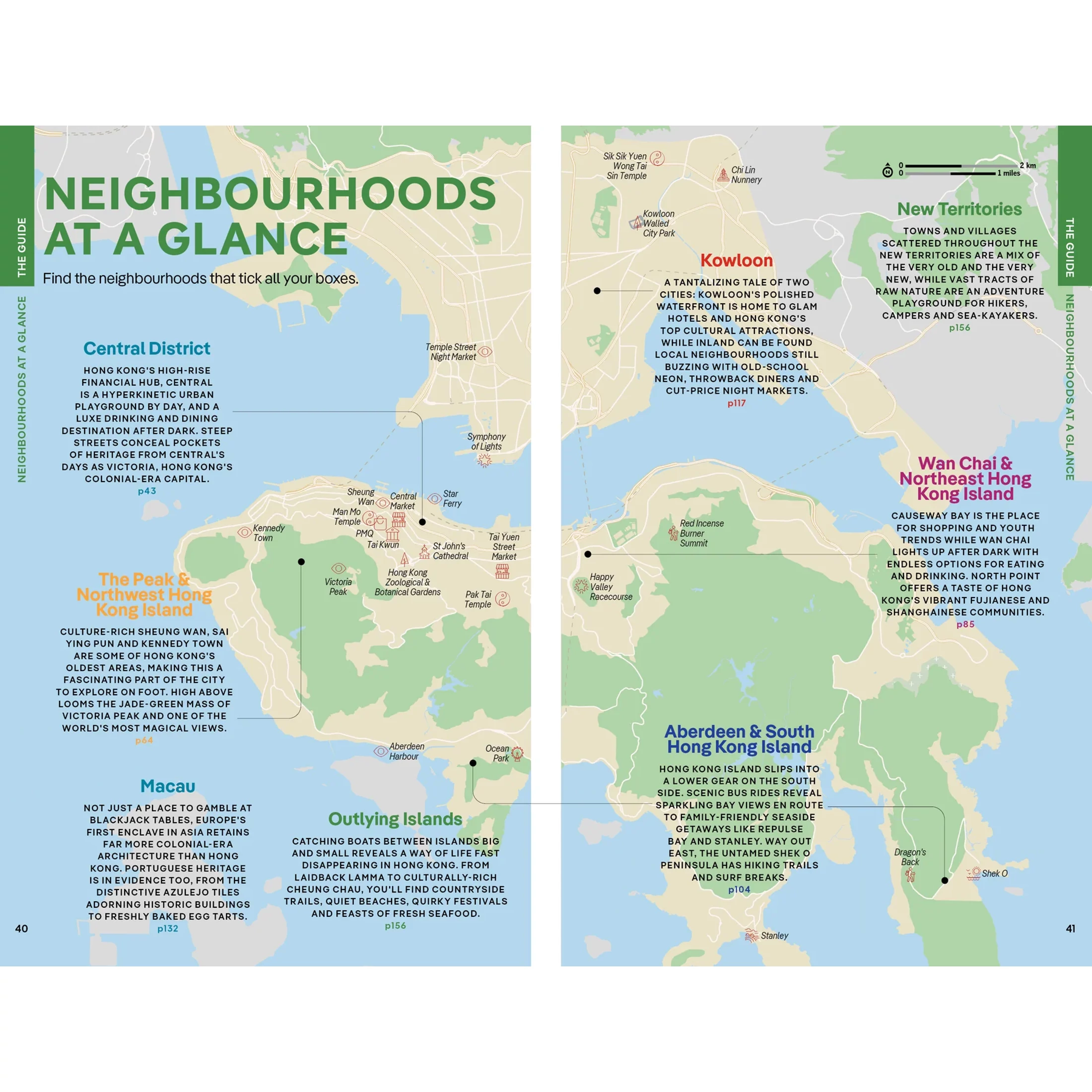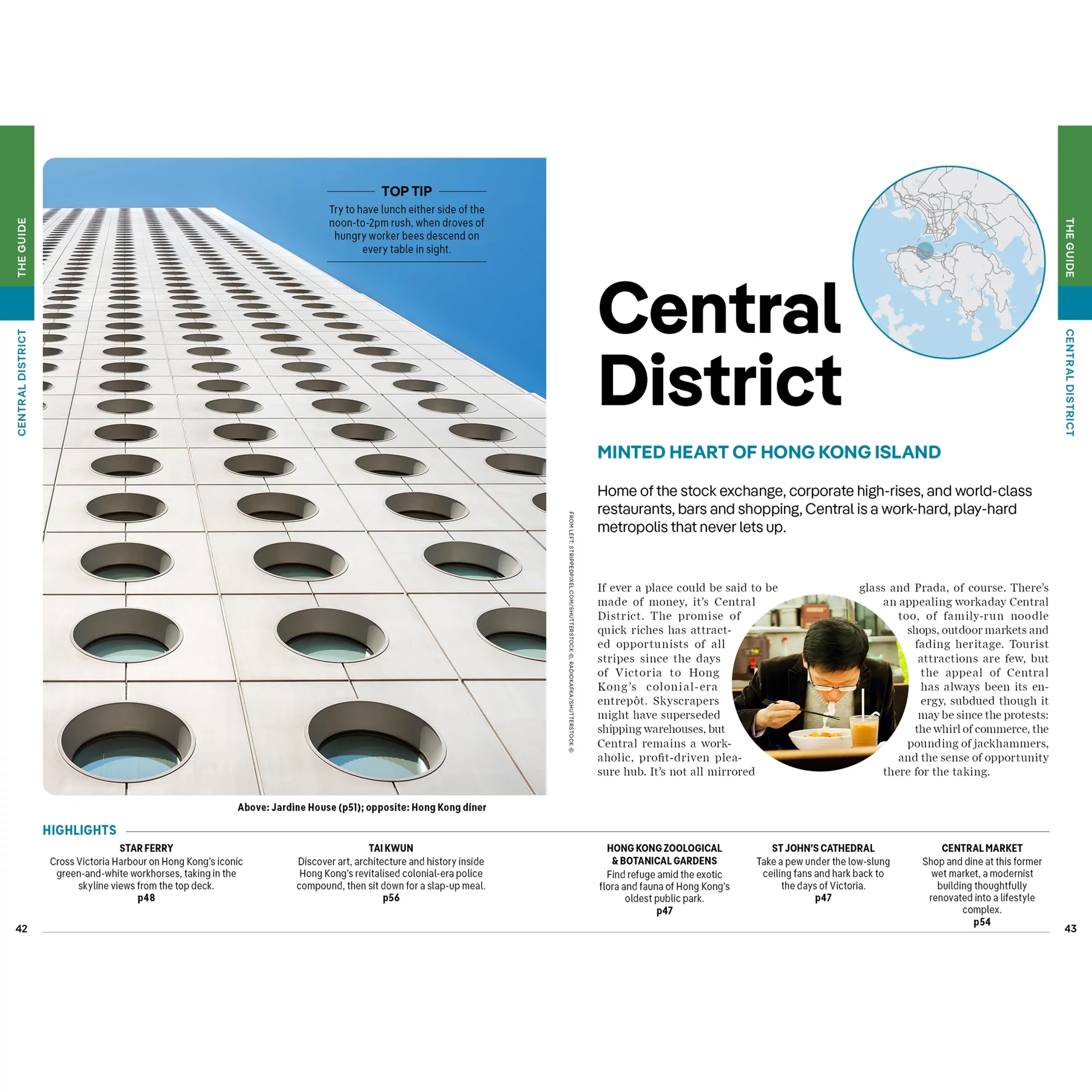 Covers: Central District; The Peak & Northwest Hong Kong Island; Wan Chai & Northeast Hong Kong Island; Aberdeen & South Hong Kong Island; Kowloon; Macau plus day trips to Tuen Mun; Yuen Long; Mai Po Wetlands; Fanling & Sheung Shui; Sha Tau Kok; Sai Kung; Hong Kong Geopark; Tai Po; Sha Tin; Tung Ping Chau; Clearwater Bay; Tsuen Wan; Tai Mo Shan; Tai O; Mui Wo & Discovery Bay; Hong Kong Disneyland; Big Buddha & Po Lin Monastery; Lamma; Cheung Chau