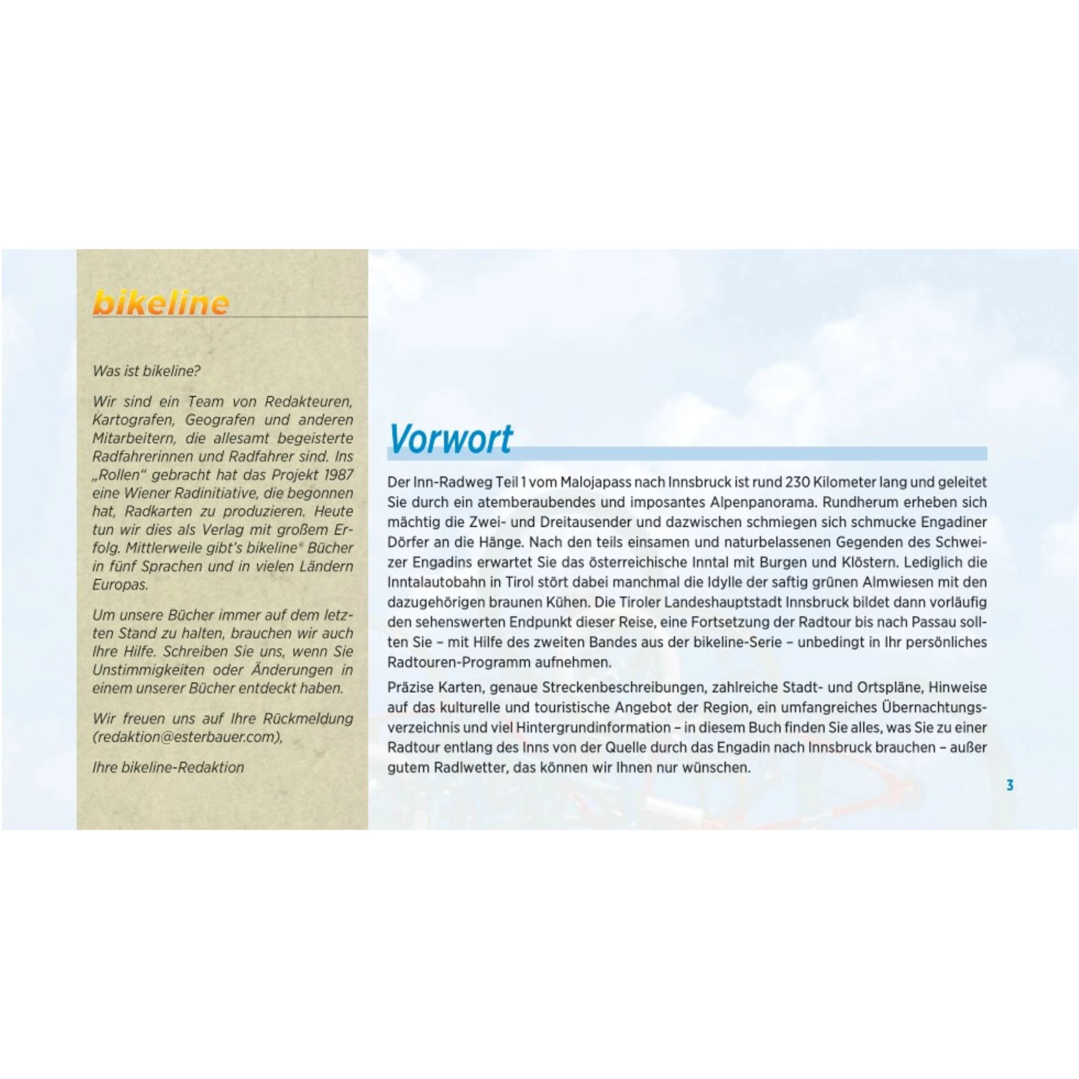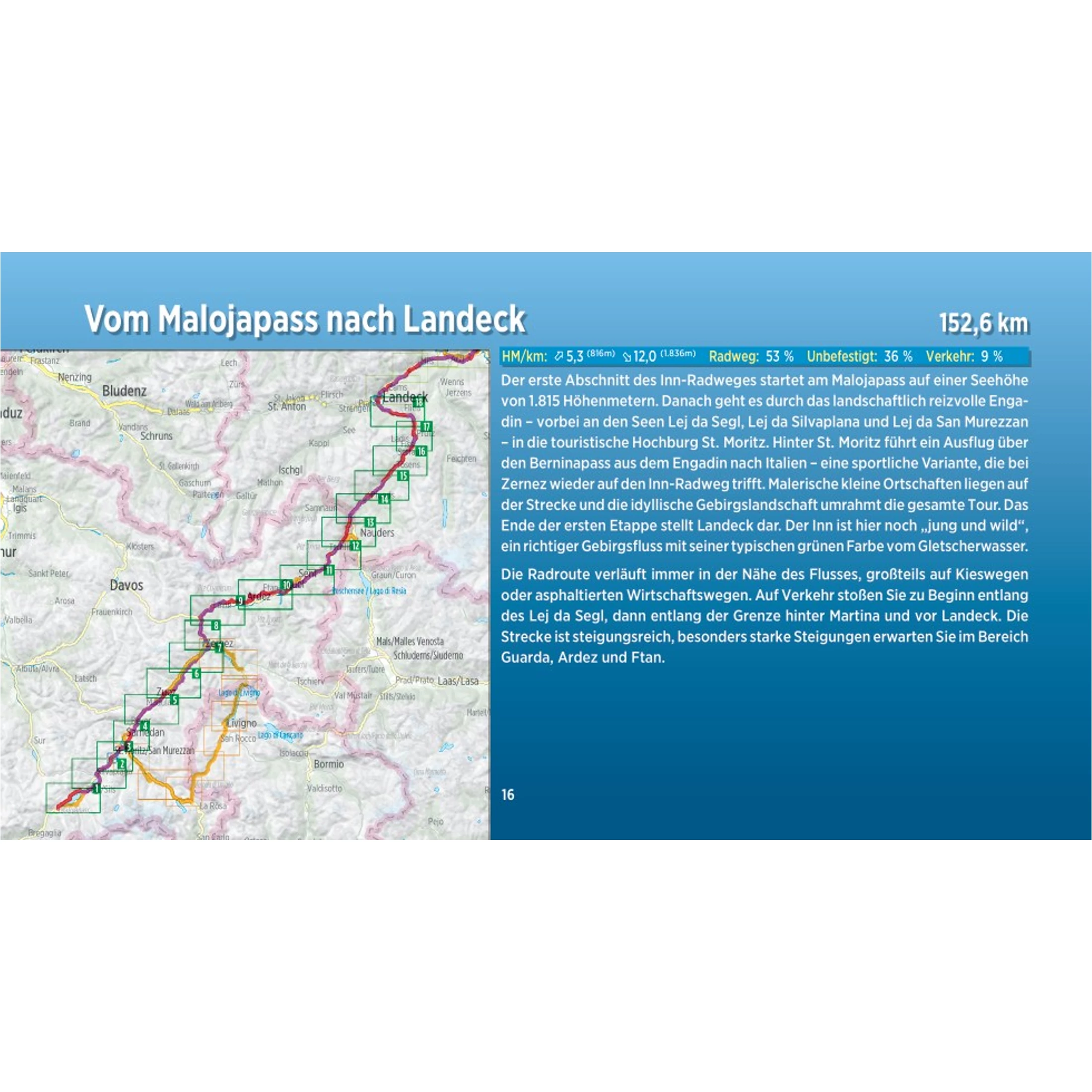 Der Inn-Radweg Teil 1 vom Malojapass nach Innsbruck ist rund 230 Kilometer lang und geleitet Sie durch ein atemberaubendes und imposantes Alpenpanorama. Rundherum erheben sich mächtig die Zwei- und Dreitausender und dazwischen schmiegen sich schmucke Engadiner Dörfer an die Hänge. Nach den teils einsamen und naturbelassenen Gegenden des Schweizer Engadins erwartet Sie das österreichische Inntal mit Burgen und Klöstern. Lediglich die Inntalautobahn in Tirol stört dabei manchmal die Idylle der saftig grünen Almwiesen mit den dazugehörigen braunen Kühen. Die Tiroler Landeshauptstadt Innsbruck bildet dann vorläufig den sehenswerten Endpunkt dieser Reise, eine Fortsetzung der Radtour bis nach Passau sollten Sie – mit Hilfe des zweiten Bandes aus der bikeline-Serie – unbedingt in Ihr persönliches Radtouren-Programm aufnehmen.