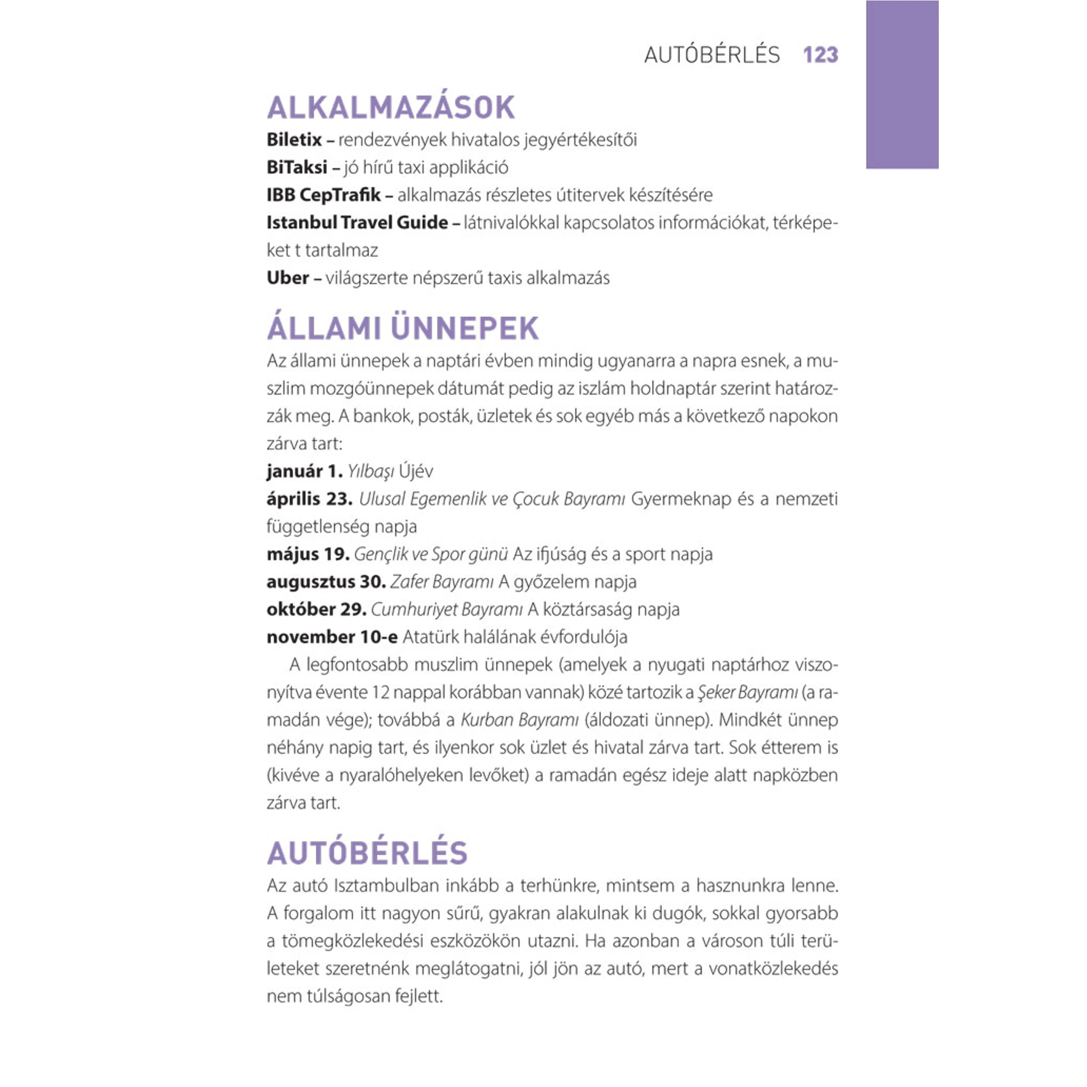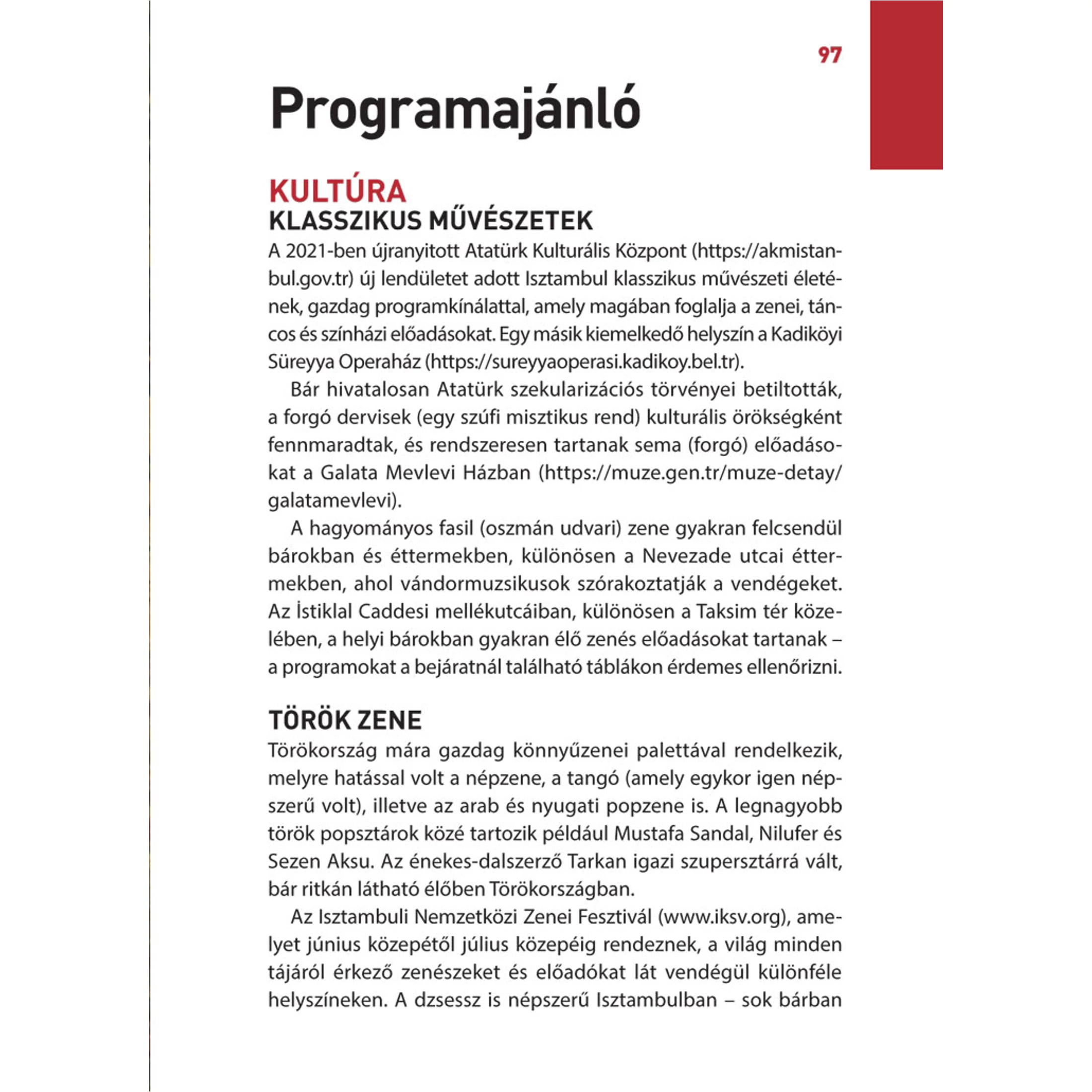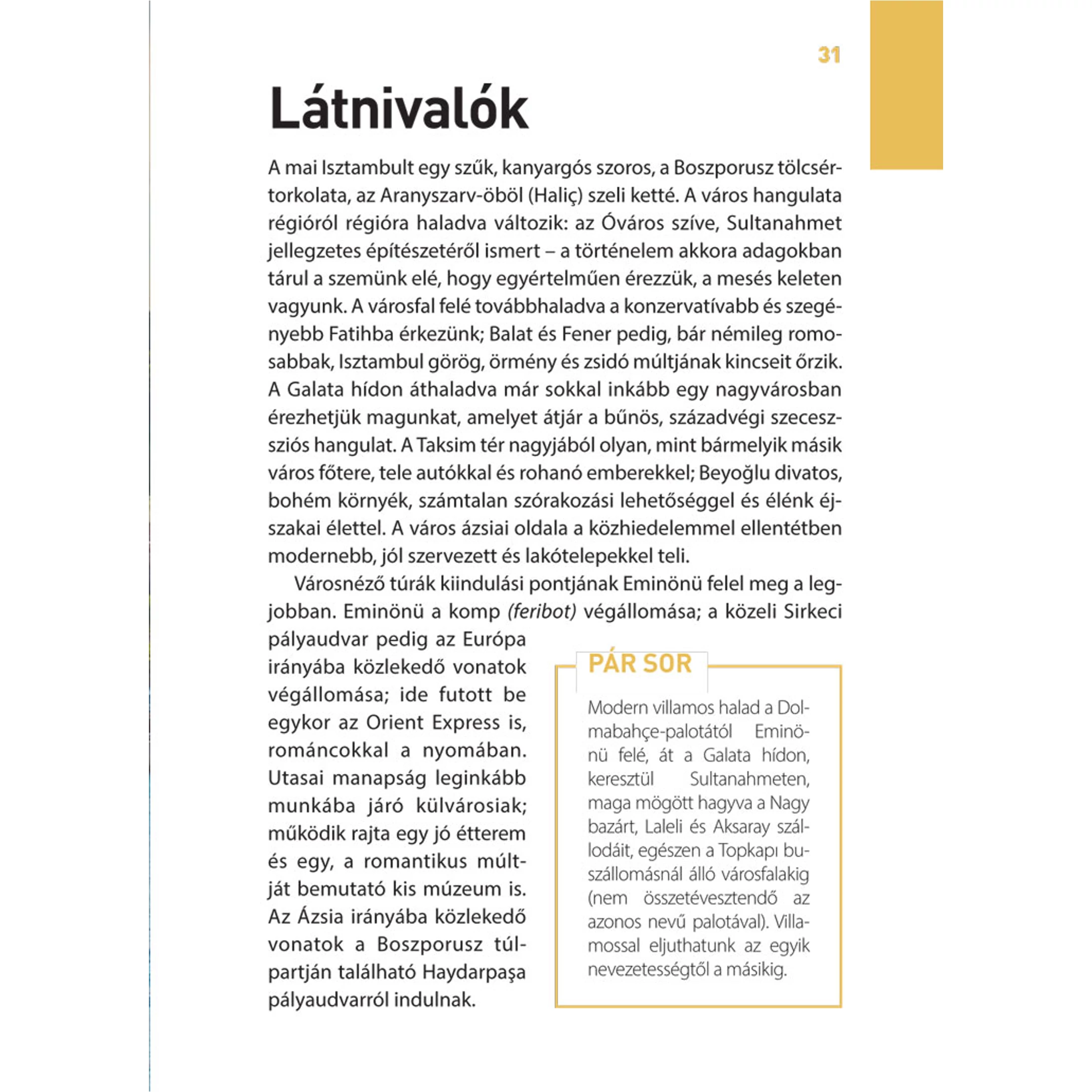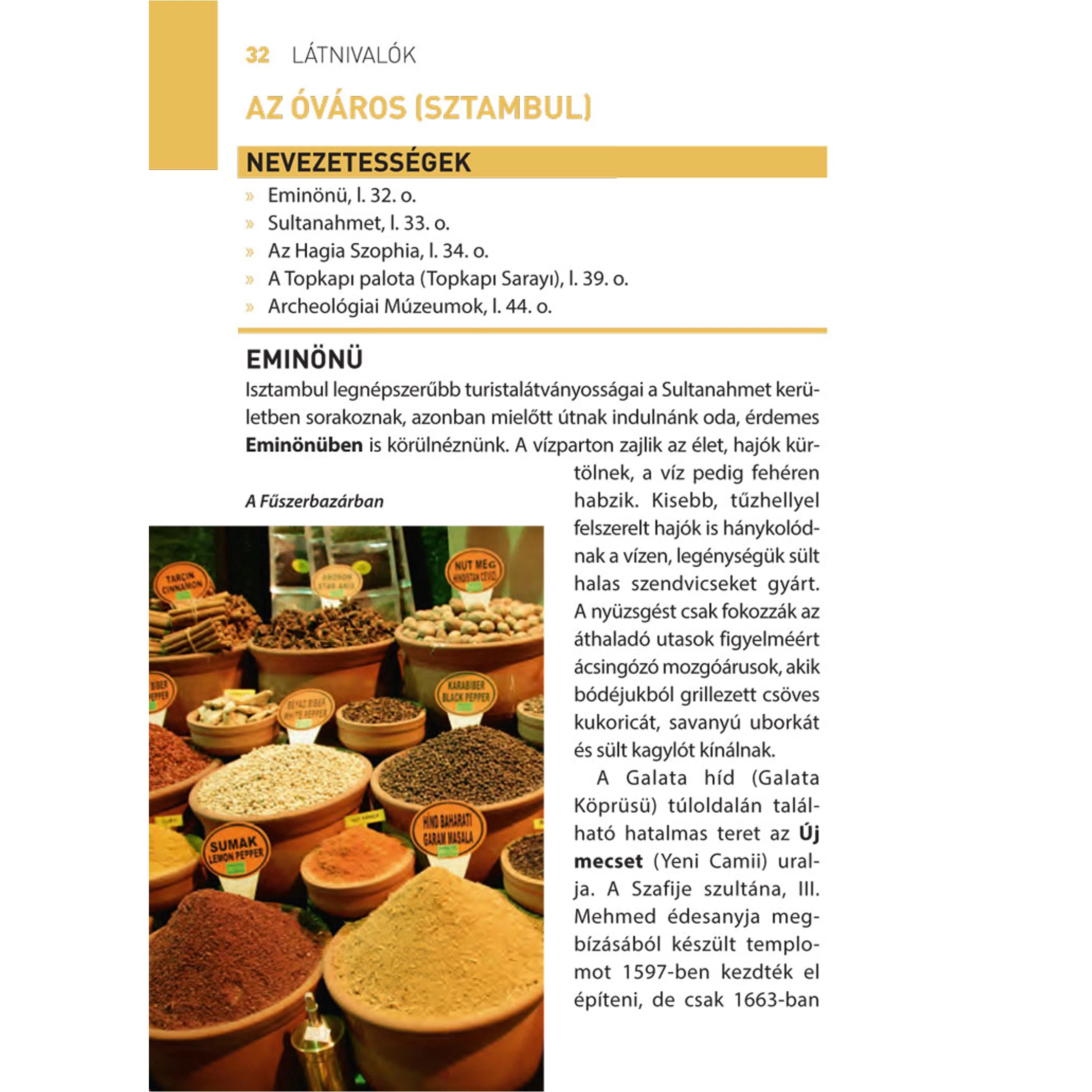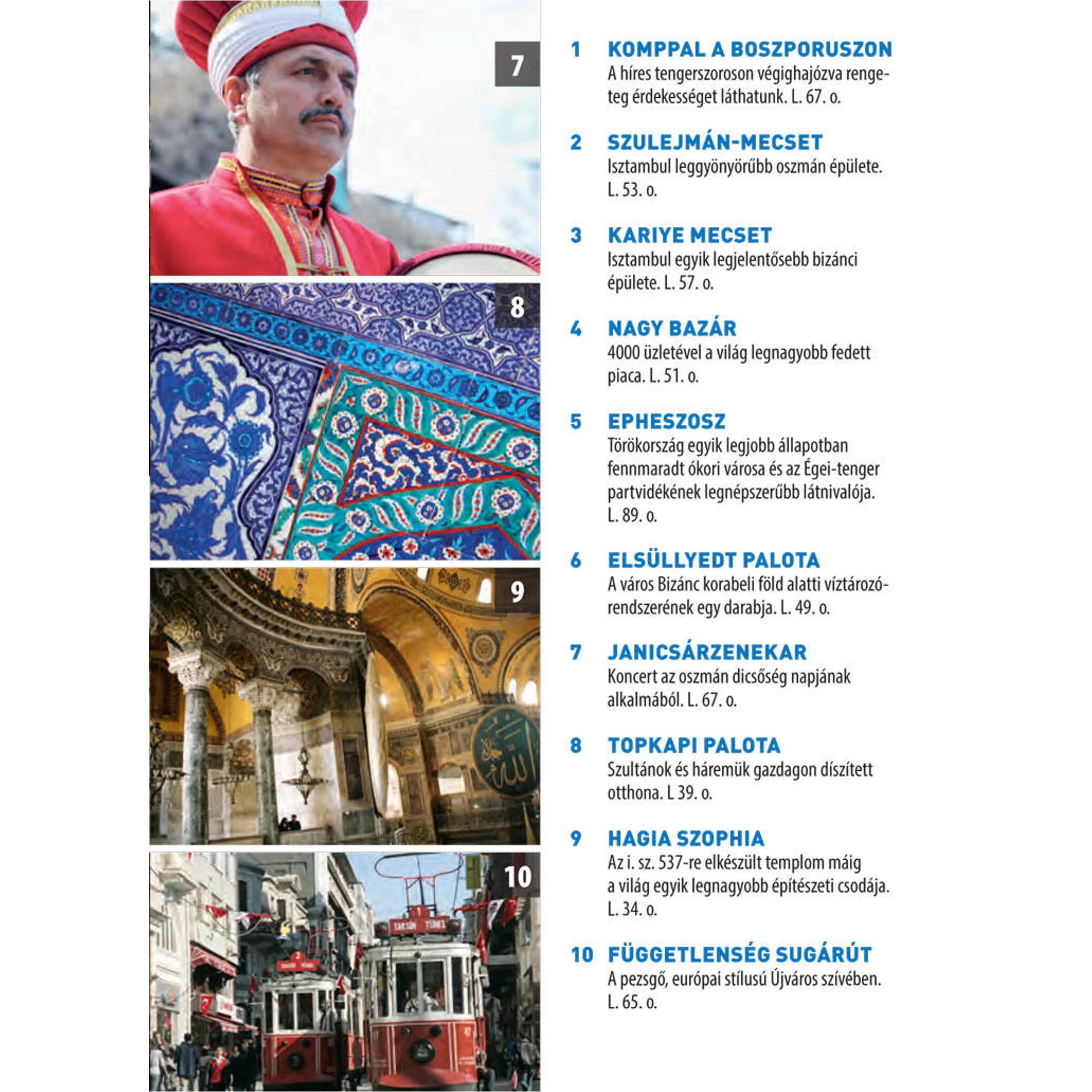 Barangoljon velünk Törökországban! Legújabb útikönyvünk segítségével tervezze meg ideális napjait és fedezze fel a történelmi Törökország építészeti kincseit. Sétáljon fel a lépcsőkön az építészeti csoda képtárába, majd vegye az irányt a Szulejmán-mecset felé. Látogasson el az 500 éves nyüzsgő bazárba, és vásároljon a világ legnagyobb fedett piacán. Legújabb útikönyvünknek köszönhetően ismerkedjen meg Törökország gazdag múltjával, és fedezze fel az ország kultúráját és szokásait. Útikönyvünk mindamellett, hogy hasznos utazási tanácsokkal látja el, nélkülözhetetlen szállás- és étkezési javaslatokkal, valamint hasznos programajánlóval is szolgál mindazok számára, akik szeretnek vásárolni, szórakozni, sportolni.