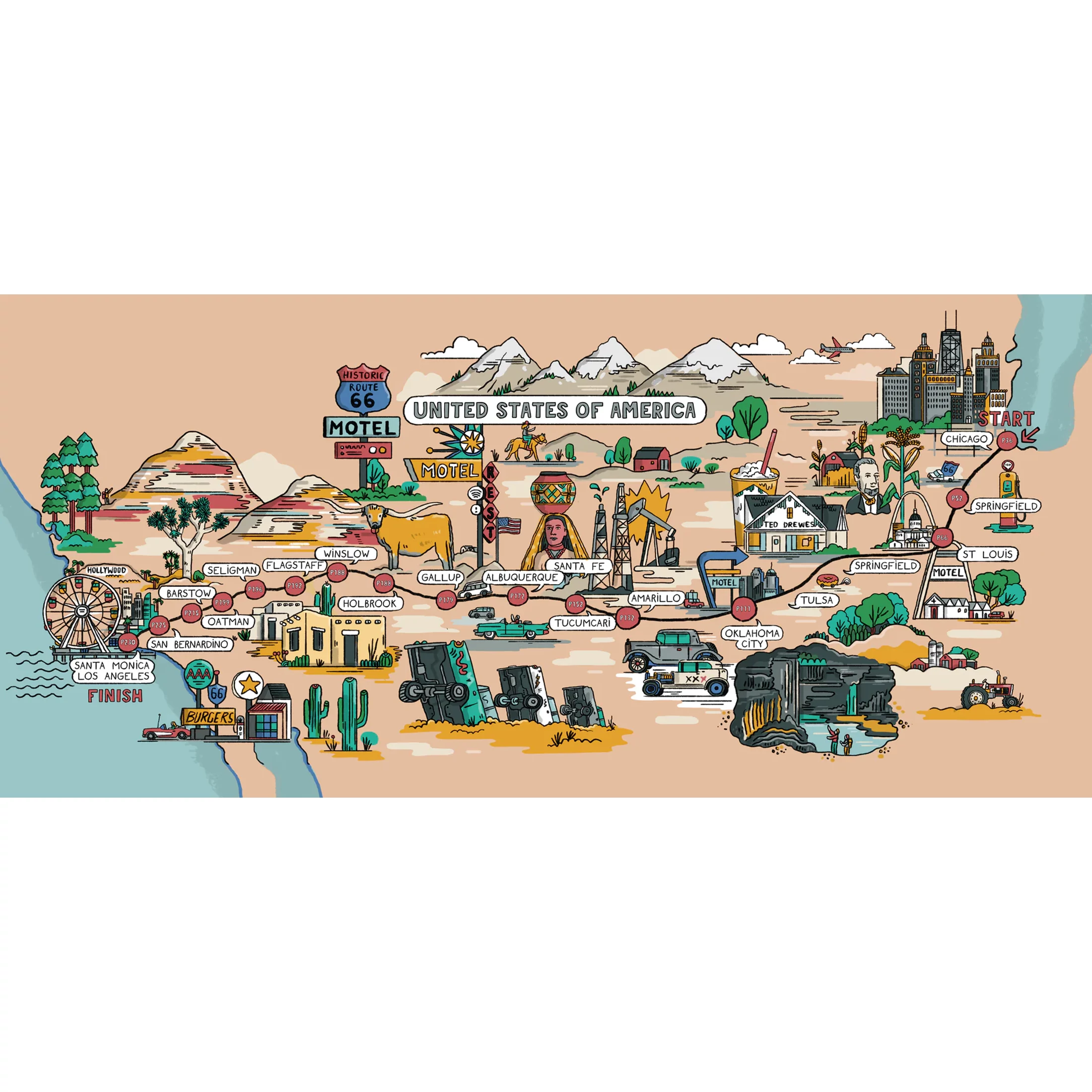 • Covers: Chicago to St Louis; St Louis to Joplin; Galena to Tulsa; Tulsa to Texola; Texola to Glenrio; Glenrio to Albuquerque; Albuquerque to Gallup; Lupton to Topock; Needles to Barstow; Barstow to Santa Monica; LA