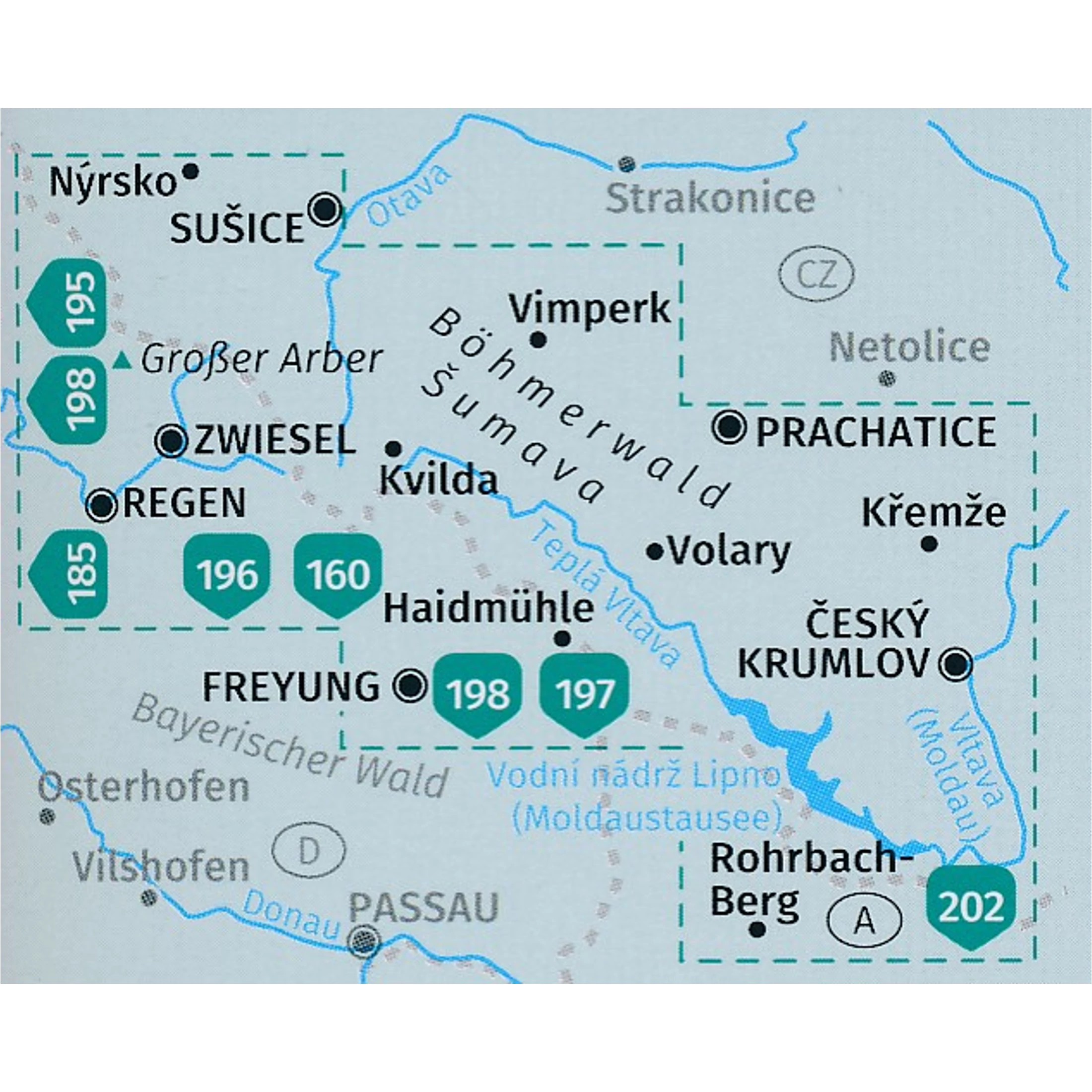 Városok/falvak/területek: Nyrsko, Susice, Zwiesel, Regen, Kvilda, Vimperk, Prachatice, Kremze, Volary, Cesky Krumlov, Haidmühle, Freyung, Rohrbach-Berg