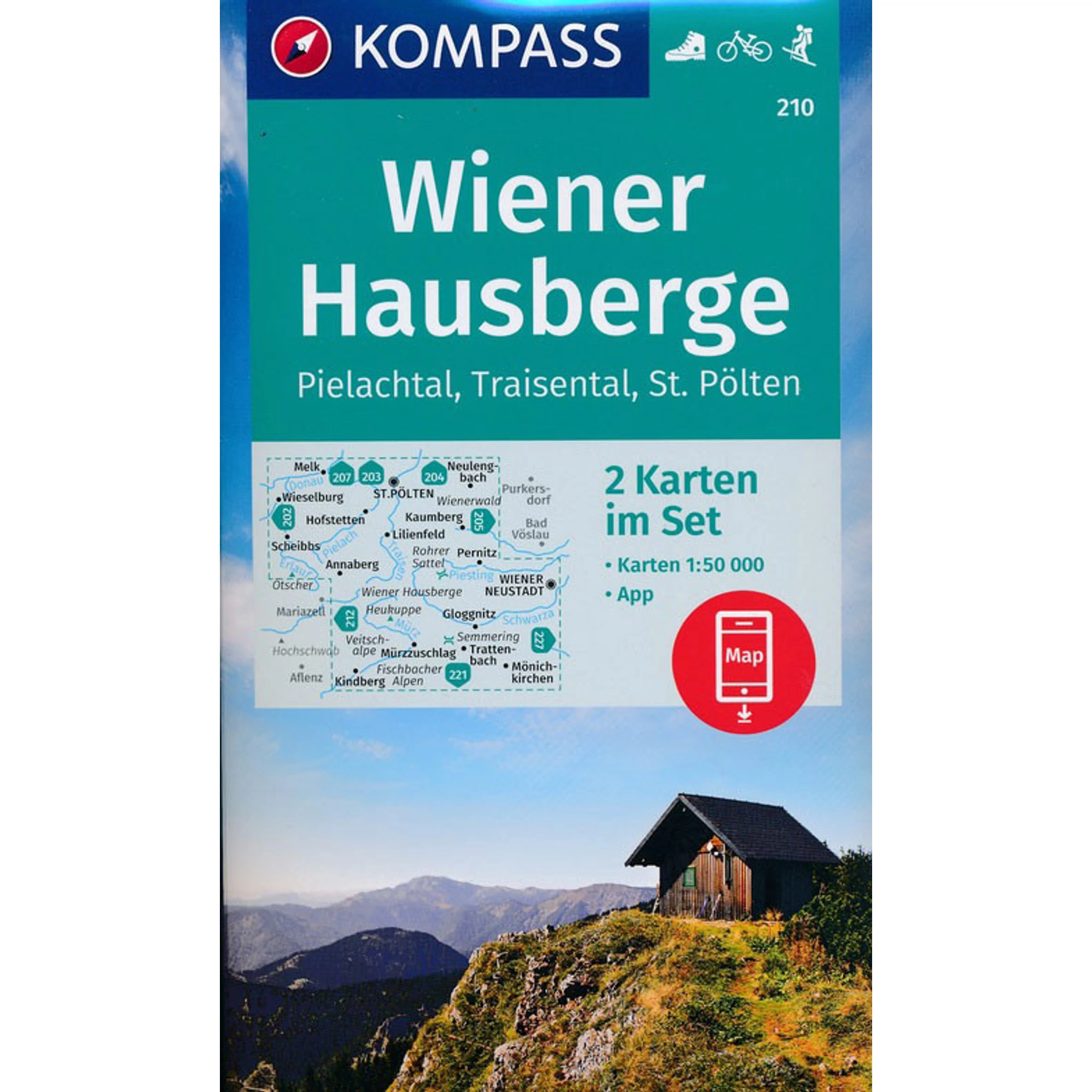 A Wiener Hausberge (Pielachtal, Traisental, St. Pölten) túra-, és kerékpáros útvonalai, színes képekkel illusztrált információs füzettel kiegészítve, melyben további információk találhatók menedékházakról, helyi nevezetességekről, szabadidős tevékenységekről.