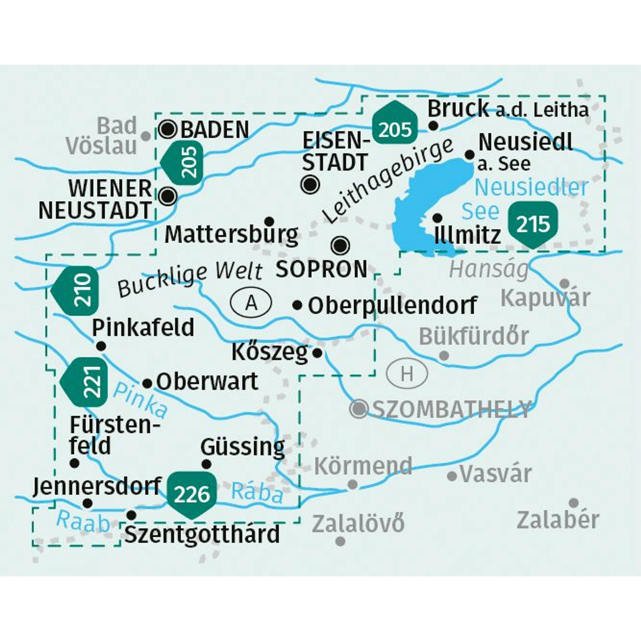Burgenland (2 részes térképszett) túra-, és kerékpáros útvonalai, színes képekkel illusztrált információs füzettel kiegészítve, melyben további információk találhatók menedékházakról, helyi nevezetességekről, szabadidős tevékenységekről.