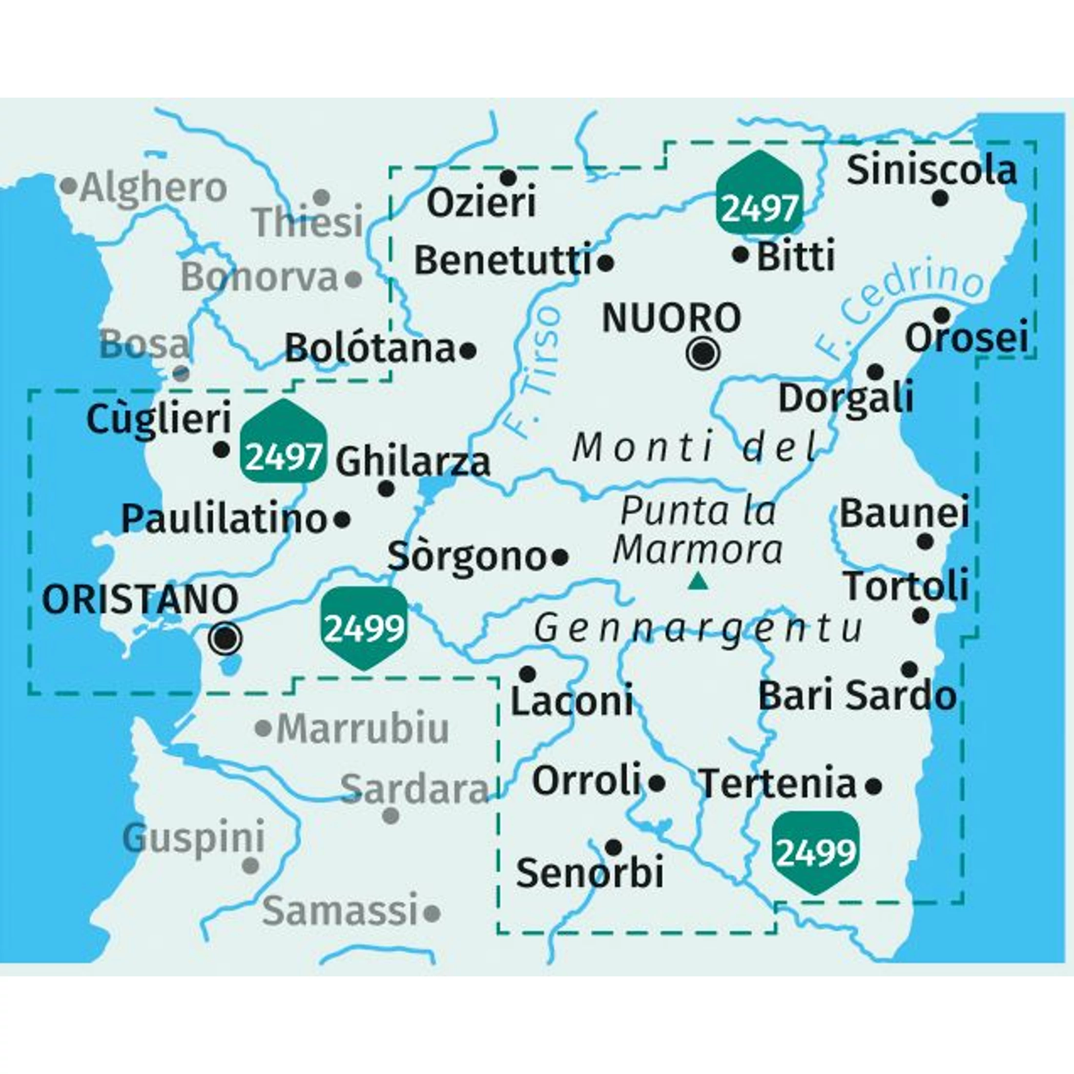Szardínia középső területének (4 részes térképszett) túra-, és kerékpáros útvonalai, színes képekkel illusztrált információs füzettel kiegészítve, melyben további információk találhatók helyi nevezetességekről, szabadidős tevékenységekről.