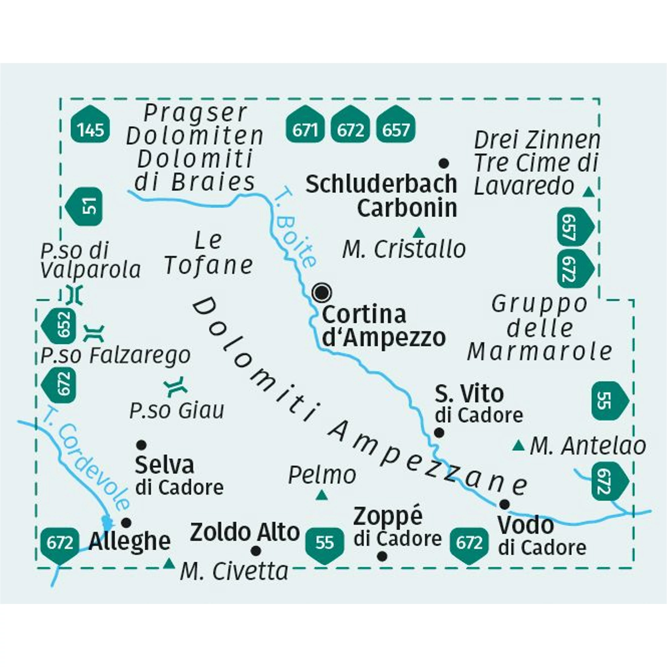 Az olaszországi Cortina d'Ampezzo túra-, és kerékpáros útvonalai, színes képekkel illusztrált információs füzettel kiegészítve, melyben további információk találhatók menedékházakról, helyi nevezetességekről, szabadidős tevékenységekről. Vízálló, erős anyagból készült.