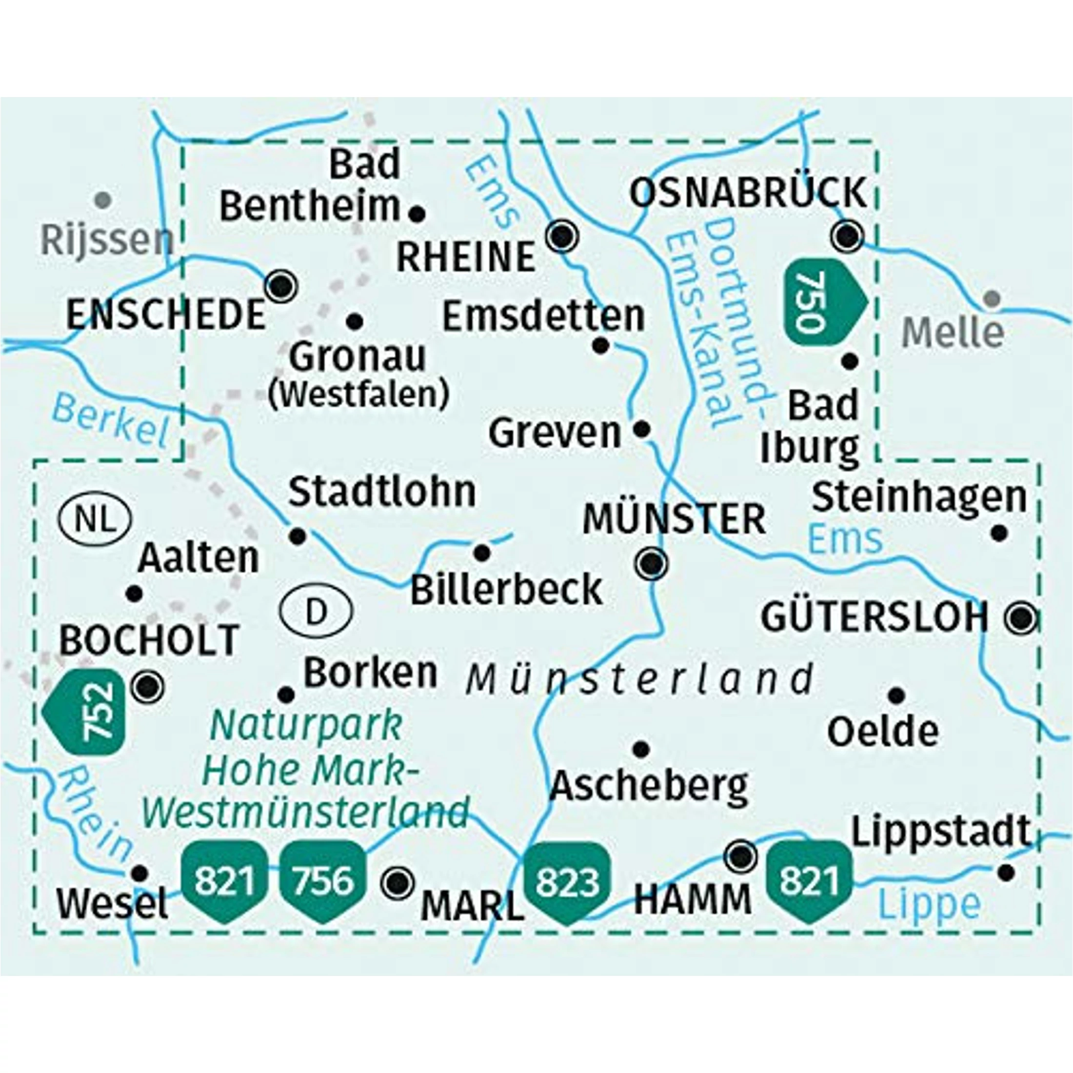 Városok/falvak: Bad Bentheim, Enschede, Rheine, Osnabrück, Ems, Dortmund-Ems csatorna, Emsdetten, Gronau, Greven, Bad Iburg, Steinhagen, Münster, Stadtlohn, Aalten, Bocholt, Borken, Gütersloh, Wesel, Berkel, Rajna, Marl, Hamm, Lippstadt, Lippe, Hohe Mark-Westmünsterland természetvédelmi park