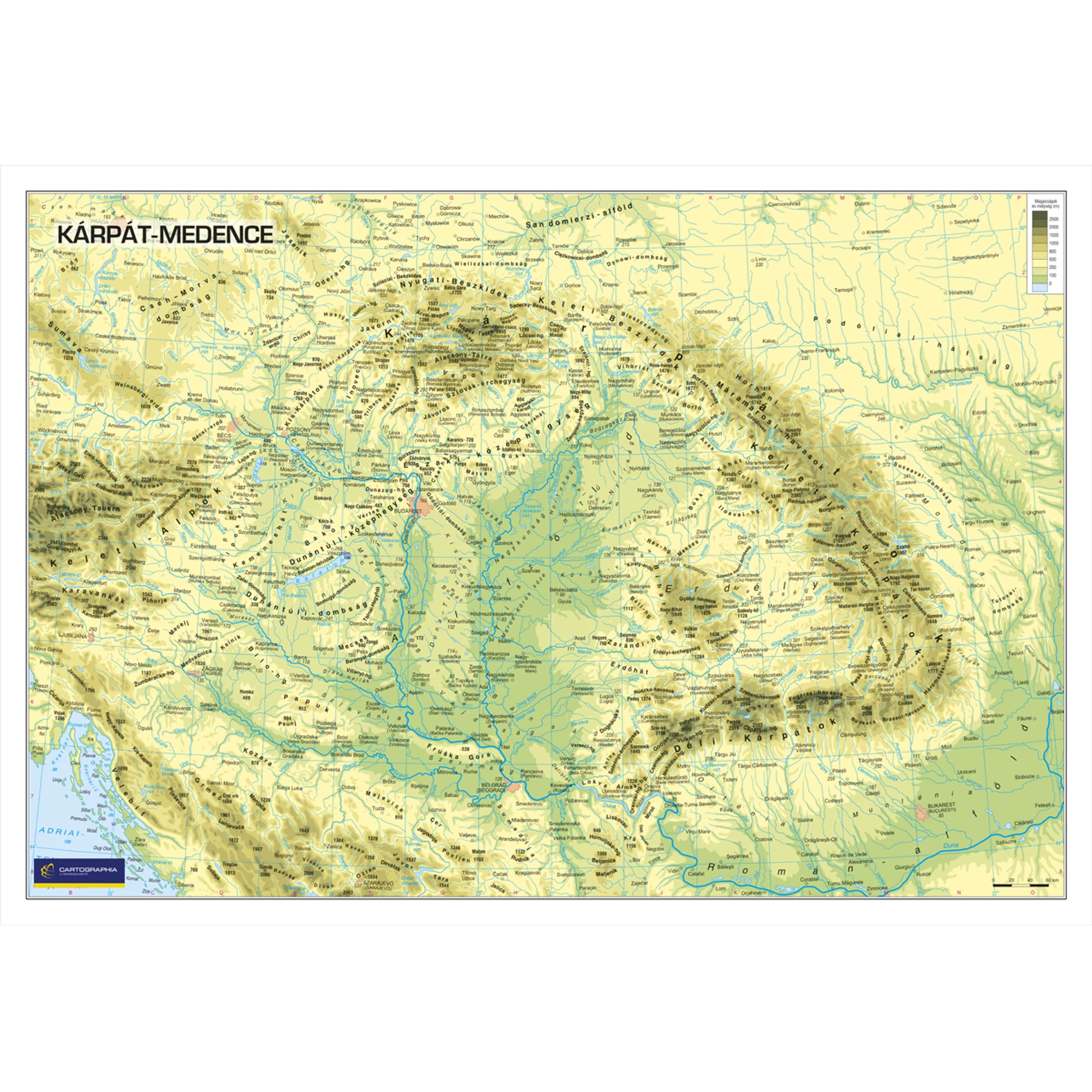 Kárpát-medence domborzata határok nélkül falitérkép a Cartographia-tól.  Választható méretben és kivitelben, rendelésre is.