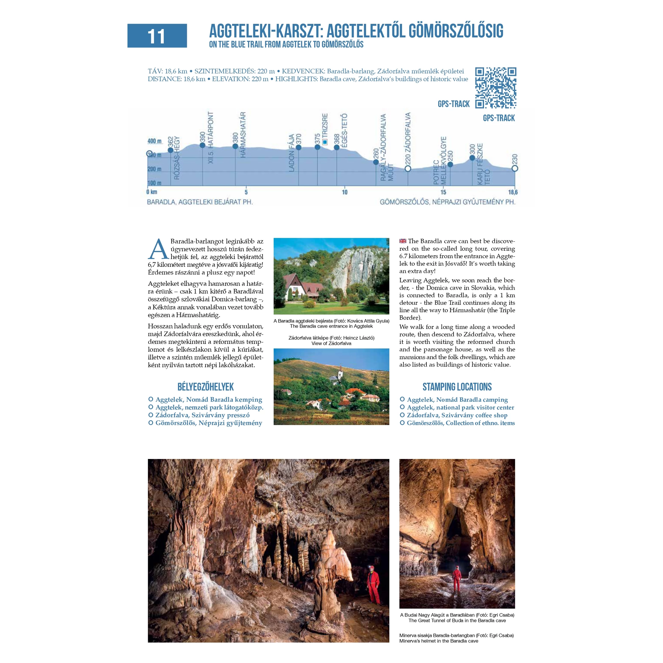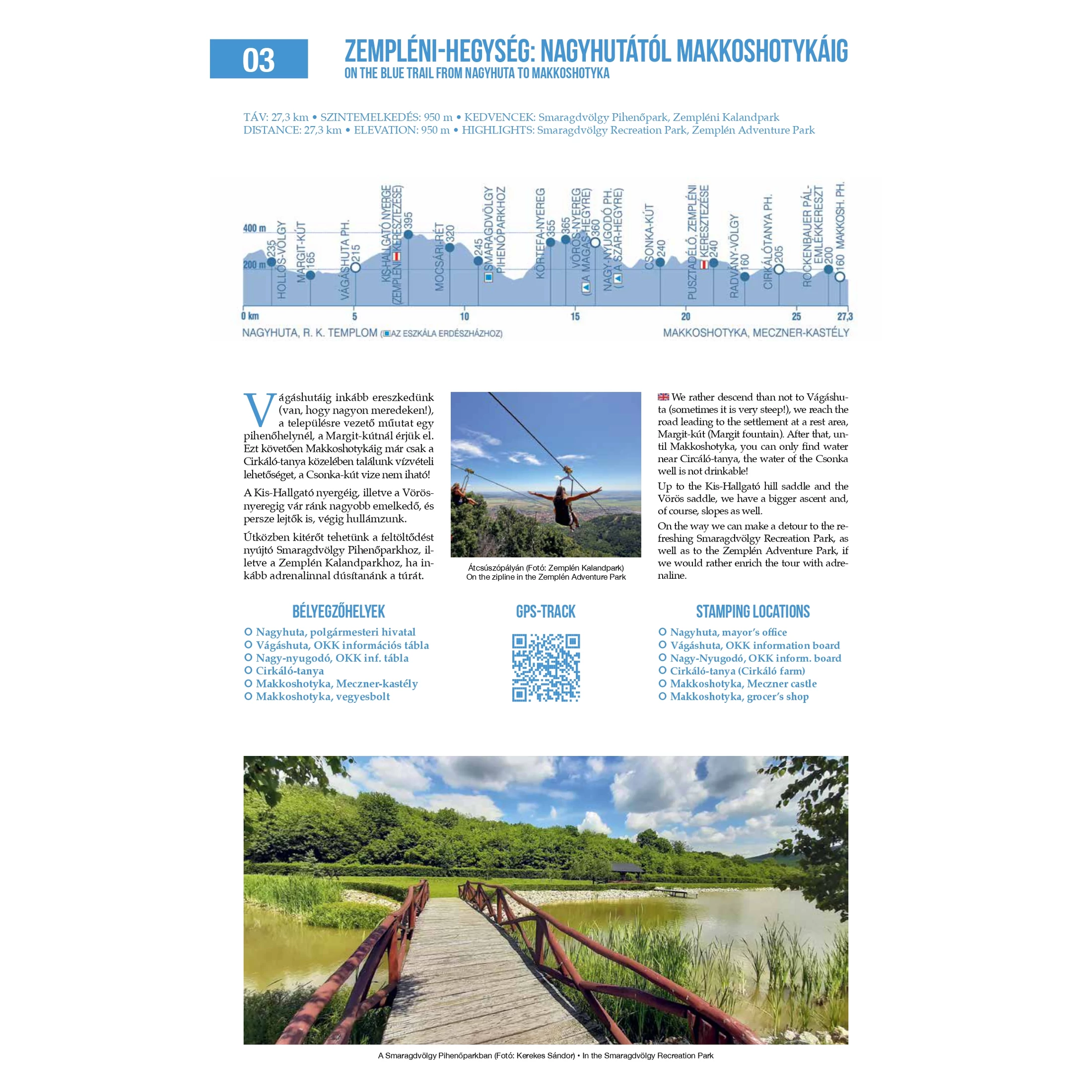 A középső harmadban a szakasz leírását találod, a bélyegzőhelyeket magyarul és angolul is, ha esetleg magyarul nem tudó túratárssal indulnál útnak.