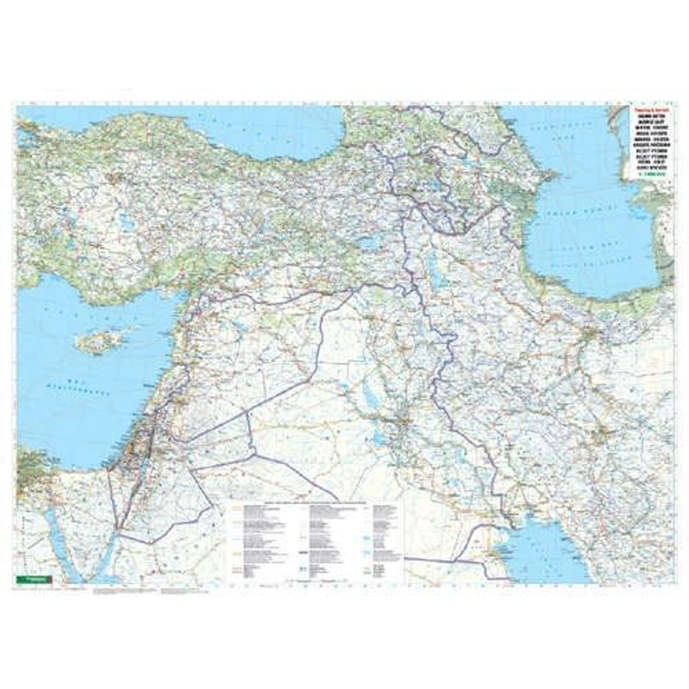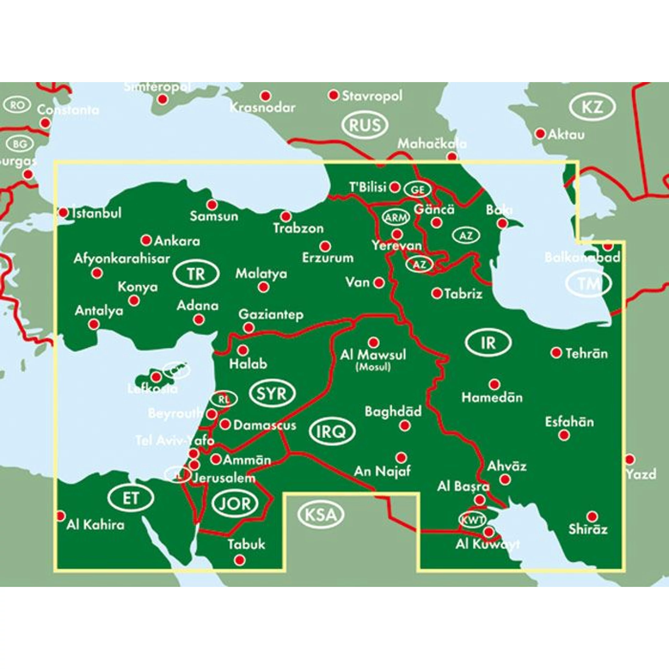 A Közel-Kelet 1:2.000.000 méretarányú térképe a letisztult kialakítás mellett számos kiegészítő információval is rendelkezik, mint például az útviszonyok, a látnivalók és a különböző városközpontok térképei. Az átfogó helymutató is segít a gyors tájékozódásban. Lefedett országok: Irak, Irán, Kuvait, Izrael, Jordánia, Libanon, Szíria, Törökország, Ciprus, Grúzia, Örményország, Azerbajdzsán.