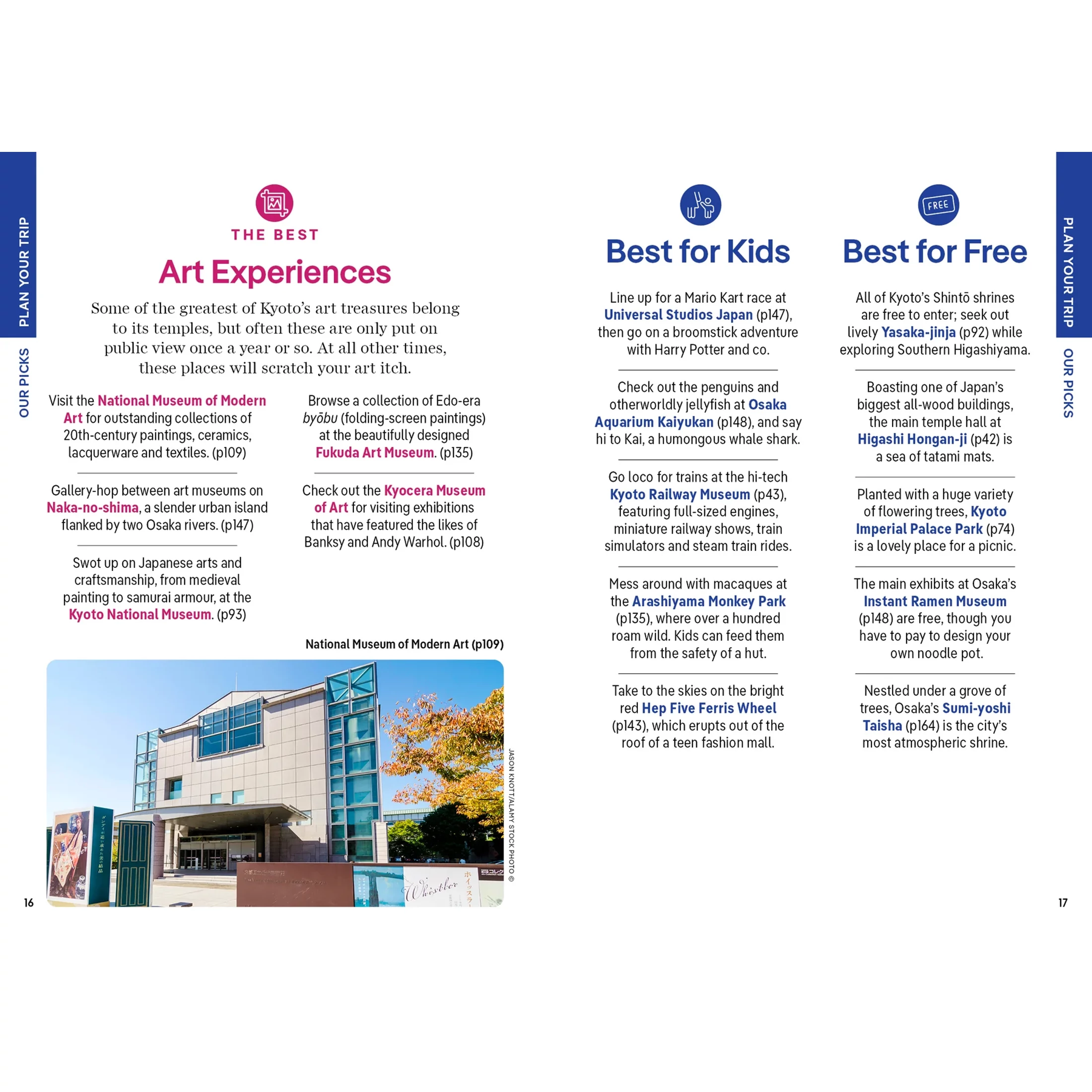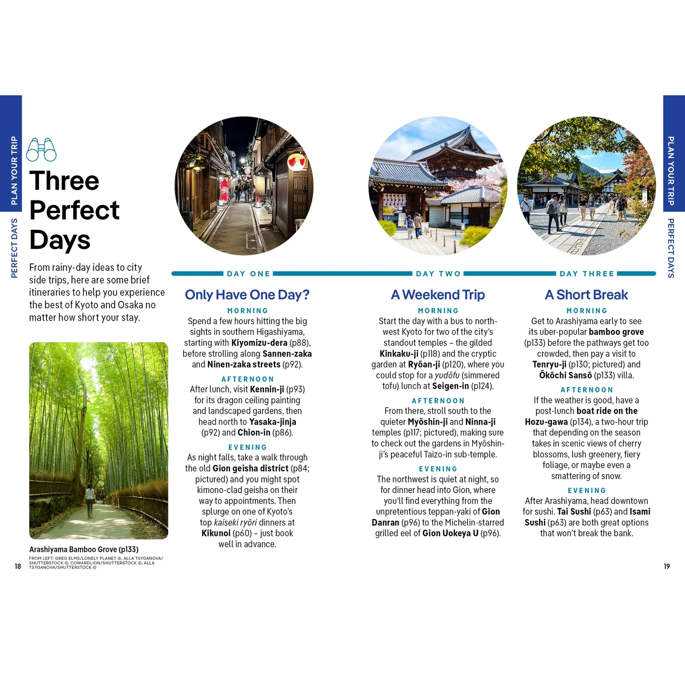 Covers: Kyoto - Kyoto Station & South Kyoto; Downtown Kyoto; Imperial Palace & Around; Gion & Southern Higashiyama; Northern Higashiyama; Northwest Kyoto; Arashiyama & Sagano. Osaka - Kita; Minami