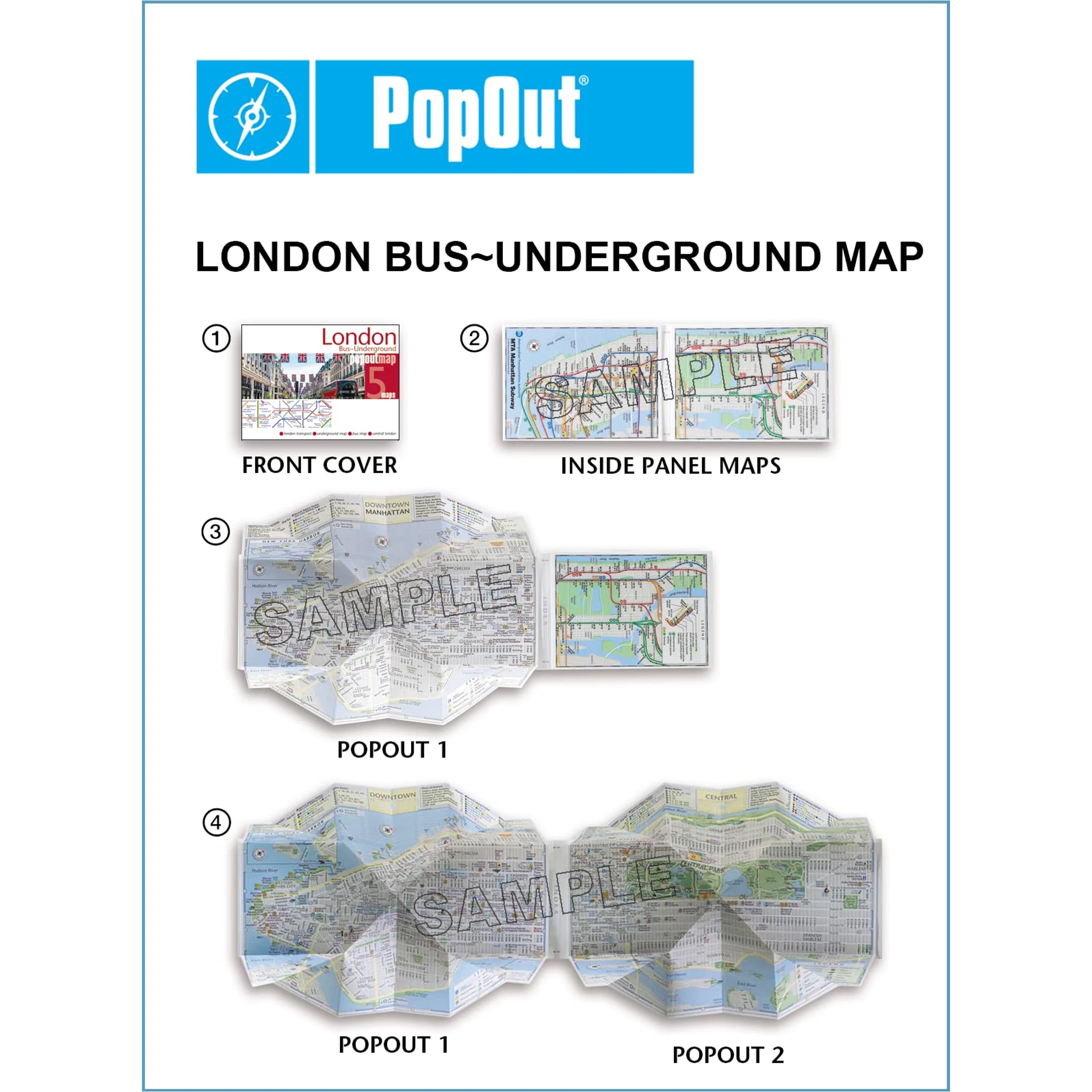 London buszútvonal PopOut térképe, a londoni metró PopOut térképe,fő buszútvonal térkép, külön földalatti térkép a városközpontról, London központjának áttekintő térképe
