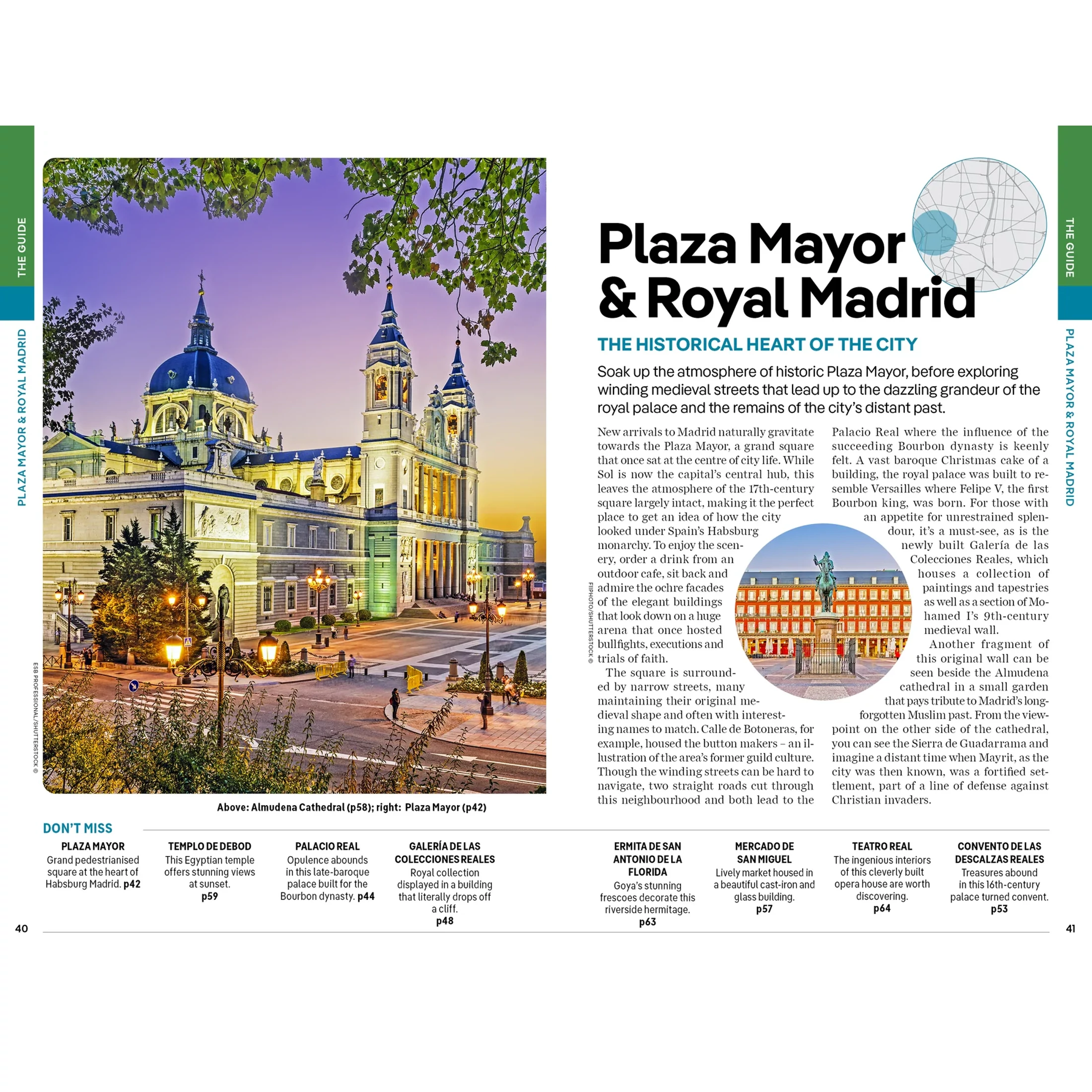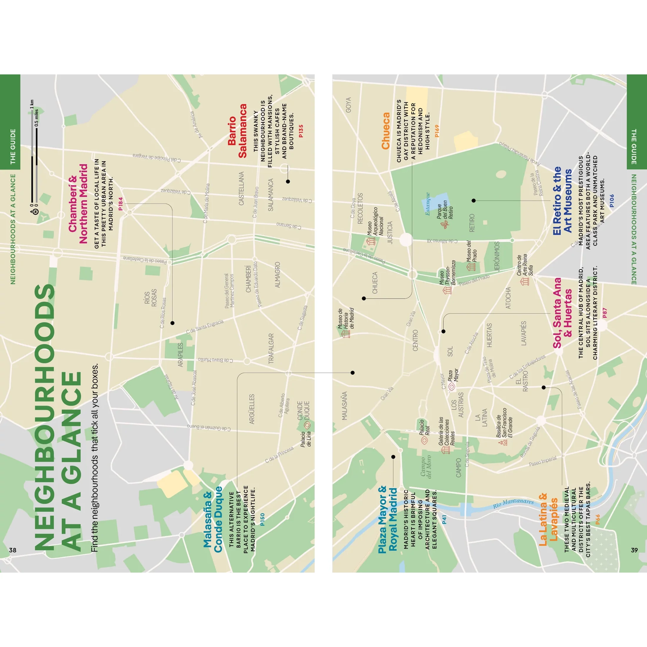 - Covers: Plaza Mayor & Royal Madrid; La Latina & Lavapiés; Sol, Santa Ana & Huertas; El Retiro & the Art Museums; Barrio Salamanca; Malasaña & Conde Duque; Chueca; Chamberí & Northern Madrid plus day trips to San Lorenzo de El Escorial; Chinchón; Toledo; Segovia; Ávila; Aranjuez; Sierra de Guadarrama; Alcalá de Henares; Sierra Pobre
