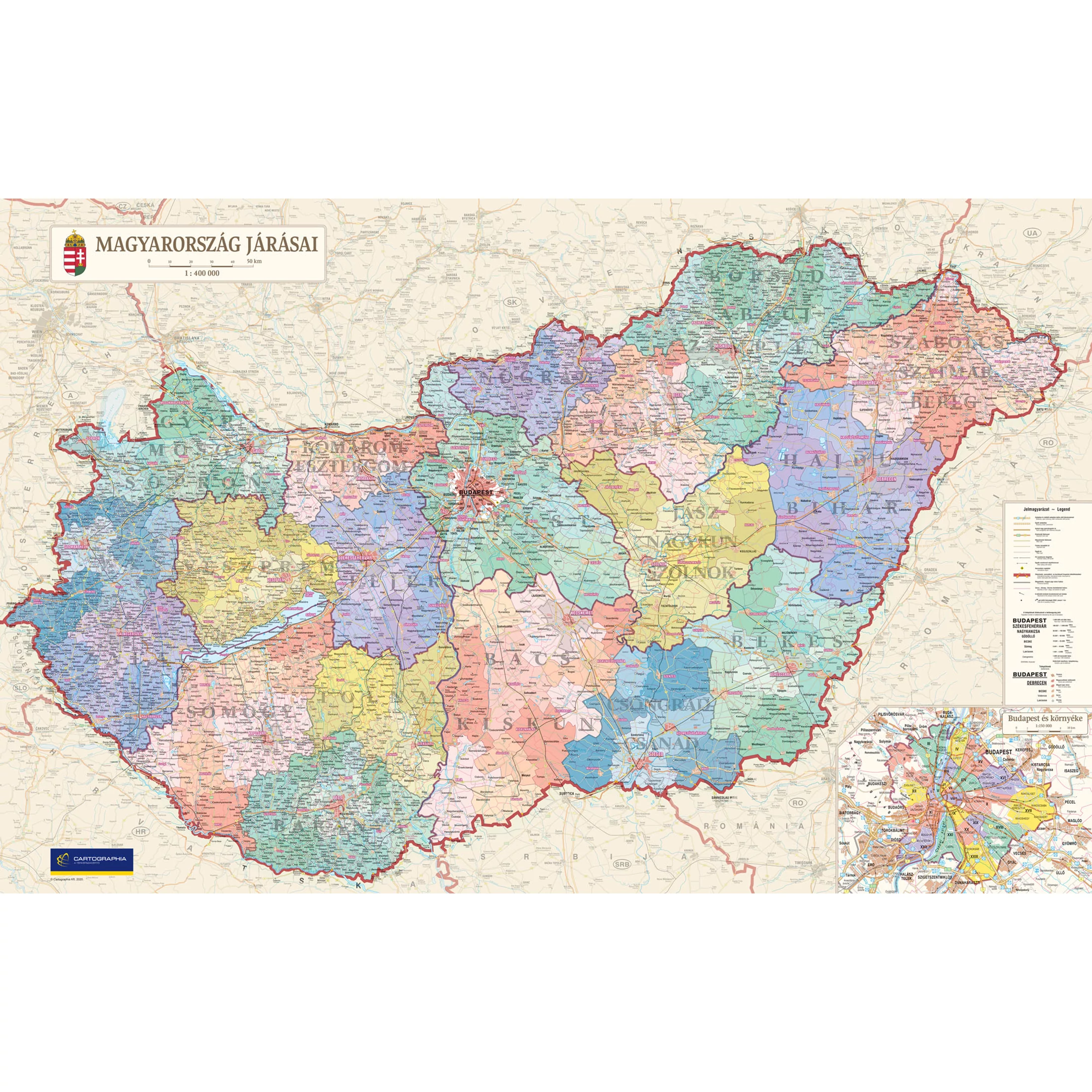 Magyarország járásai II. falitérkép 192x122 cm - fóliázott ív
