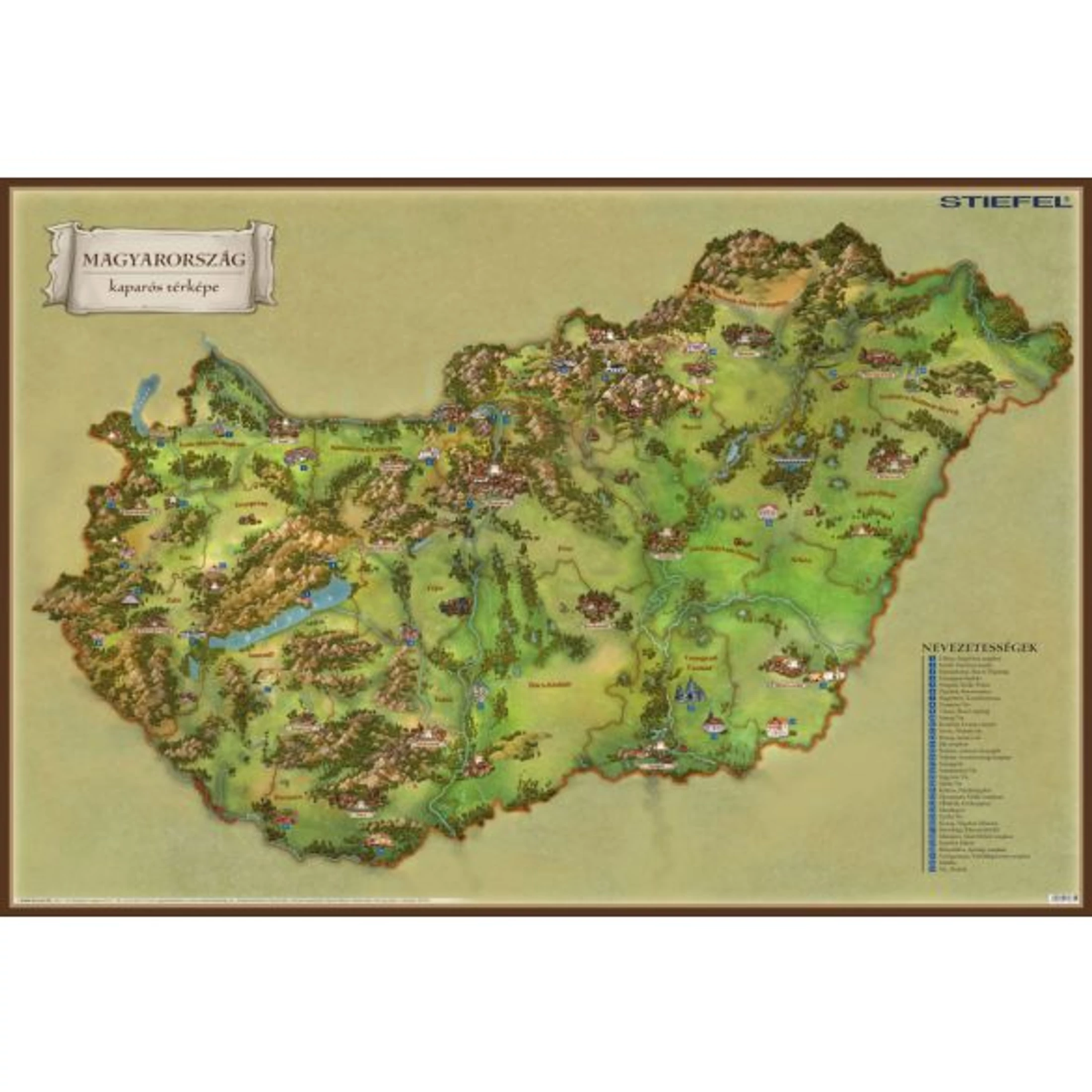 A Magyarország kaparós térképe részletesen kidolgozott grafikával mutatja be az ország történelmi nevezetességeit, kastélyait, várait. Mutatós színvilággal készült. Belföldi utazások, kalandozások megtervezéséhez is ideális. A térképen Magyarország megyéi, megyeszékhelyei, nagyobb folyói és tavai is szerepelnek.