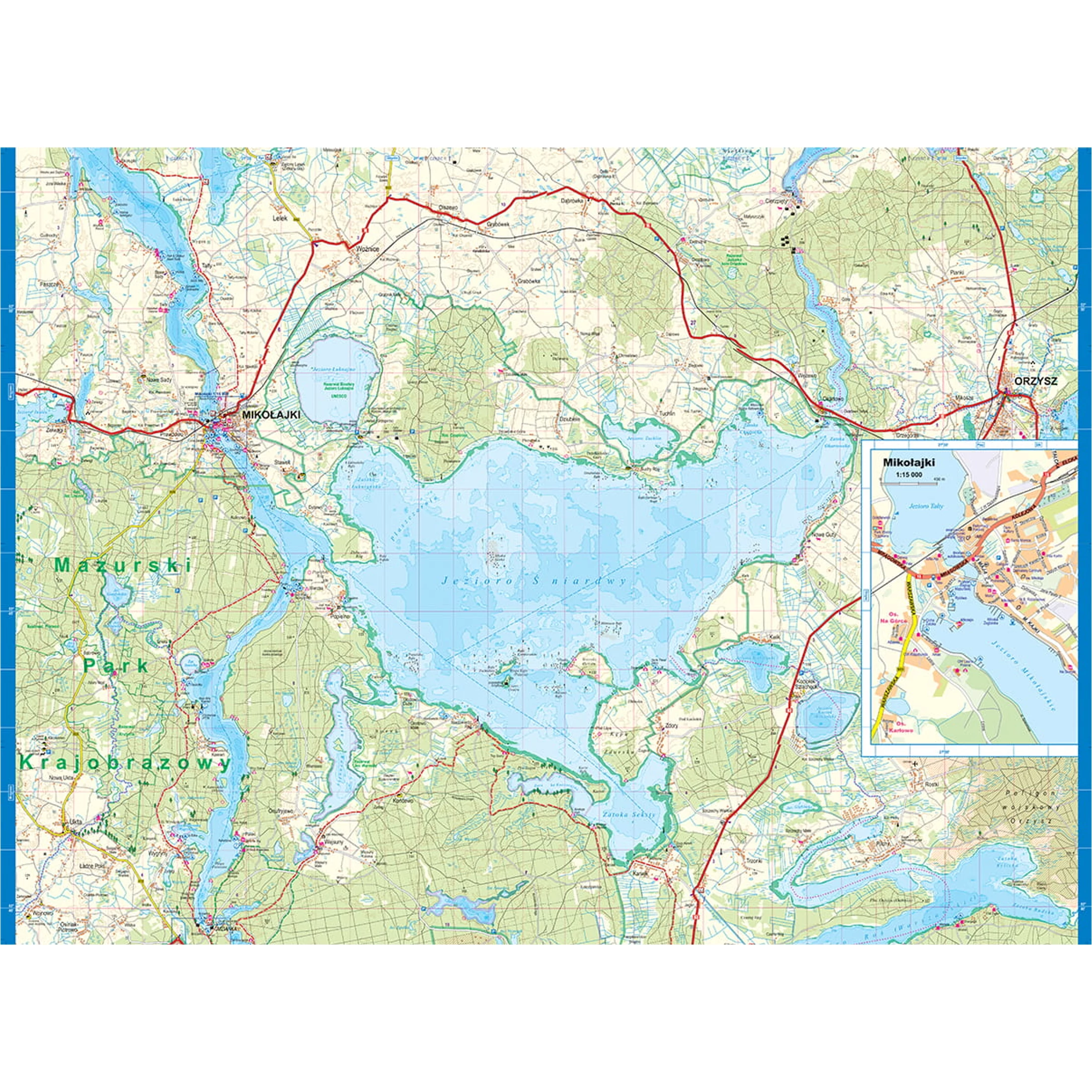 Tartalmazza Węgorzewo, Giżycko, Pisz, Mikołajki, Ruciane-Nida és Ryn 1:15 000 méretarányú térképeit.