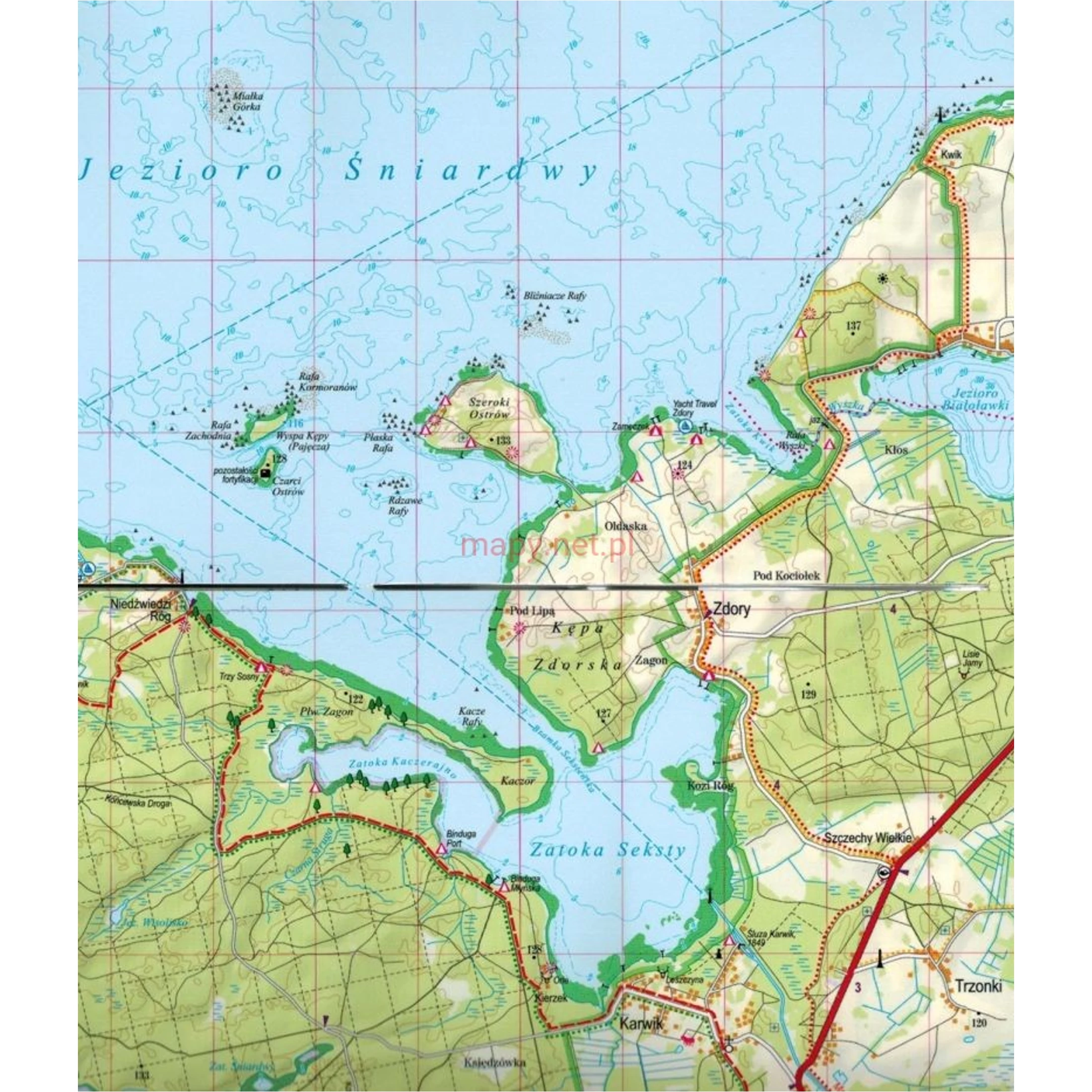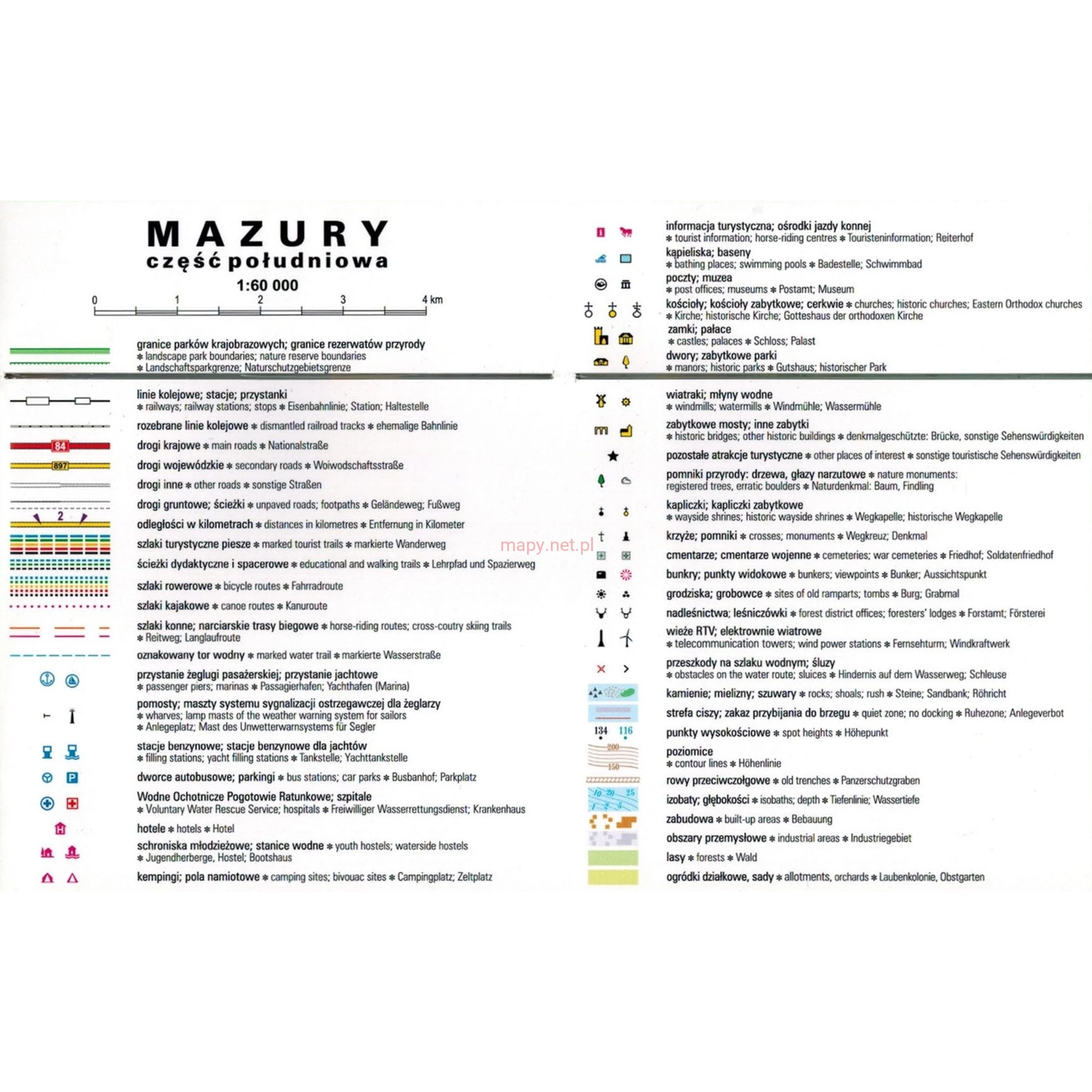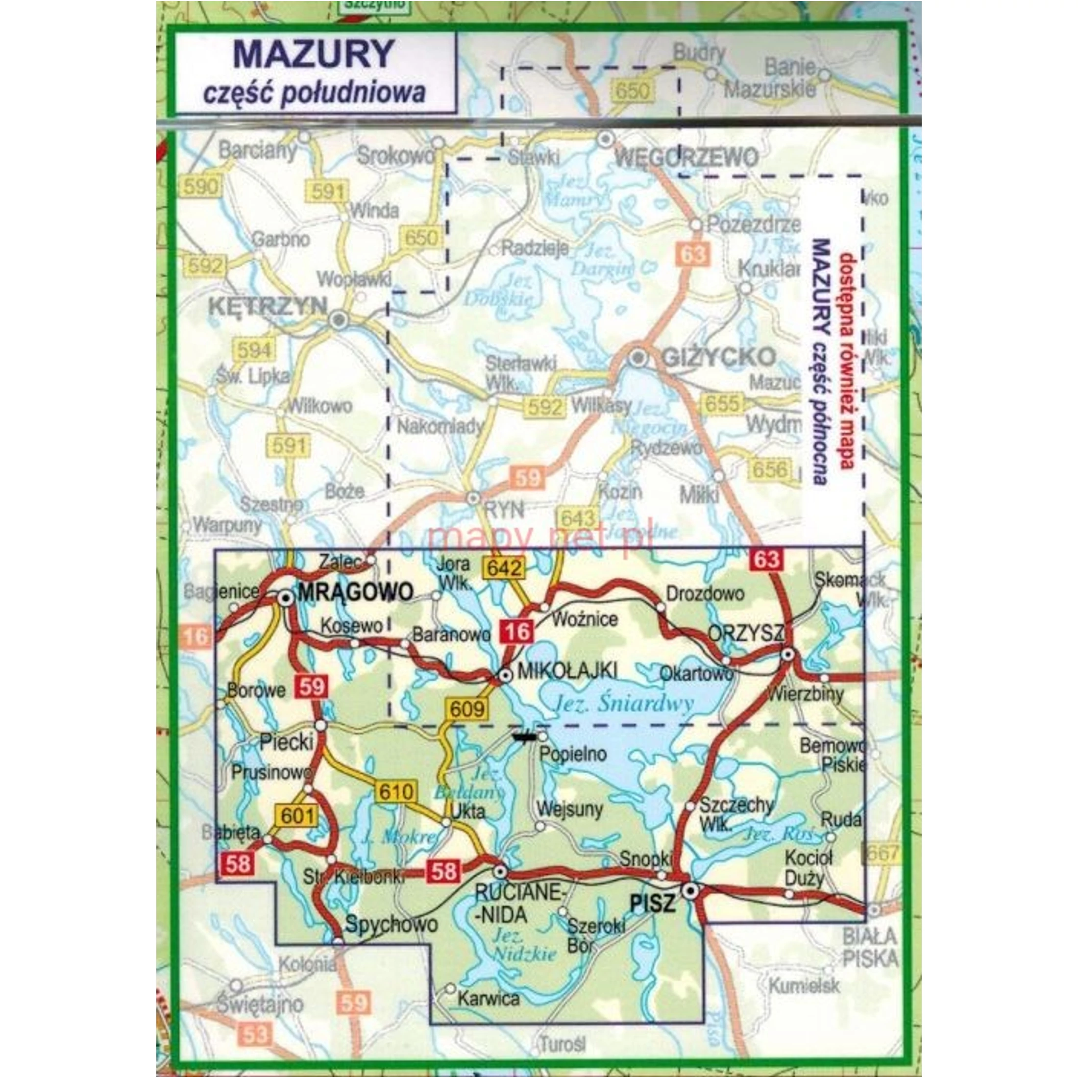 A Mazuri tavak turisztikai térképe az északi Mragowótól a déli Piszig és a Nidzkie-tóig terjedő területeket ábrázolja.