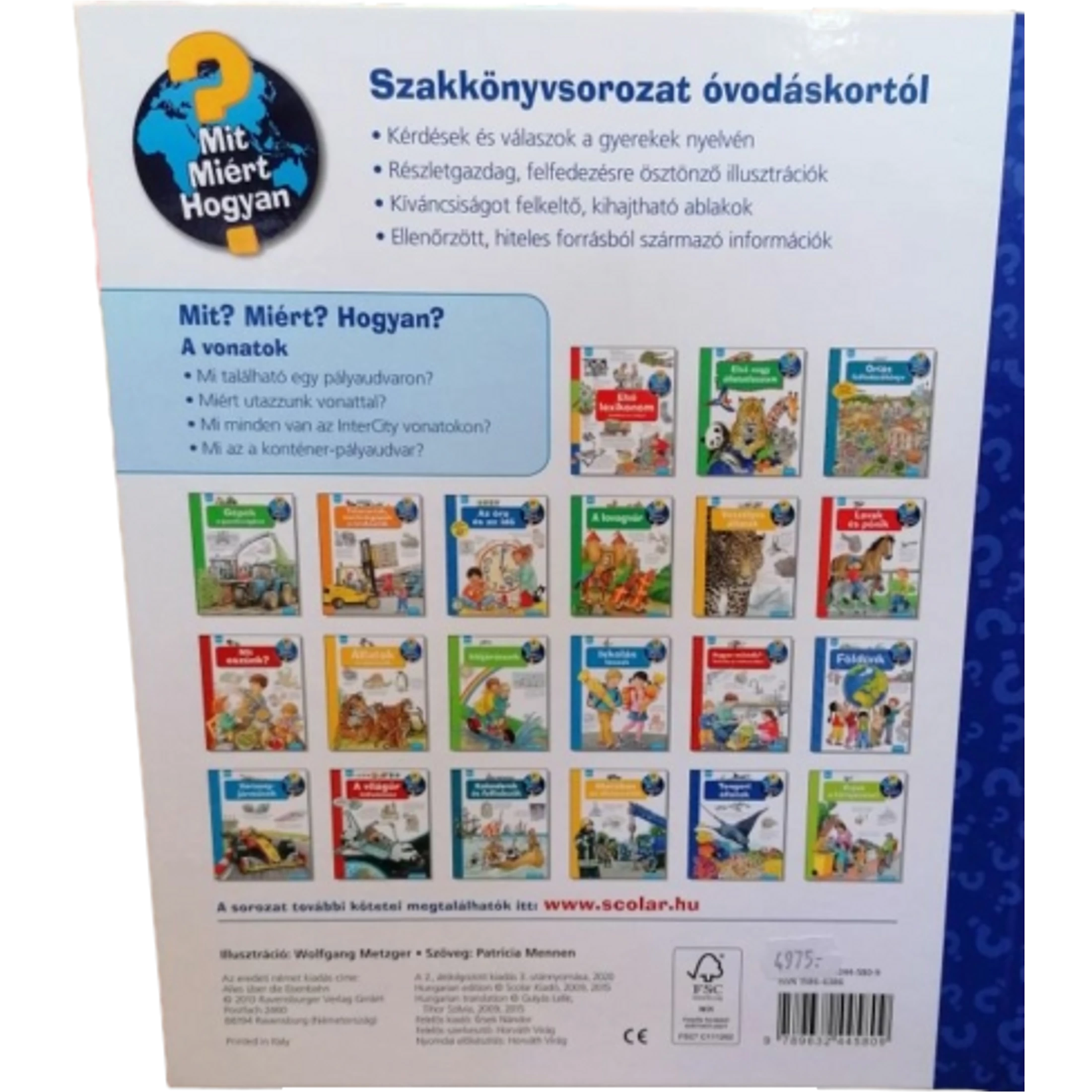 A Ravensburger népszerű Mit? Miért? Hogyan? gyermekkönyvsorozatának 17. kötetét lapozgatva a vasúti közlekedéssel, a különféle vonattípusokkal és a vasútállomások működésével ismerkedhetnek az óvodások és a kisiskolások. Az InterCityről éppúgy olvashatnak, mint a függővasútról, a mágnesvasútról vagy az olyan nagysebességű vonatokról, mint a világhírű francia TGV. Azt is megtudhatják, hányféle módon lehet vonatjegyet vásárolni, ki irányítja a vonatforgalmat, mi az a konténer-pályaudvar, lehet-e autóval vonaton utazni.