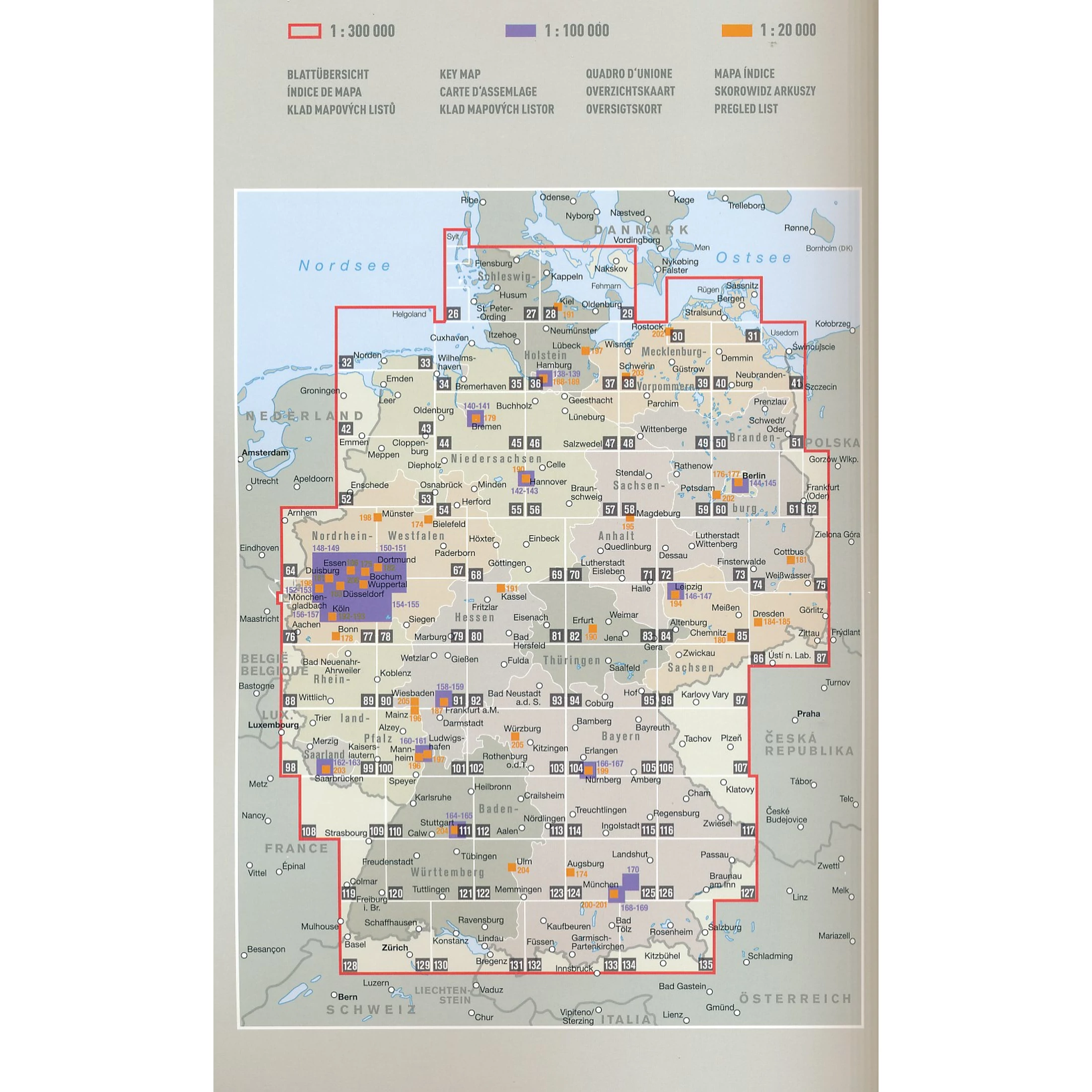 • 44 várostérkép, 1:20 000-es méretben: Aachen, Augsburg, Berlin, Bielefeld, Bonn, Braunschweig, Bréma, Chemnitz, Dortmund, Drezda, Duisburg/Essen, Düsseldorf, Erfurt, Frankfurt am Main, Freiburg im Breisgau, Göttingen, Hamburg, Hannover, Karlsruhe, Kassel, Kiel, Koblenz, Köln, Lipcse, Lübeck, Magdeburg, Mainz, Mannheim/Ludwighafen am Rhein, München, Münster, Nürnberg, Osnabrück, Paderborn, Potsdam, Regensburg, Rostock, Saarbrücken, Schwerin, Stuttgart, Trier, Ulm, Weimar, Wiesbaden, Würzburg,