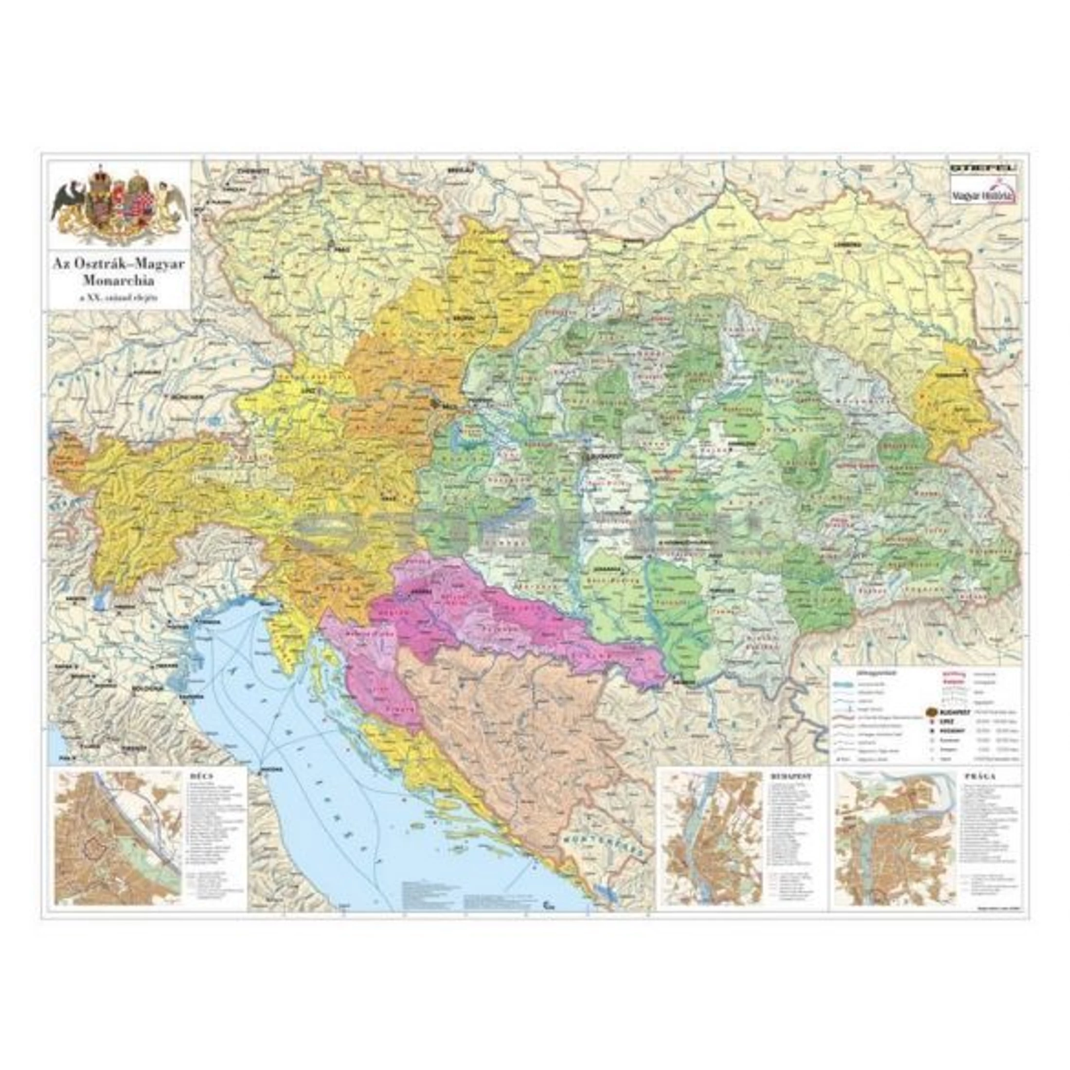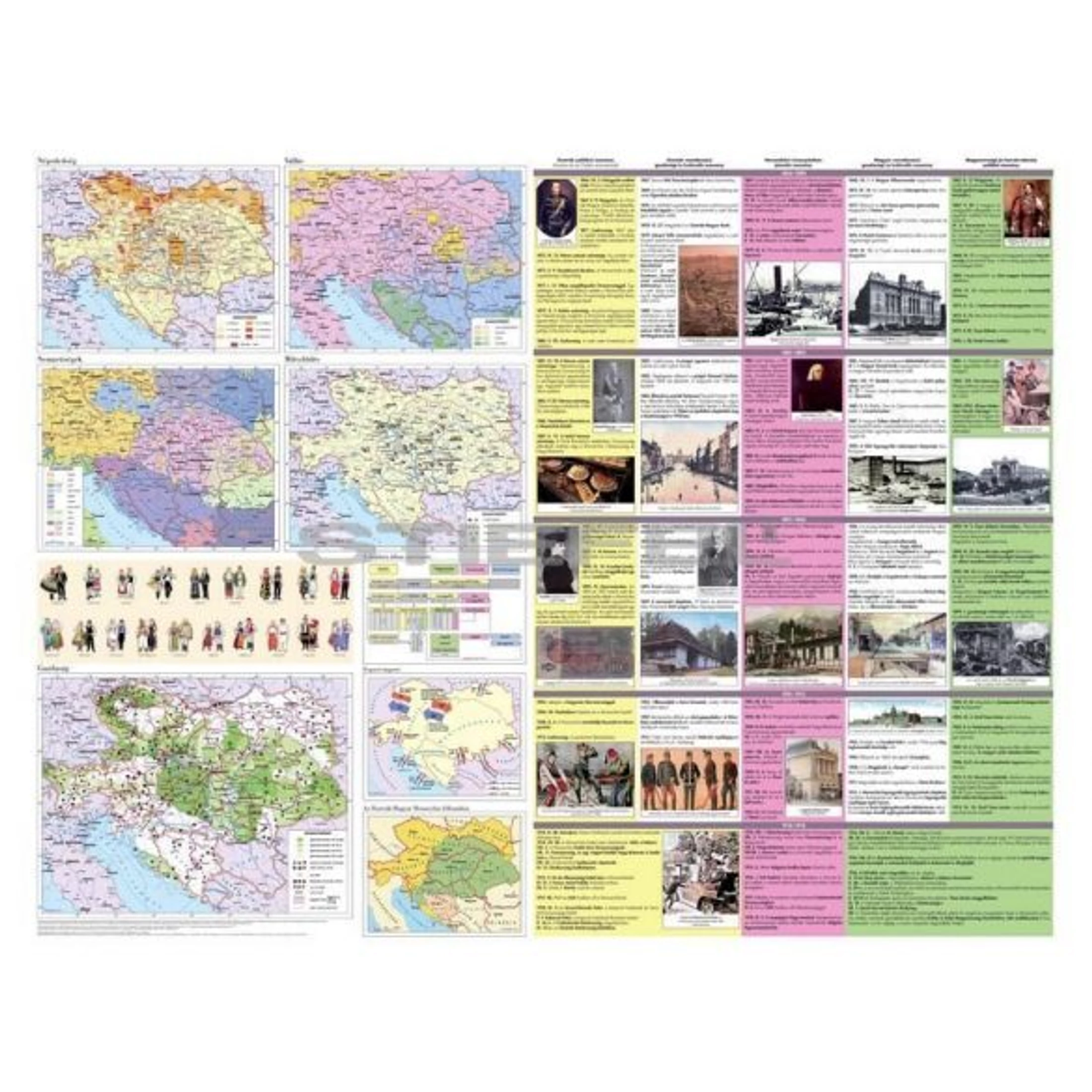 Az Osztrák-Magyar Monarchiát bemutató térkép szemlélteti a gazdaság, a vallás, a népsűrűség és a nemzetiségek helyzetét az 1867-1918 között fennállt dualista államban.