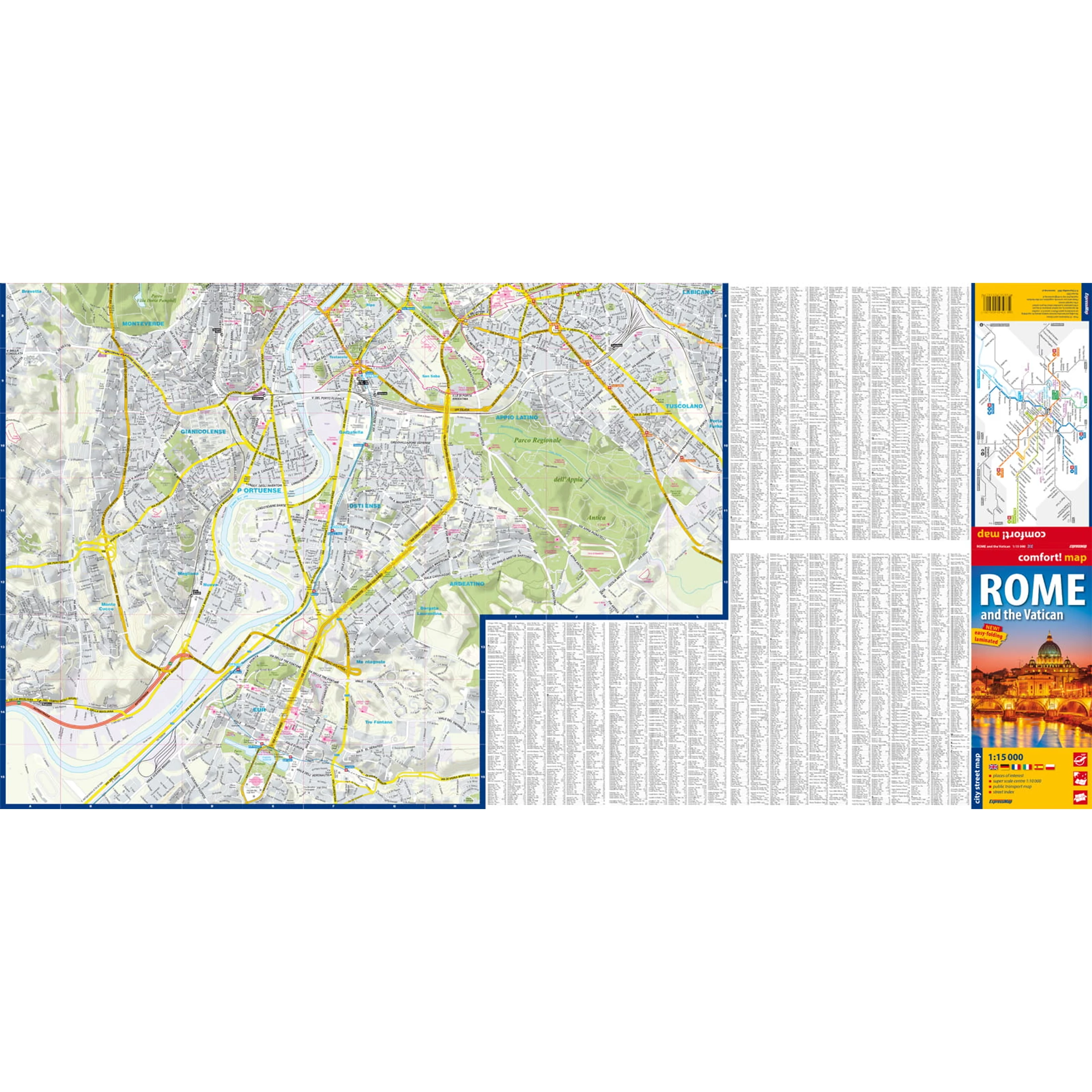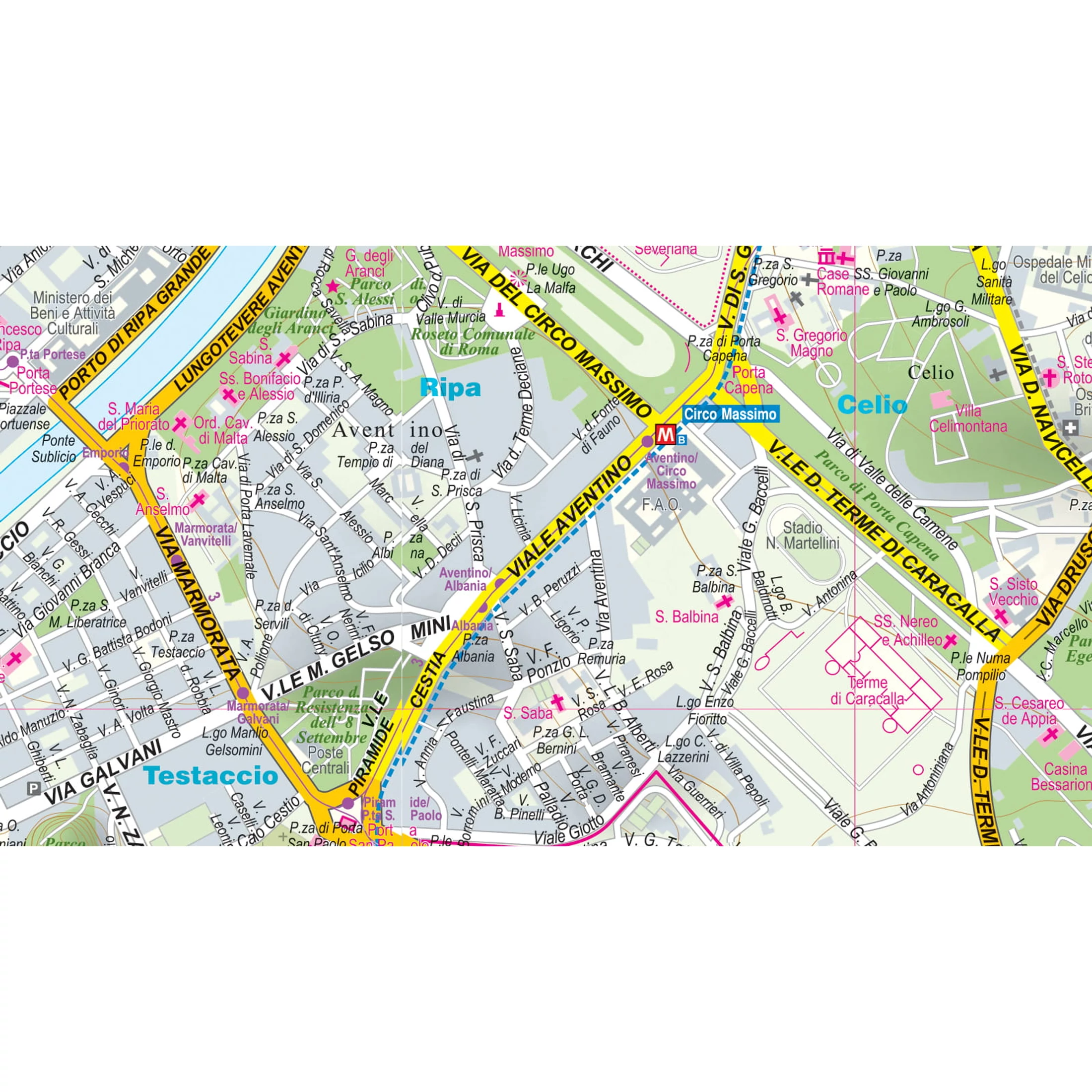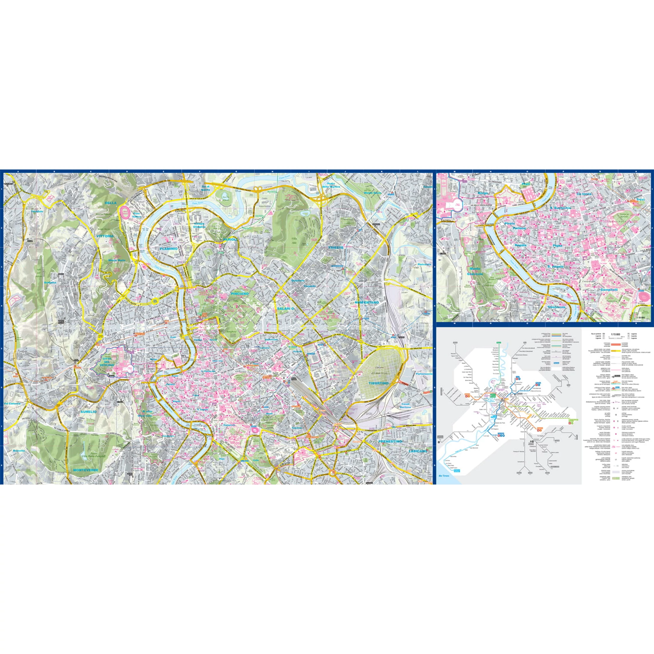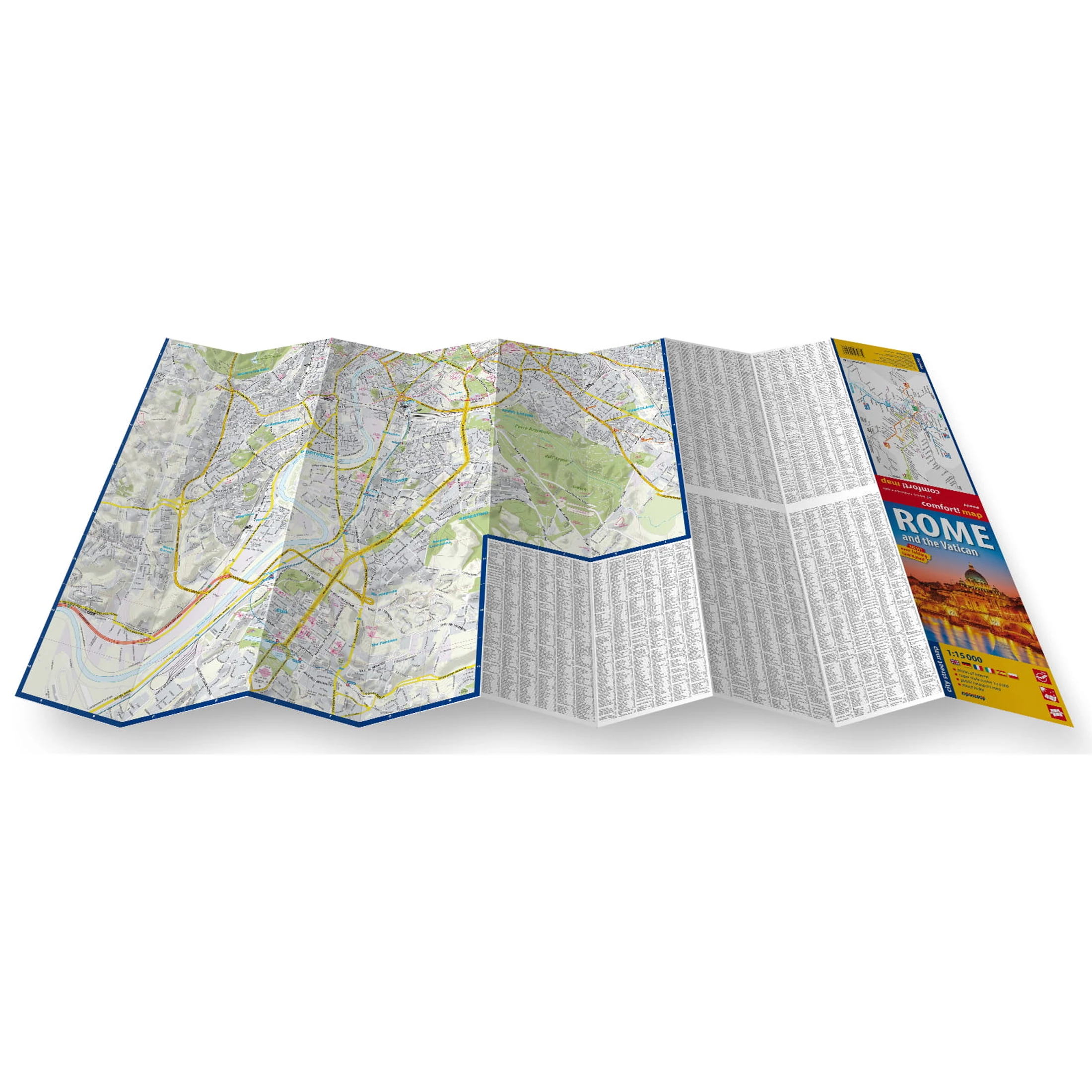 A Forum Romanum ókori műemlékei, a filmekből híressé vált Trevi-kút és a pompás bazilikák. Róma turisztikailag érdekes központi kerületeinek kétoldalas laminált, kényelmesen összehajtható 1:15 000 méretarányű térképe segít felfedezni az Örök Város szépségeit.