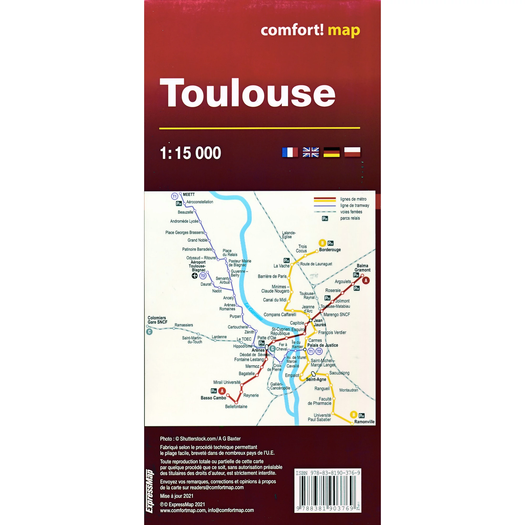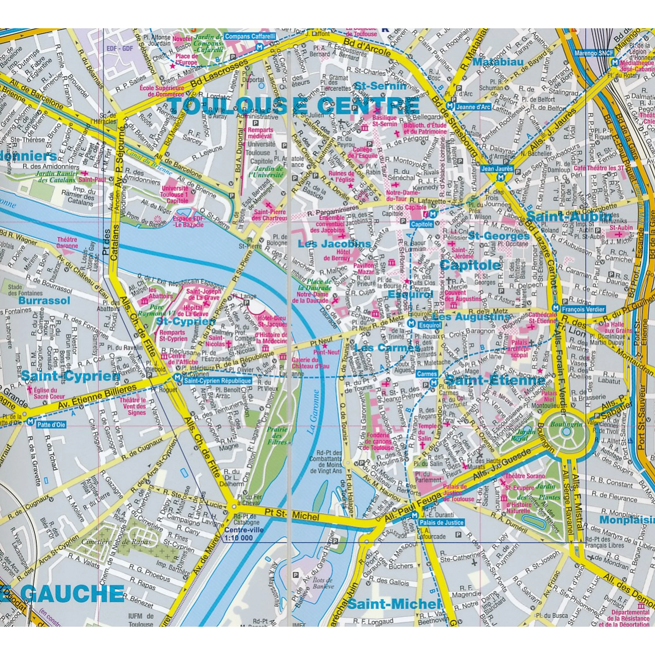 Toulouse nagyon praktikus várostérképe, amely nemcsak a központot, hanem a külvárosok nagy részét is bemutatja. Erőssége abban rejlik, hogy ez a térkép szakaszosan laminált, és ezért - a műanyag réteg ellenére - könnyen hajtogatható.