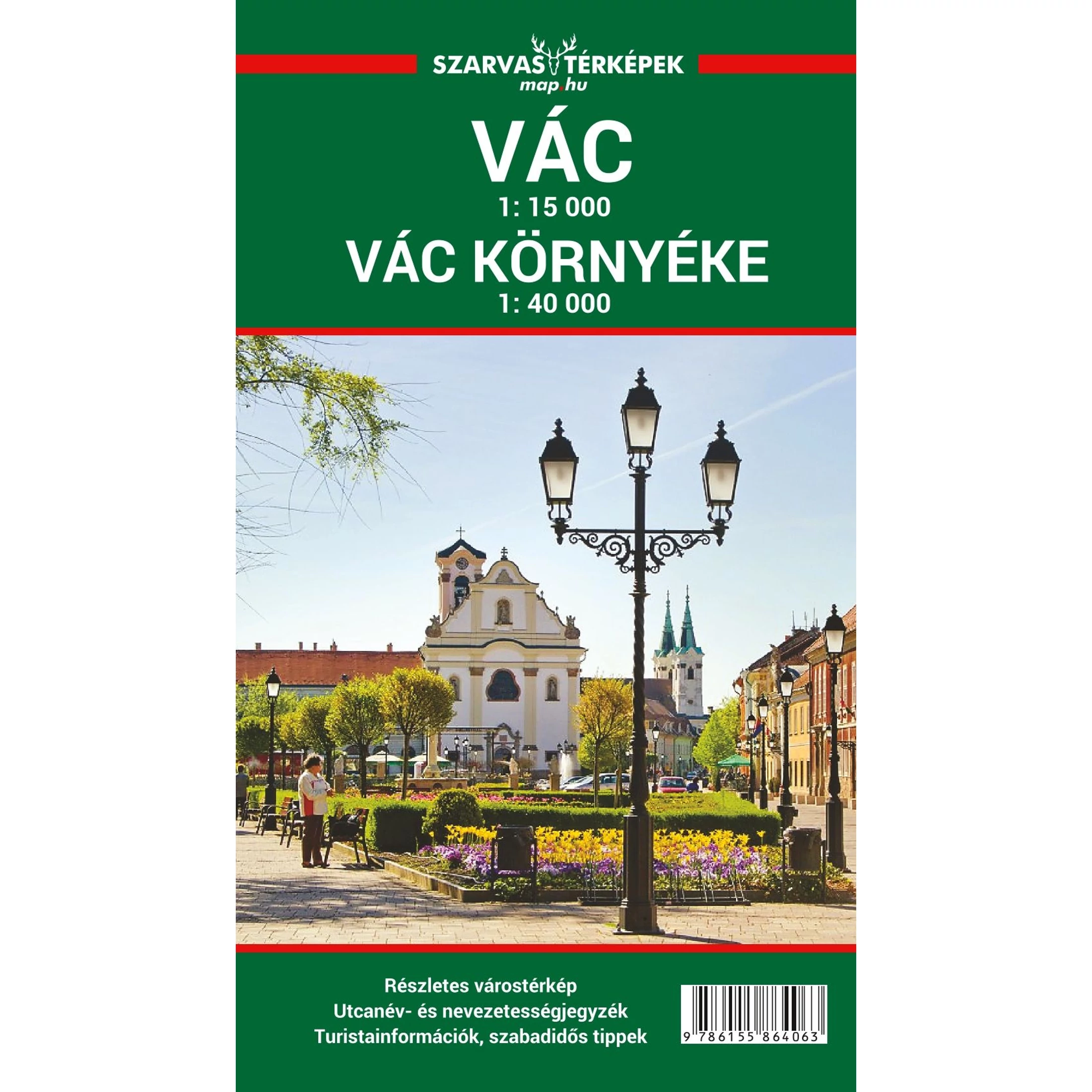 Vác várostérképe nevezetességjegyzékkel, utca jegyzékkel.  Az 1:15 000 méretarányú főtérképet a belváros még részletesebb térképkivágata (1:7 500), illetve a hátoldalon egy a város tágabb környékét bemutató turistatérkép egészíti ki (1:40 000).