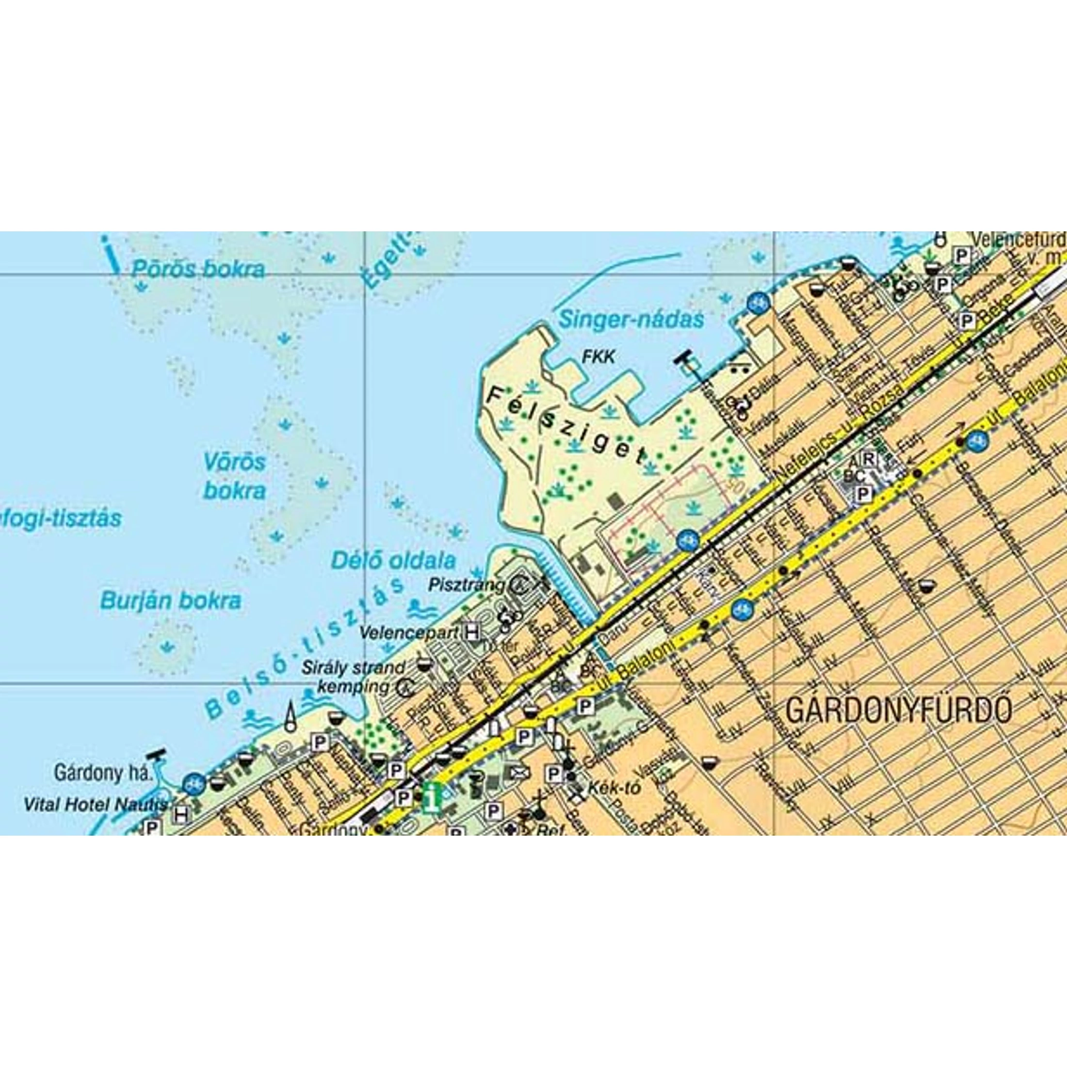 Feltünteti a jelzett turistaútvonalak mellett a kerékpáros túraútvonalakat és kerékpárutakat valamint a Velencei-tó hajójáratait is.