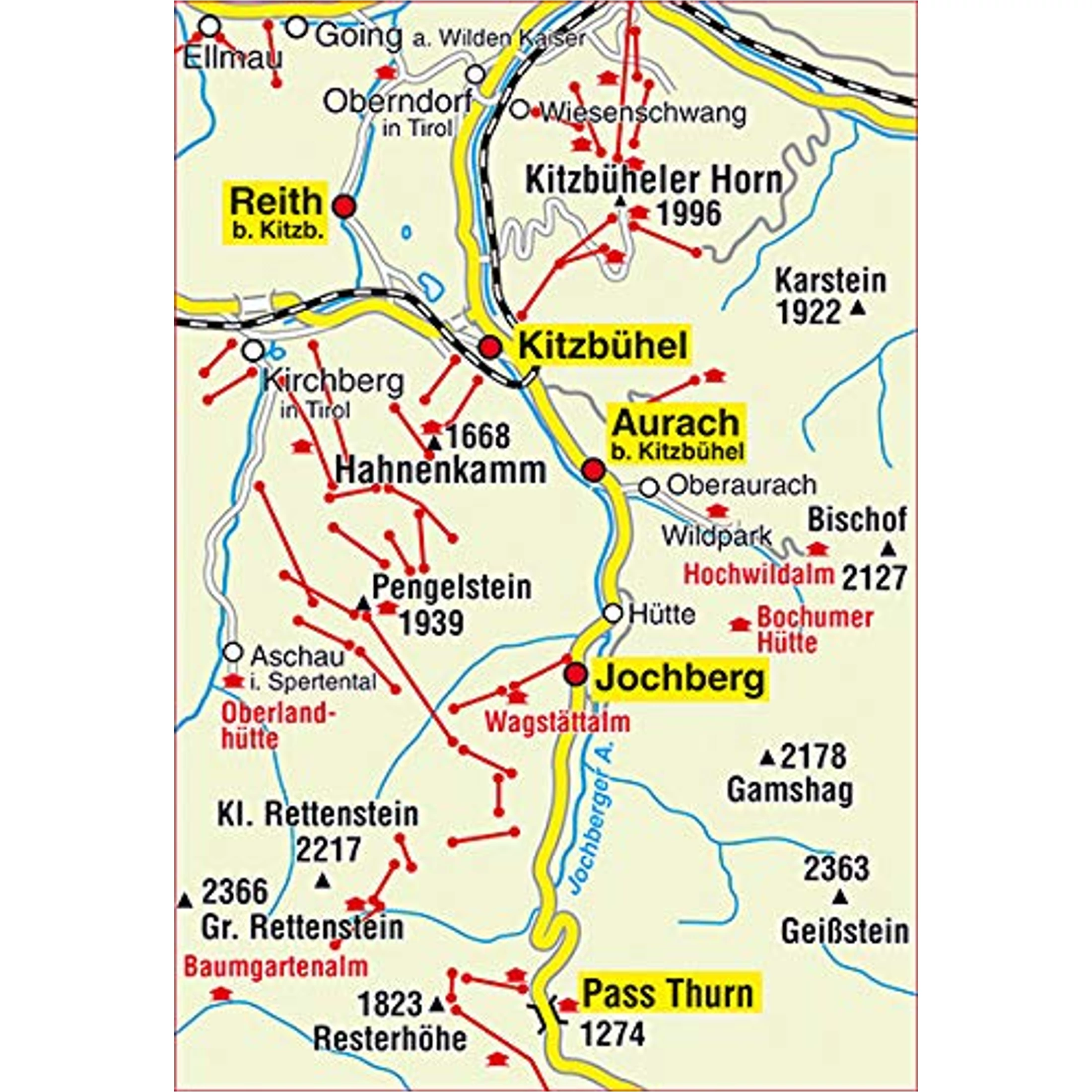 Helyek/hegyek/tavak: Kitzbüheler Horn, Kitzbühel, Hahnenkamm, Ellmau, Aurach, Pass Thurn, Geißstein, Großer Rettenstein, Jochberg, Kleiner Rettenstein, Reith bei Kitzbühel, Oberndorf in Tirol
